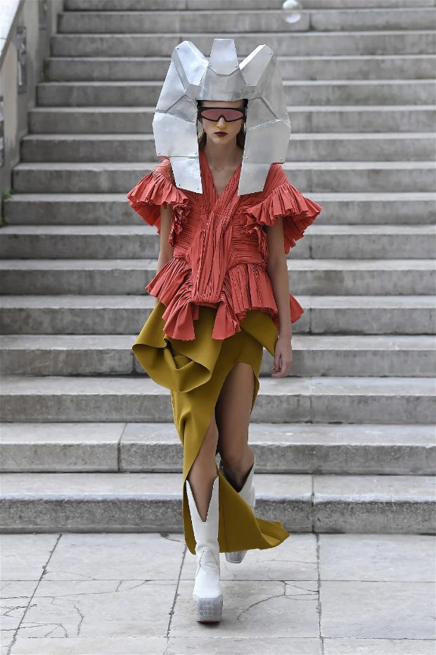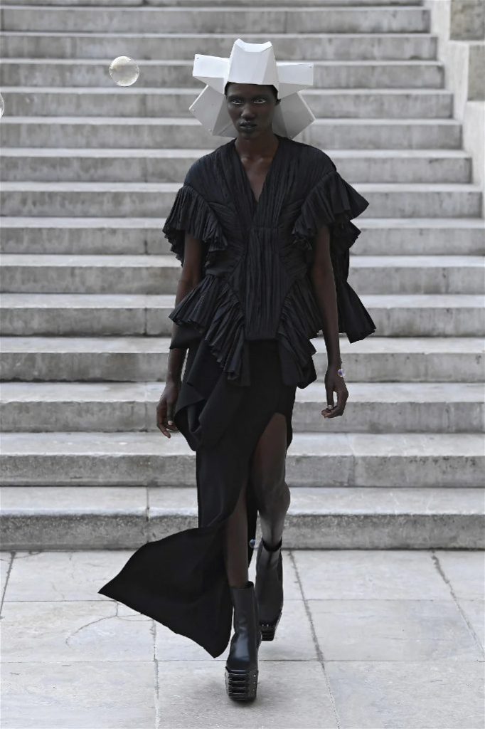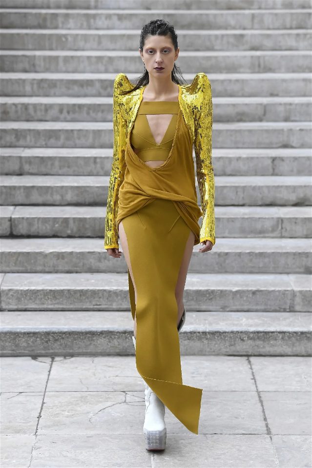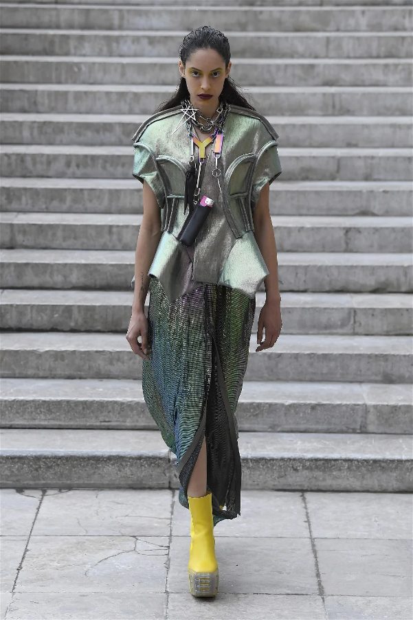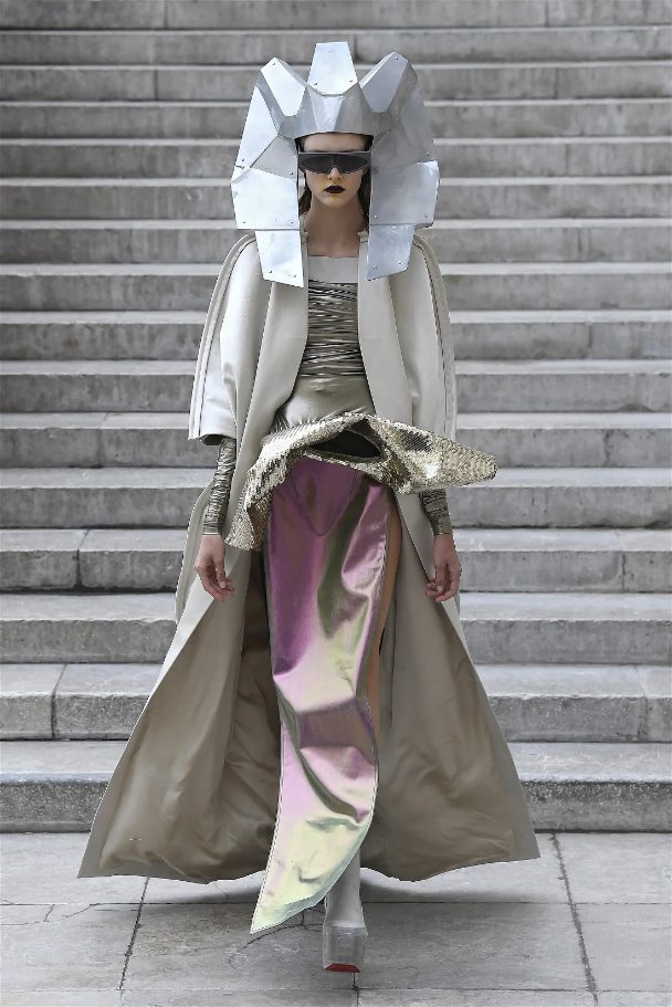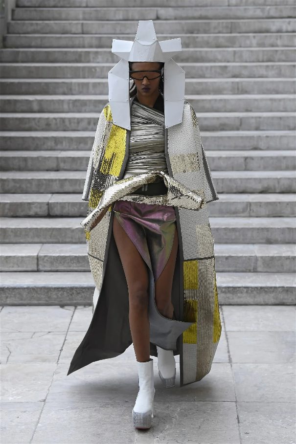 Known for his unconventional style, Rick Owens presented designs that felt both dramatic and inviting. The collection featured vibrant hues like hot pink, gold, and ruby red, alongside iridescent materials that shimmered under the runway lights, creating an almost ethereal effect.
