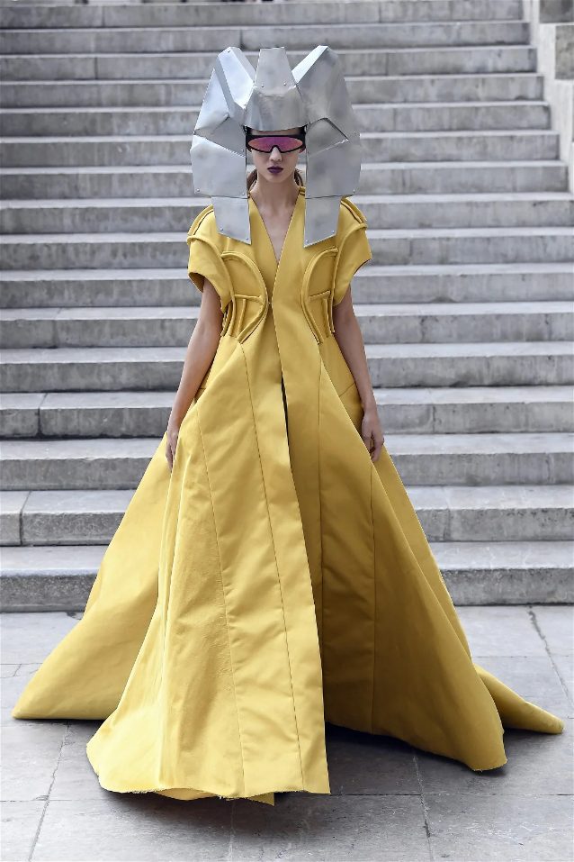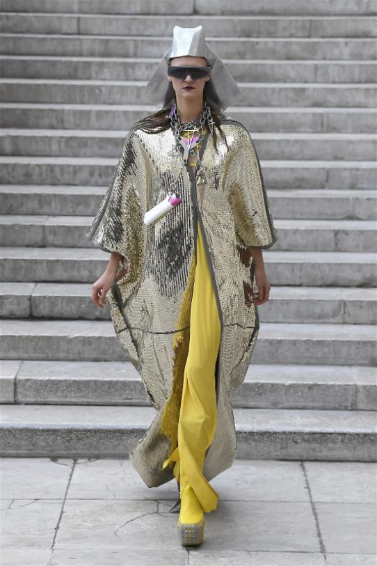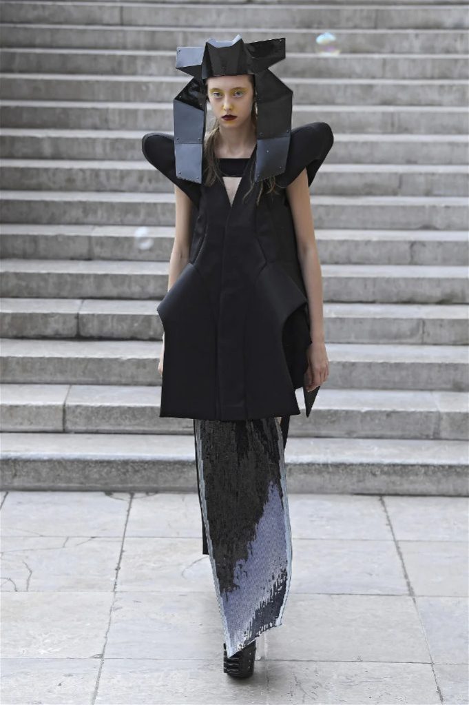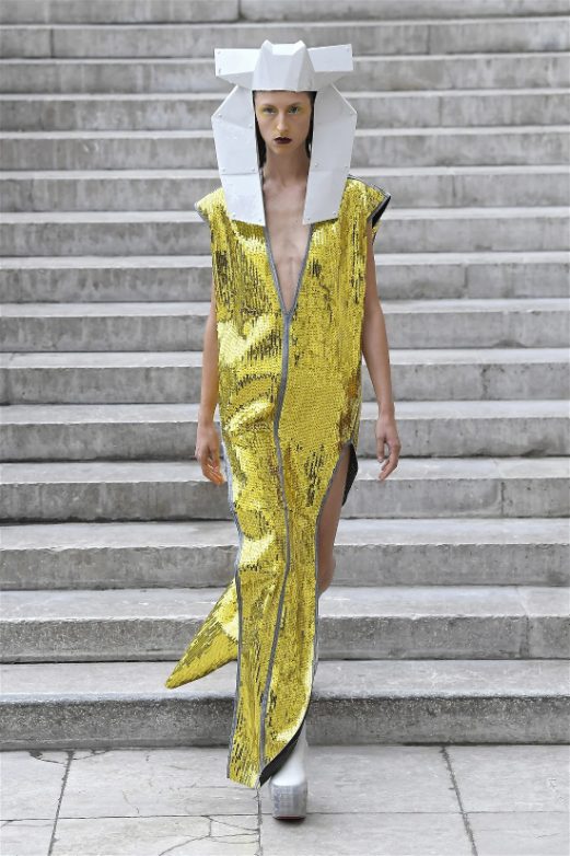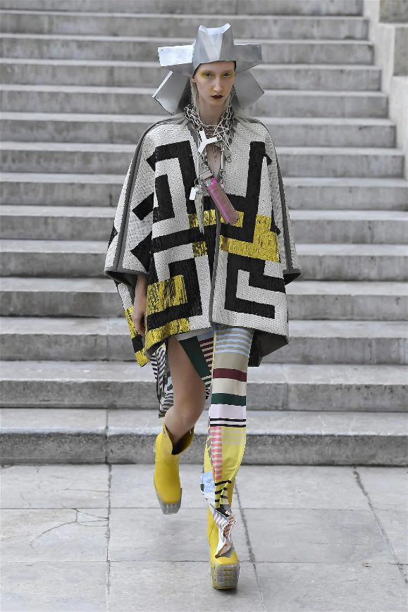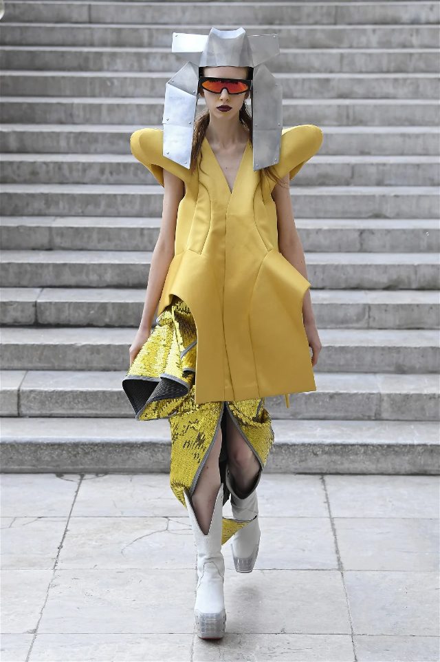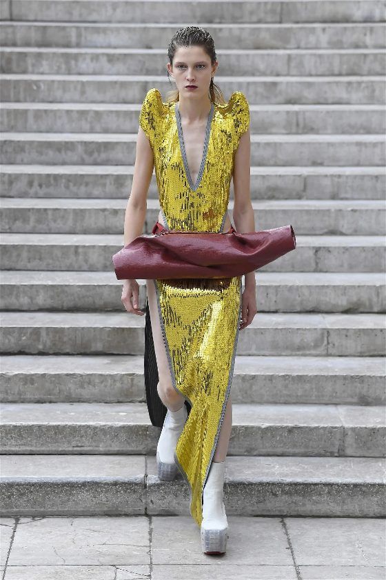 Known for his unconventional style, Rick Owens presented designs that felt both dramatic and inviting. The collection featured vibrant hues like hot pink, gold, and ruby red, alongside iridescent materials that shimmered under the runway lights, creating an almost ethereal effect.