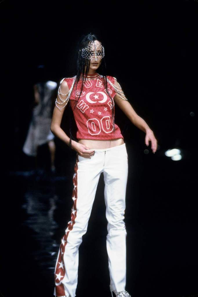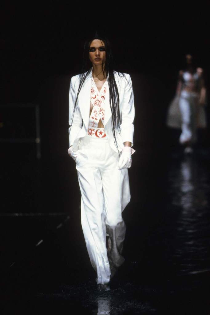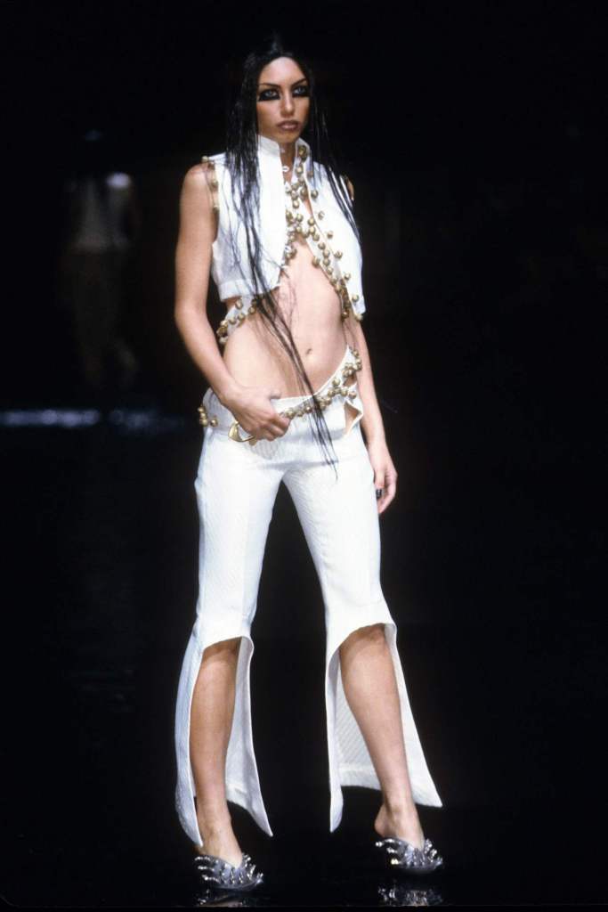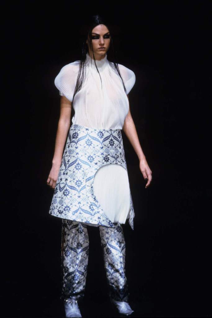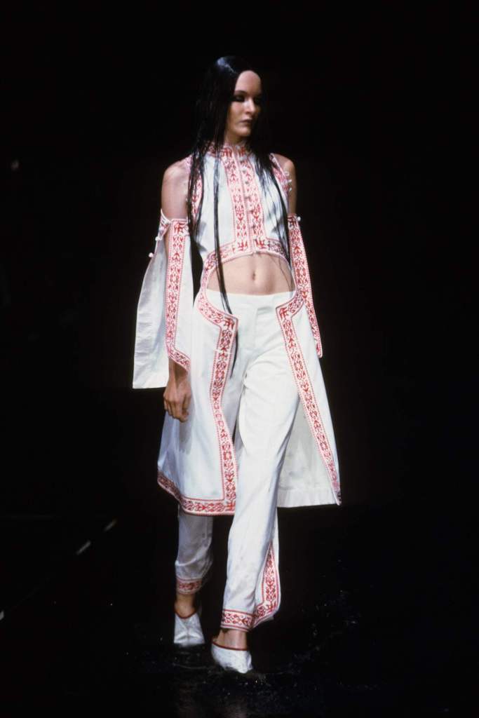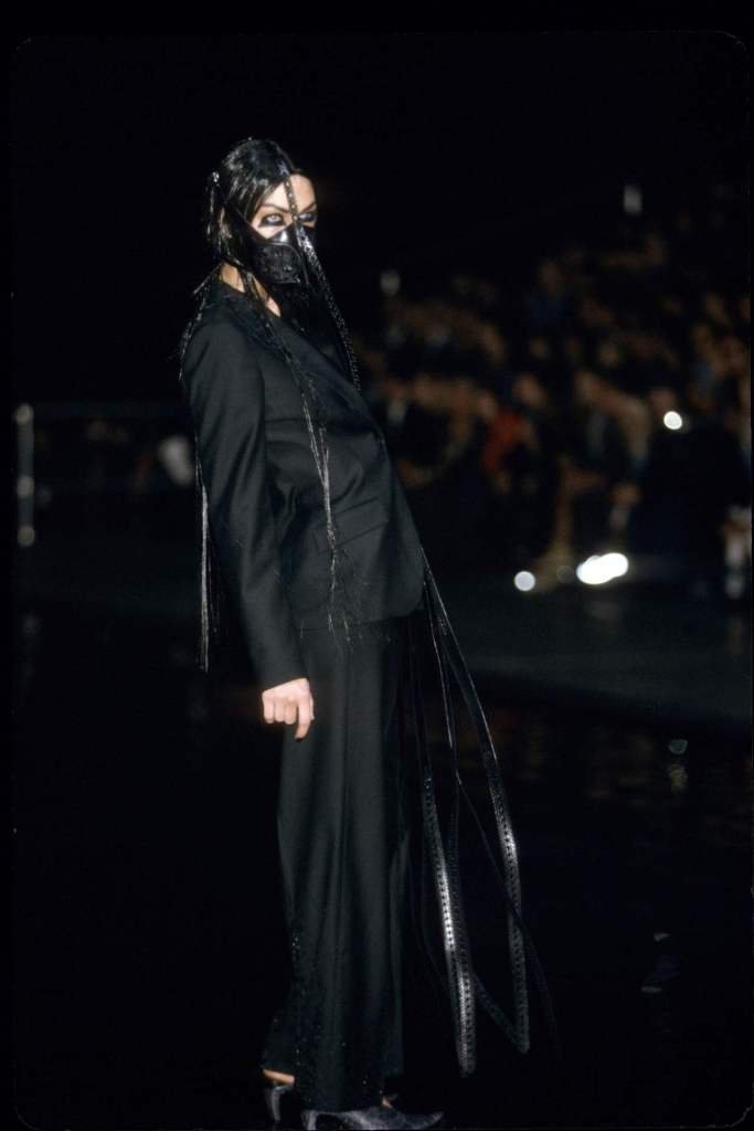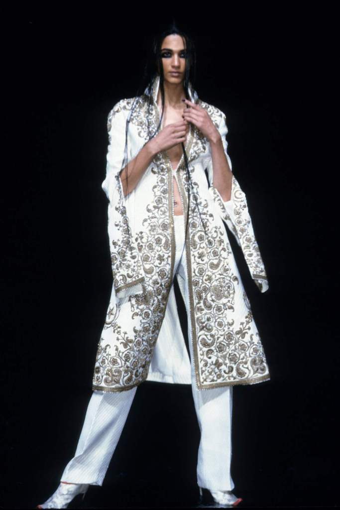 The clothing was as complex as the themes it explored.The collection showcased McQueen’s exceptional tailoring and ability to reinterpret classic garments. Traditional Middle Eastern attire, such as the burqa, yashmak, and harem pants, was given a modern twist. Harem pants were reimagined with fitted ankles and paired with sharp frock coats, while Islamic veils inspired intricate face coverings. The standout chainmail yashmak, designed by Shaun Leane, epitomized McQueen’s knack for dramatic yet wearable artistry—it shimmered with aluminum plates and Swarovski crystals, making it both delicate and powerful.