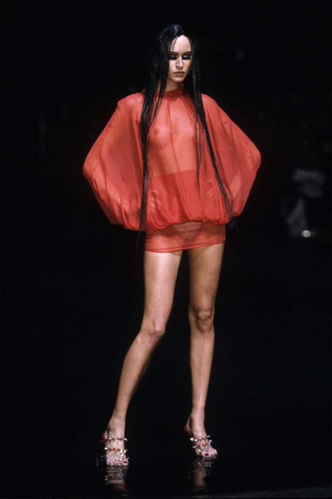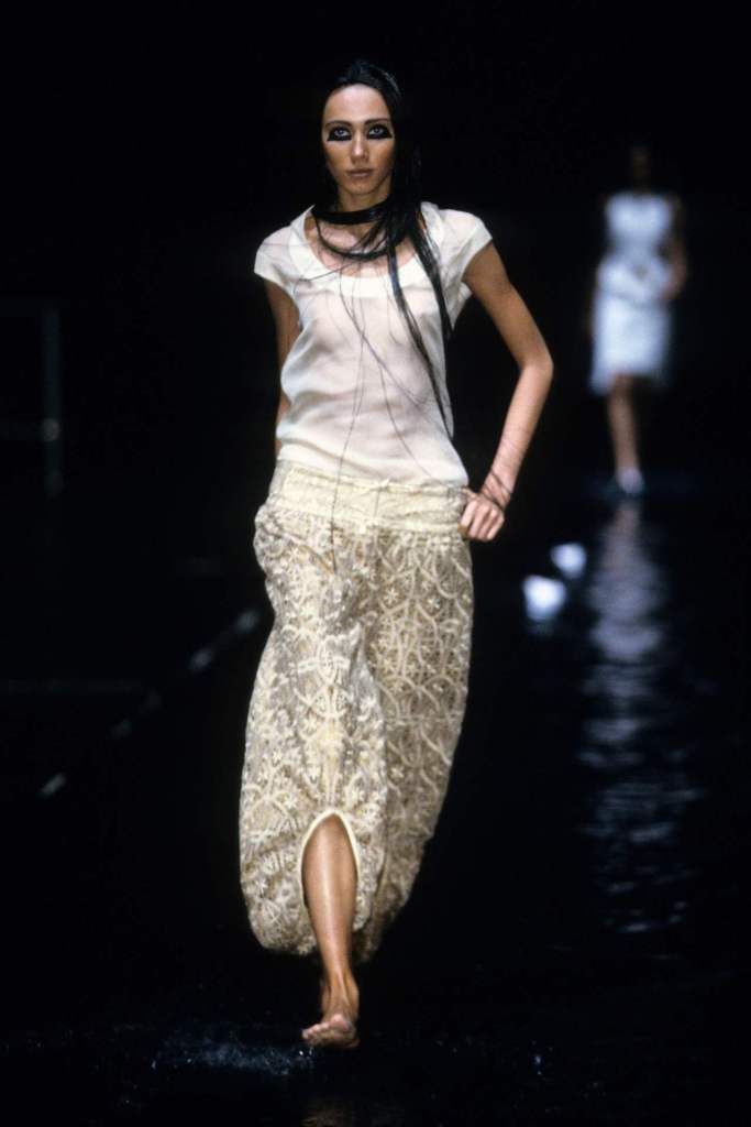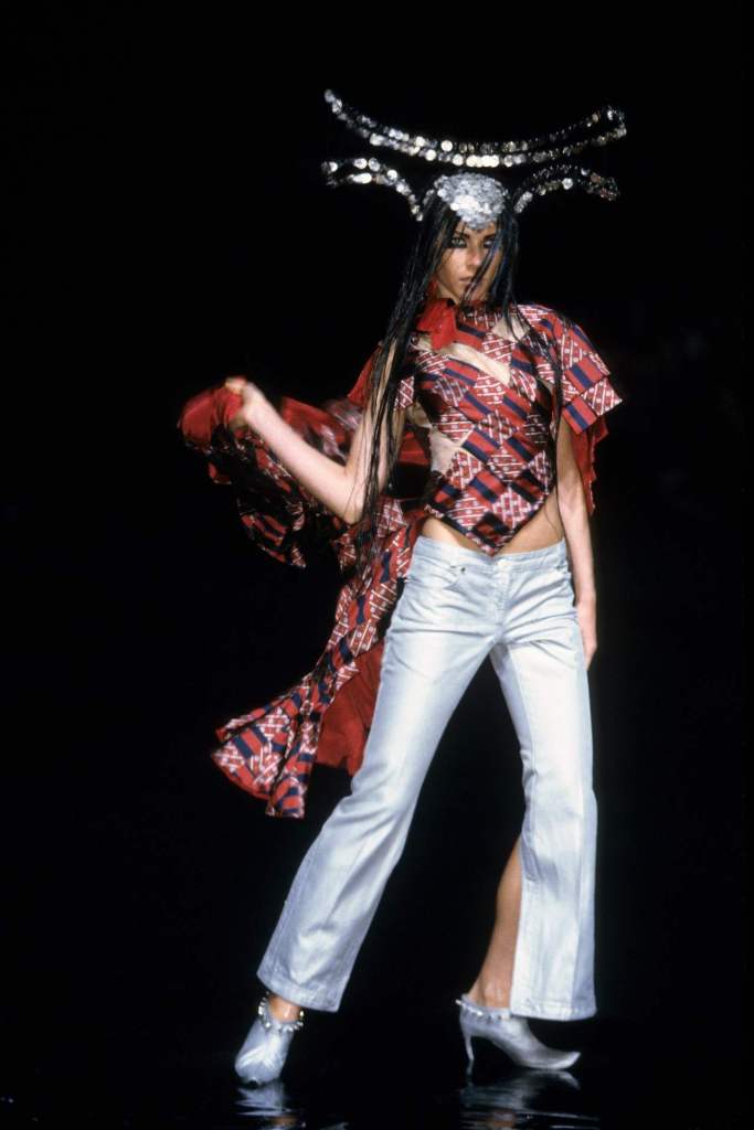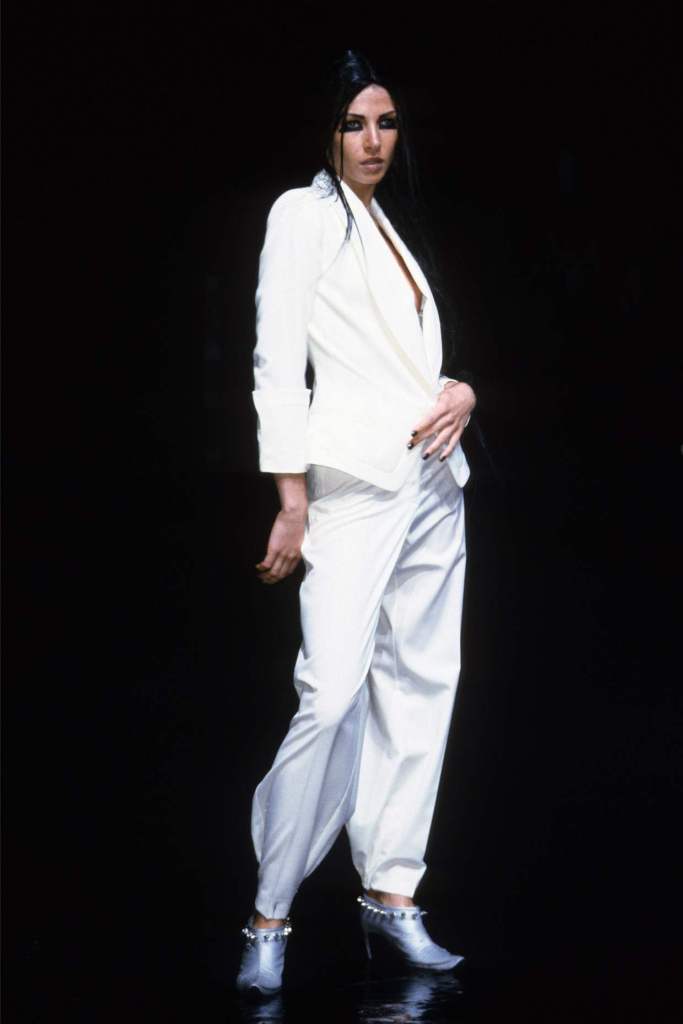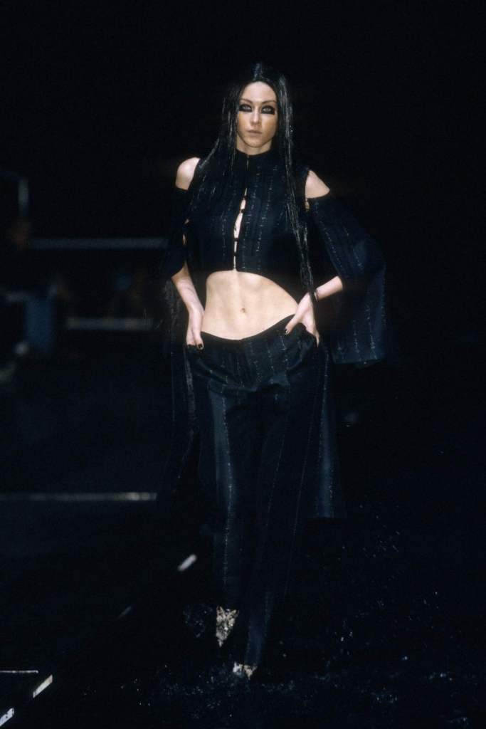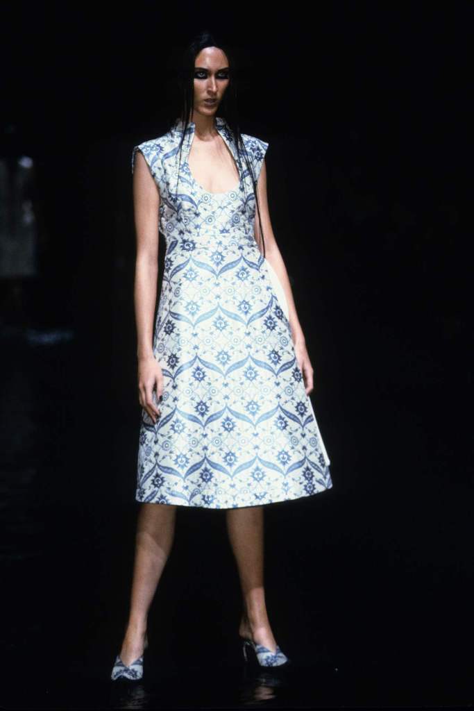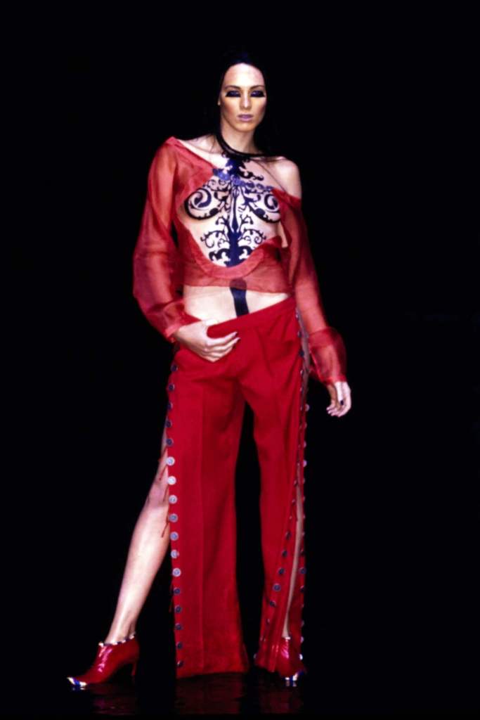 The clothing was as complex as the themes it explored.The collection showcased McQueen’s exceptional tailoring and ability to reinterpret classic garments. Traditional Middle Eastern attire, such as the burqa, yashmak, and harem pants, was given a modern twist. Harem pants were reimagined with fitted ankles and paired with sharp frock coats, while Islamic veils inspired intricate face coverings. The standout chainmail yashmak, designed by Shaun Leane, epitomized McQueen’s knack for dramatic yet wearable artistry—it shimmered with aluminum plates and Swarovski crystals, making it both delicate and powerful.