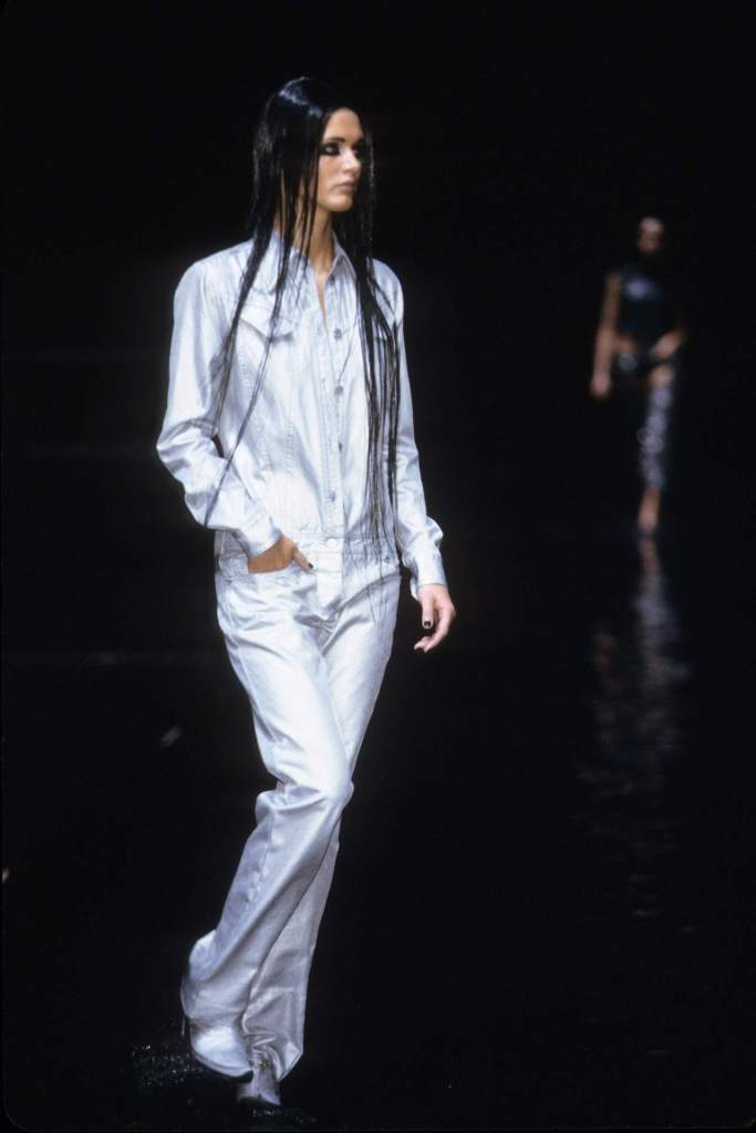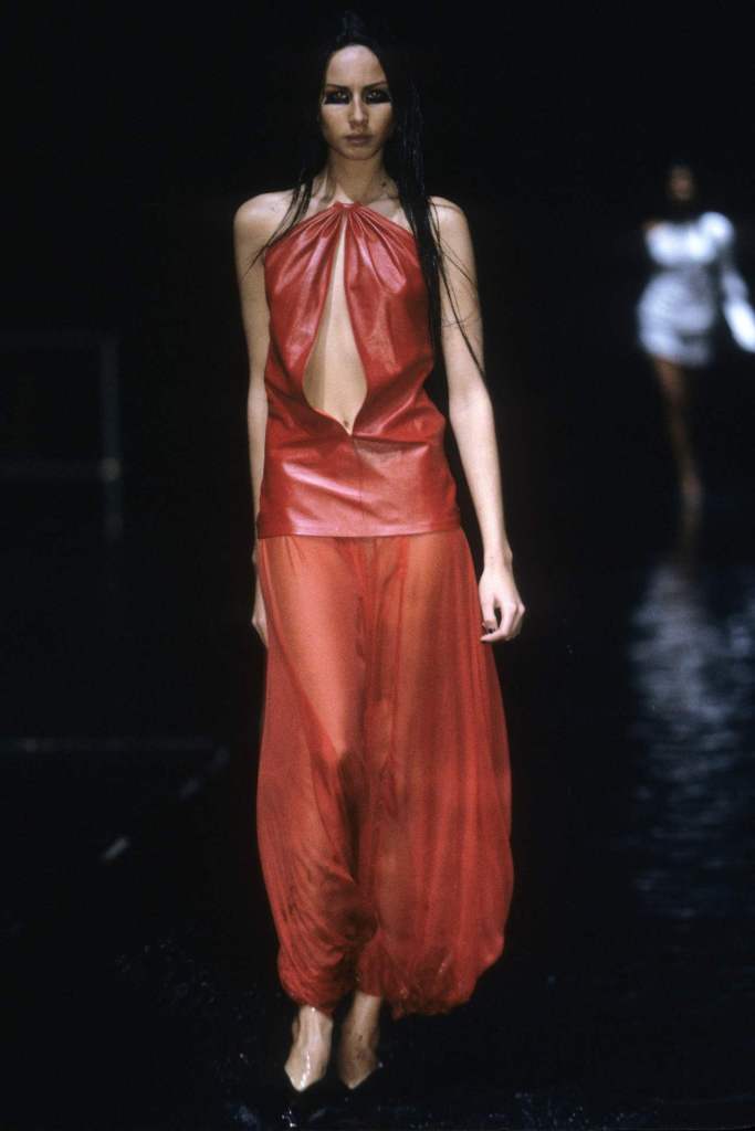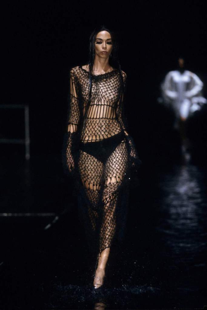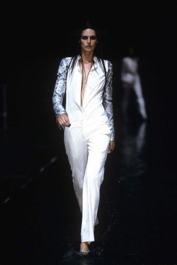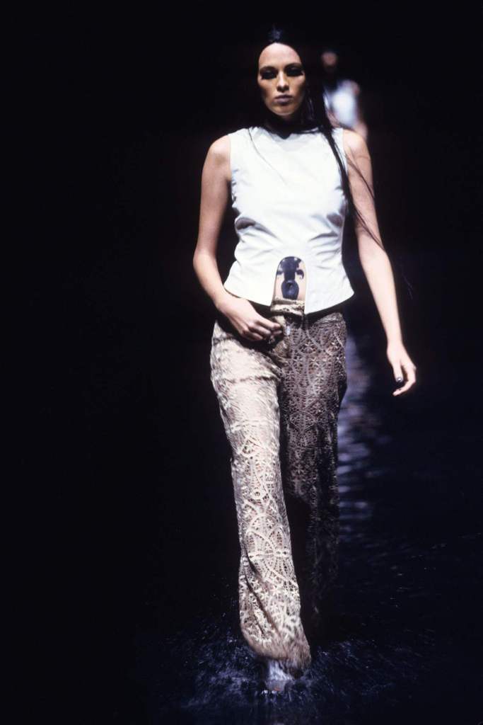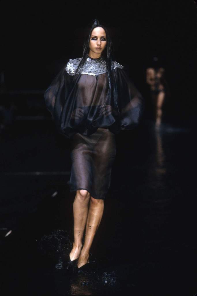 The runway, flooded with several inches of black-dyed water to evoke crude oil, set the stage for a powerful commentary on the intersection of Middle Eastern culture and Western influence. True to McQueen’s penchant for blending art and controversy, the collection balanced aggression, beauty, and rebellion.