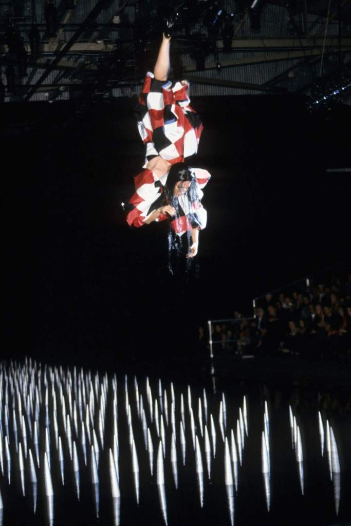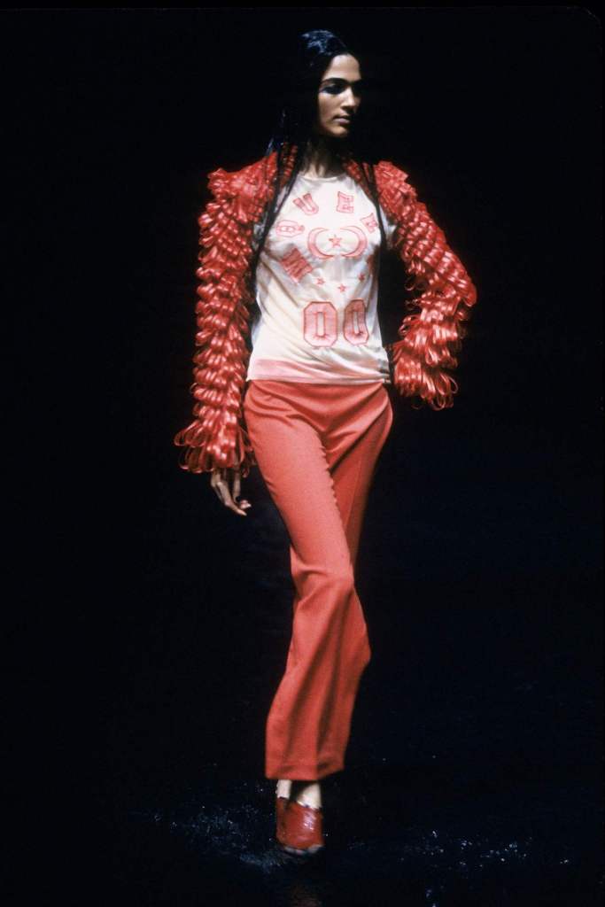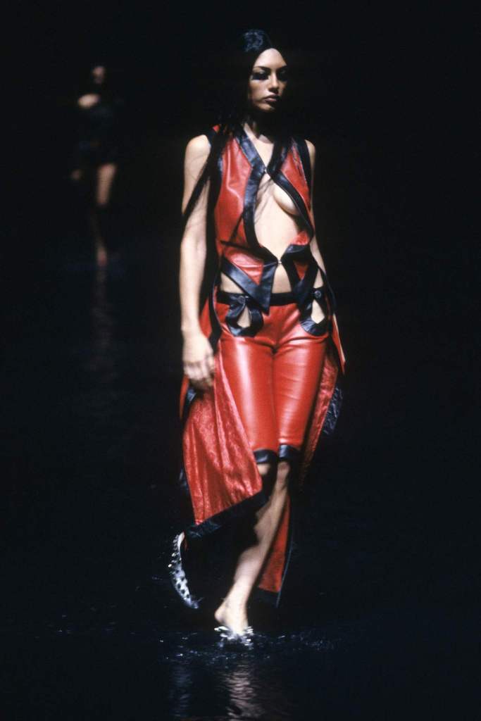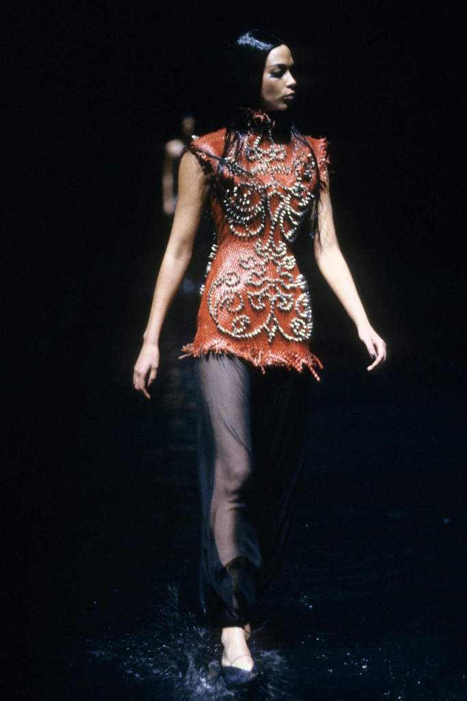Sportswear elements added an unexpected edge. Boxing shorts adorned with faux-Arabic script, football jerseys with crescent moons, and leather harnesses gave the collection an urban, athletic feel. Tailored suits with embroidered details and draped dresses in lightweight jersey highlighted McQueen’s versatility. The palette of deep black, vibrant red, and metallics was striking, with brocade fabrics, leather embroidery, and metallic paillettes enhancing the richness. Accessories played a key role, from coin-studded headdresses to body-conscious silhouettes accented with bells and ribbons. A bed of nails rising from the water highlighted the danger and struggle faced by women fighting for freedom.