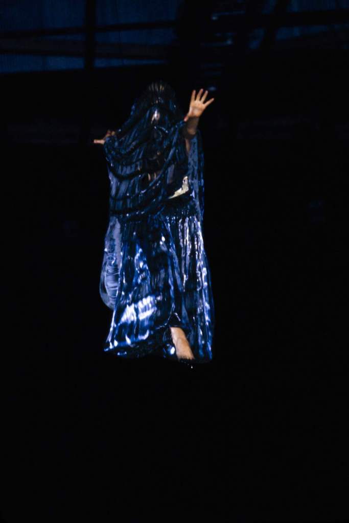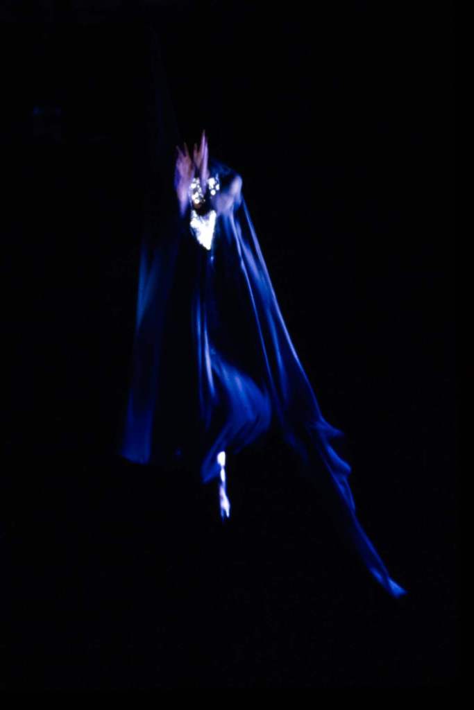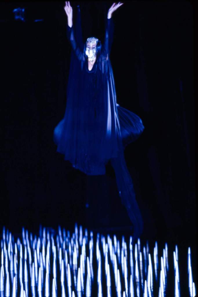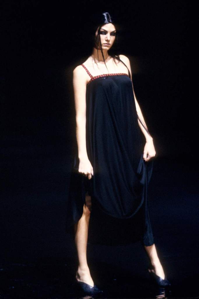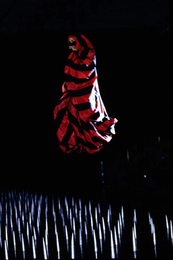 Sportswear elements added an unexpected edge. Boxing shorts adorned with faux-Arabic script, football jerseys with crescent moons, and leather harnesses gave the collection an urban, athletic feel. Tailored suits with embroidered details and draped dresses in lightweight jersey highlighted McQueen’s versatility. The palette of deep black, vibrant red, and metallics was striking, with brocade fabrics, leather embroidery, and metallic paillettes enhancing the richness. Accessories played a key role, from coin-studded headdresses to body-conscious silhouettes accented with bells and ribbons. A bed of nails rising from the water highlighted the danger and struggle faced by women fighting for freedom.