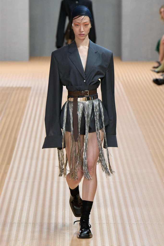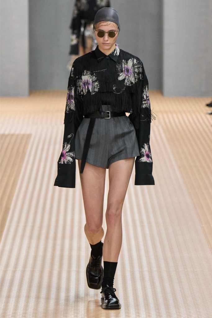 The standout pieces? A mix of tactile techniques and quirky details. Metal fringe adorned skirts like jewelry, while printed floral shirts created shifting depth with fringed blooms. The craftsmanship was the star, but it was paired with playful experimentation. The collection balanced structured, tailored pieces like oversized blazers and pleated trousers with airy, ethereal touches—think sheer dresses floating down the runway, almost as if defying gravity.