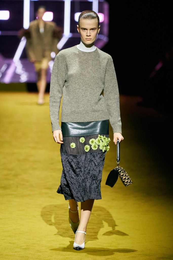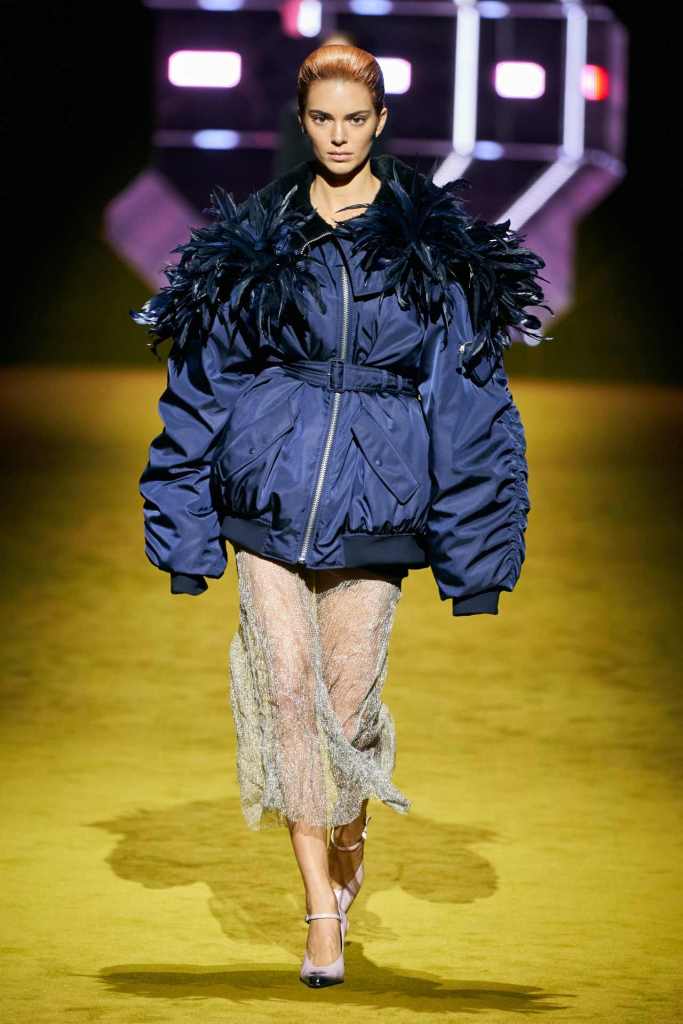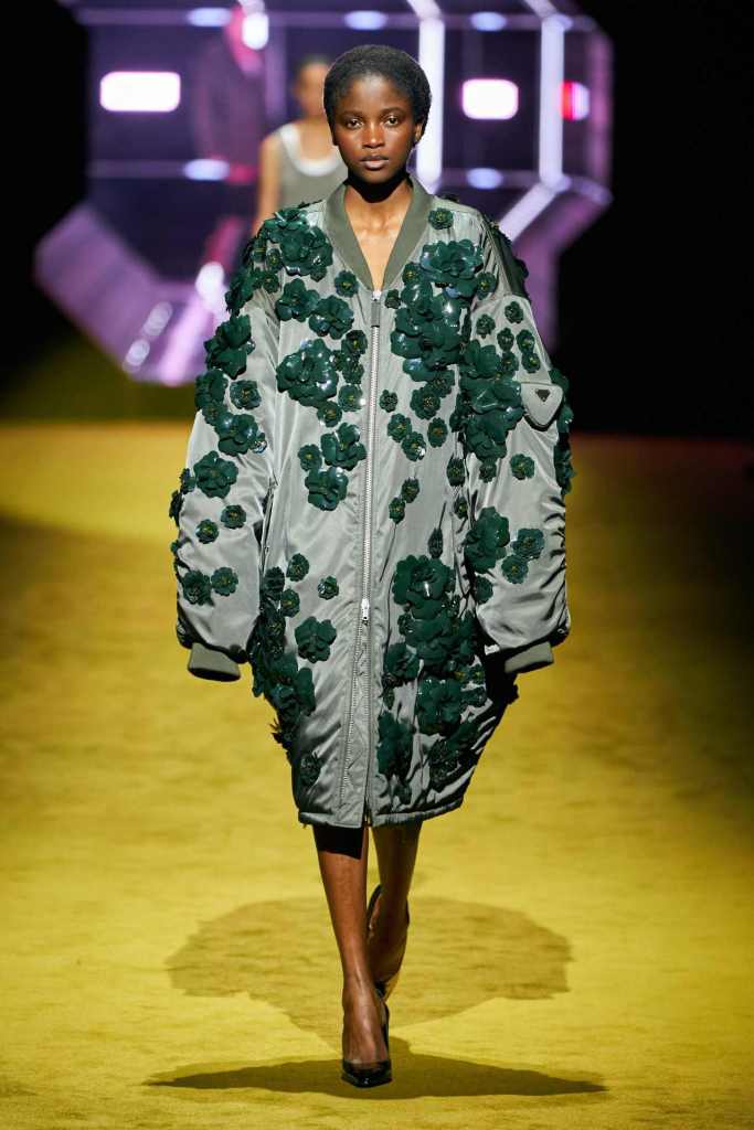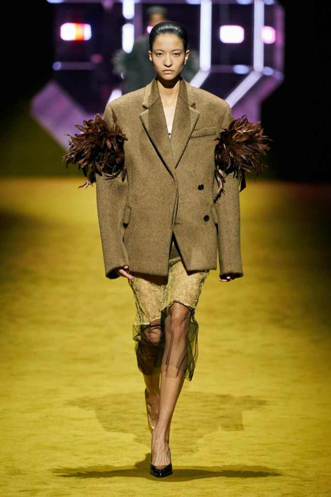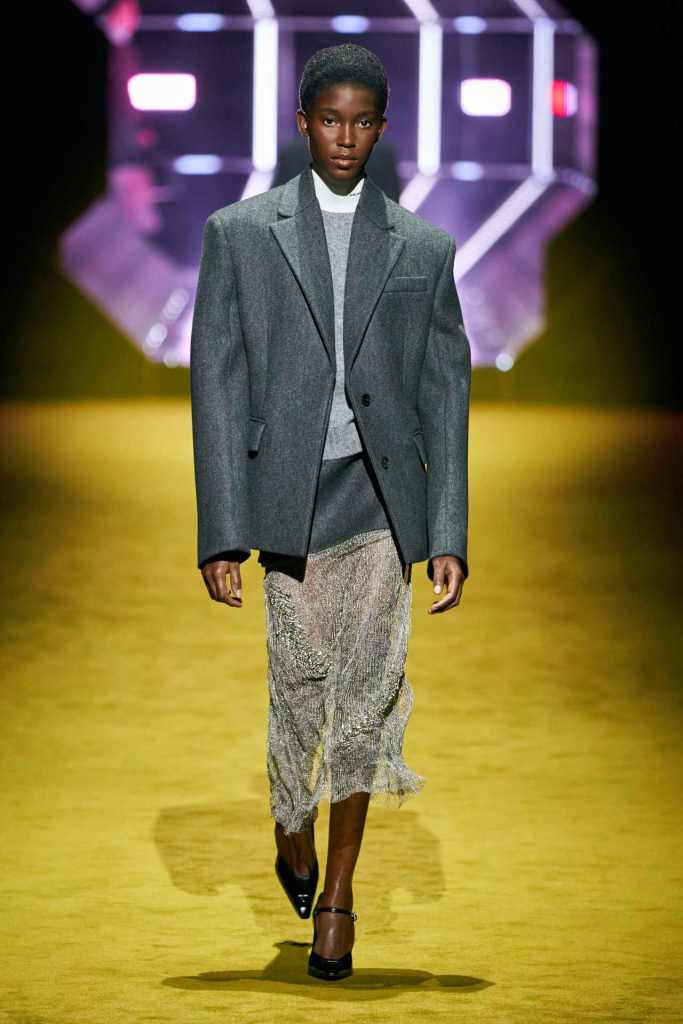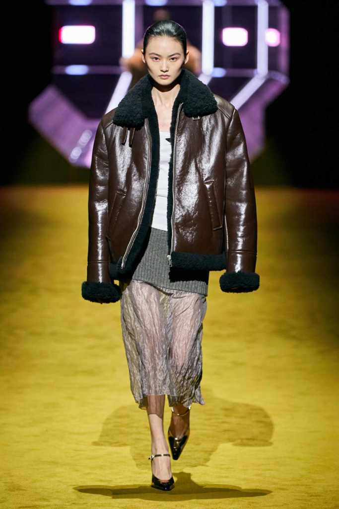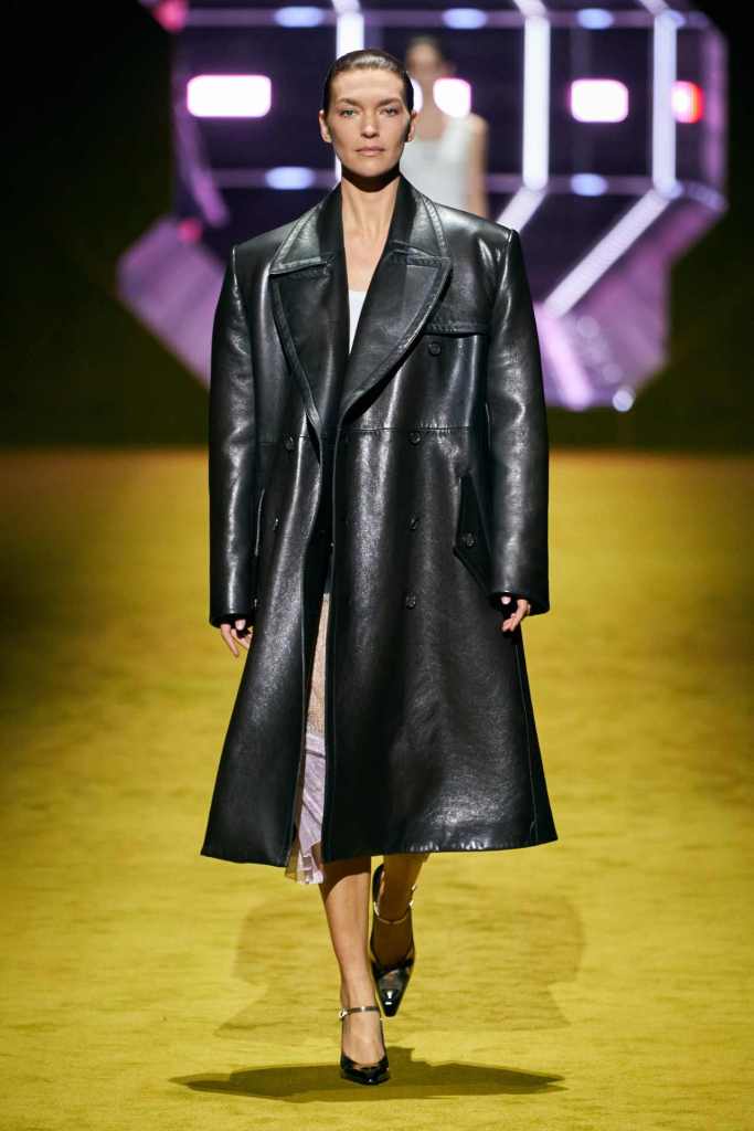 The designers leaned into juxtaposition throughout the collection. Sheer-panel skirts shimmered with beaded hems, while oversized bomber jackets were embroidered with flowers or adorned with feathery spikes. Masculine tailoring in the form of oversized suit jackets and leather trenches collided with soft, feminine details like pearl necklaces draped asymmetrically. It’s a balancing act that Prada and Simons have perfected, making the ordinary extraordinary and giving the everyday an air of occasion.