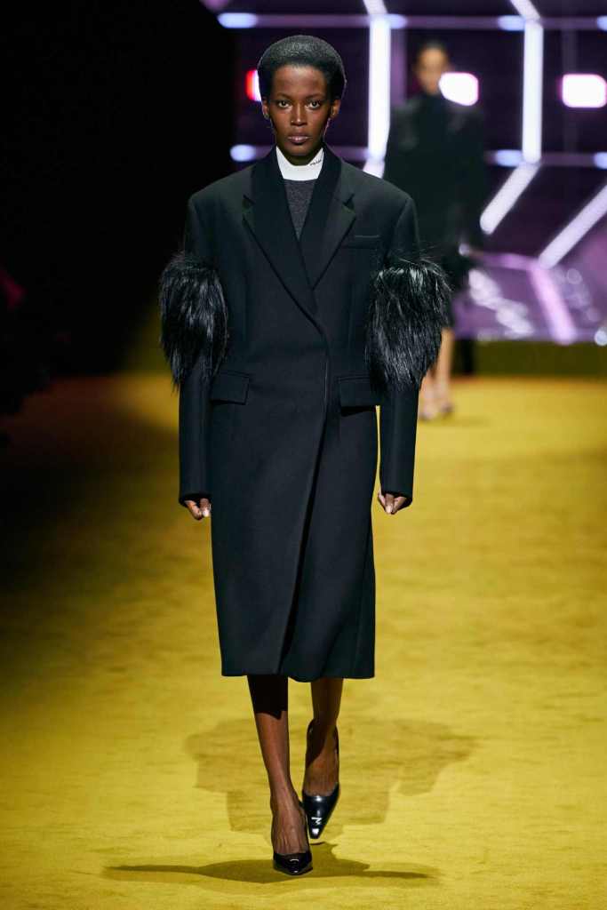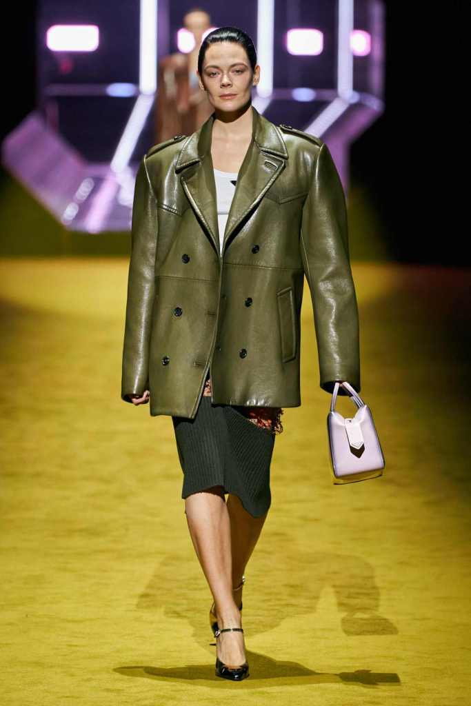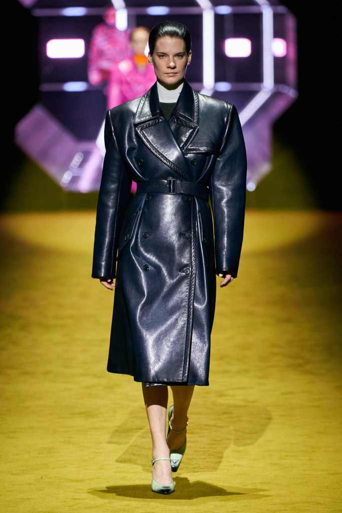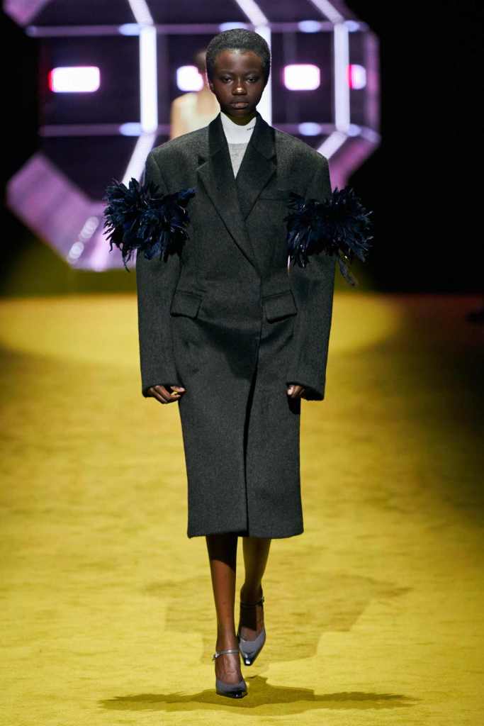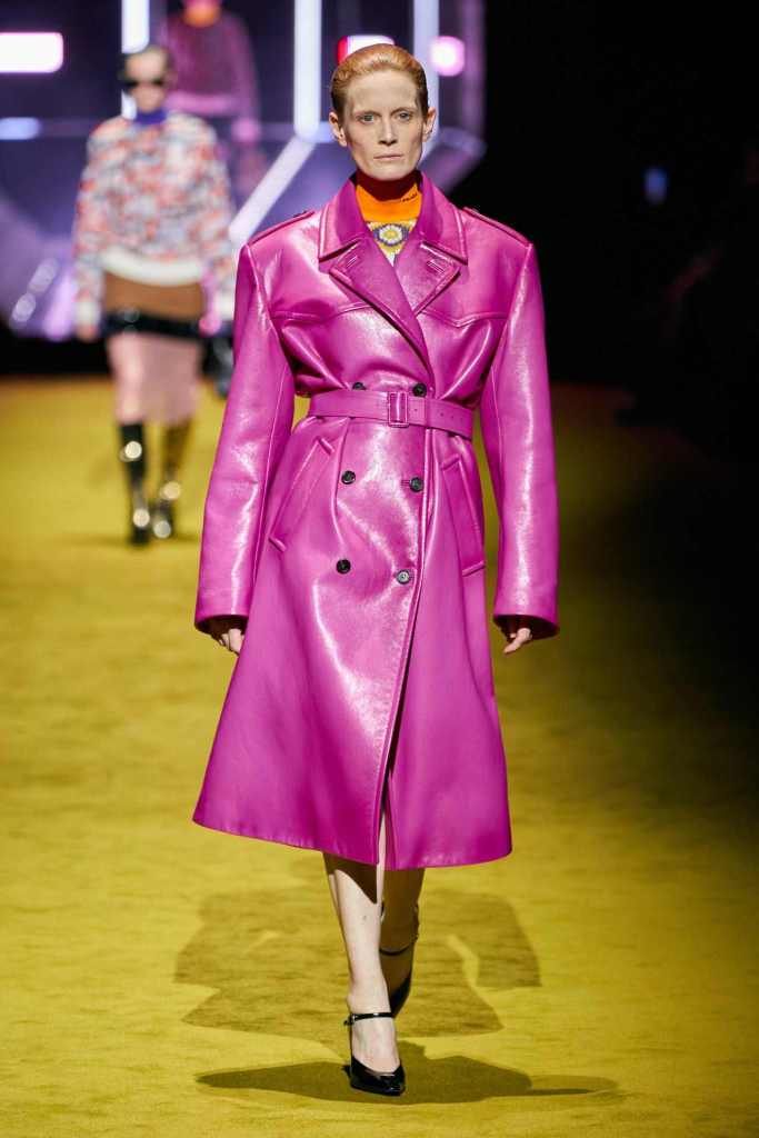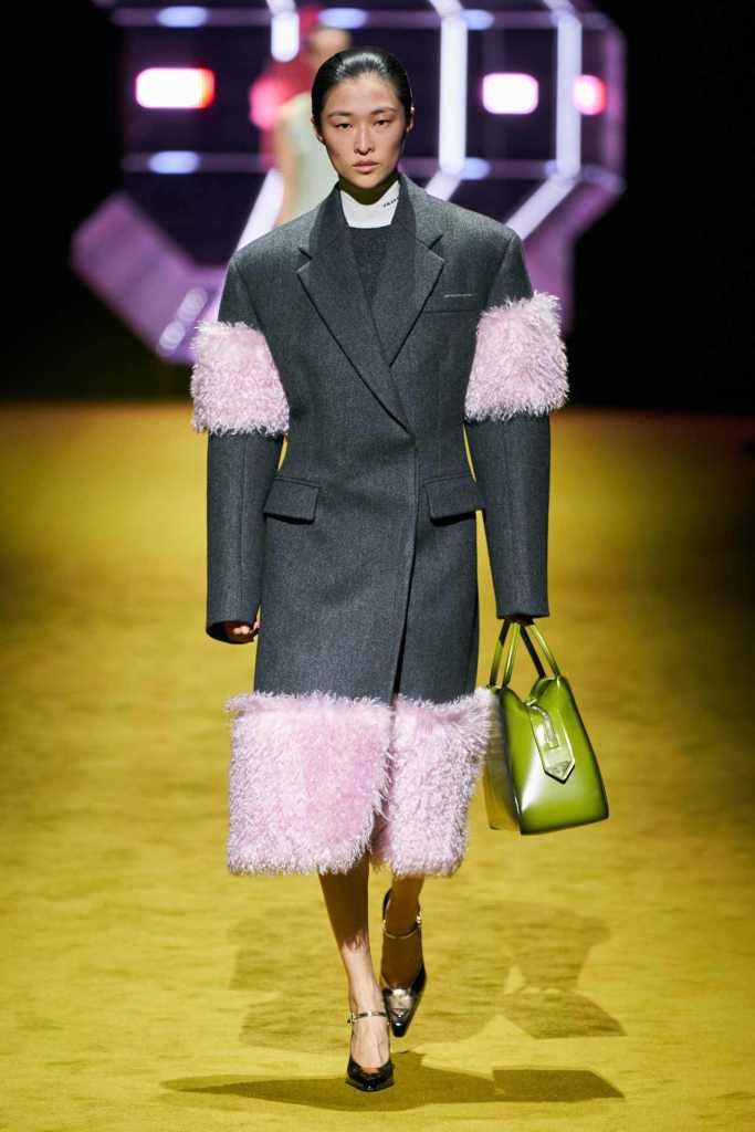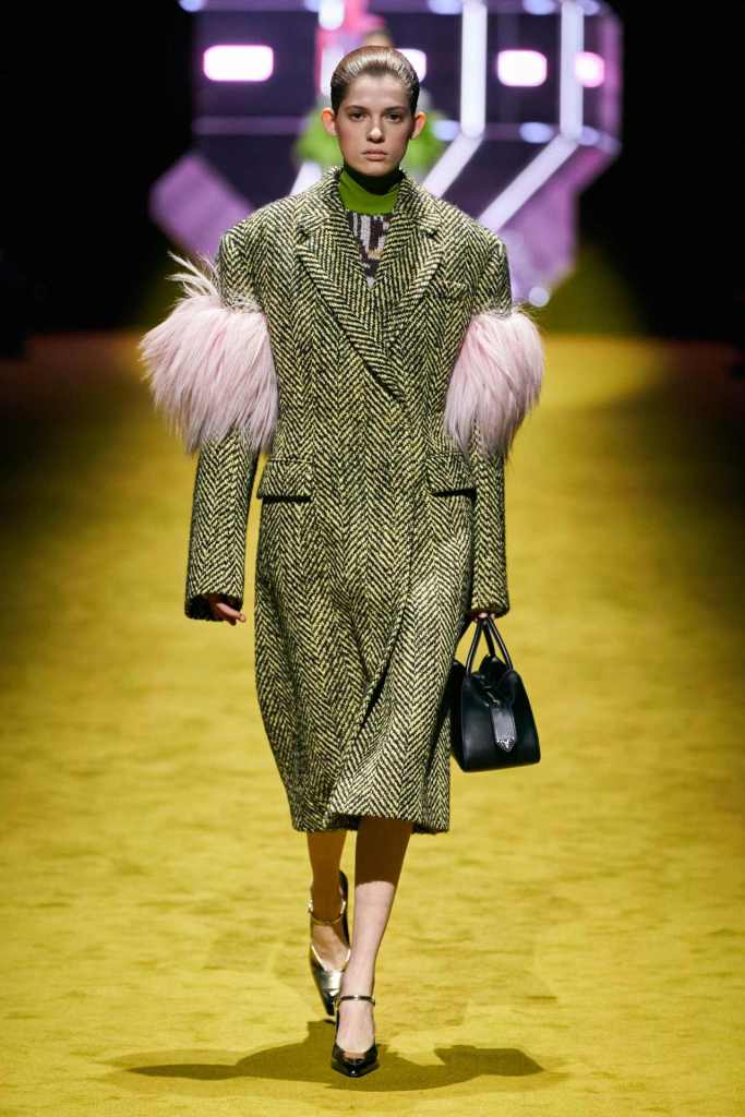 A nod to the archives came through vividly in sweaters showcasing the “ugly” prints that defined Prada in the ’90s—acid green, fuchsia, and brown—reimagined for a new generation. The outerwear stole the show, with bold black evening coats, vibrant shocking pink trenches, and jackets accented by playful rings of green faux fur. Each piece felt like a statement, designed to turn heads while remaining deeply wearable.