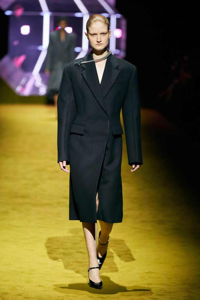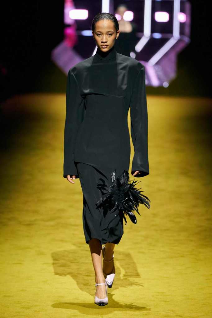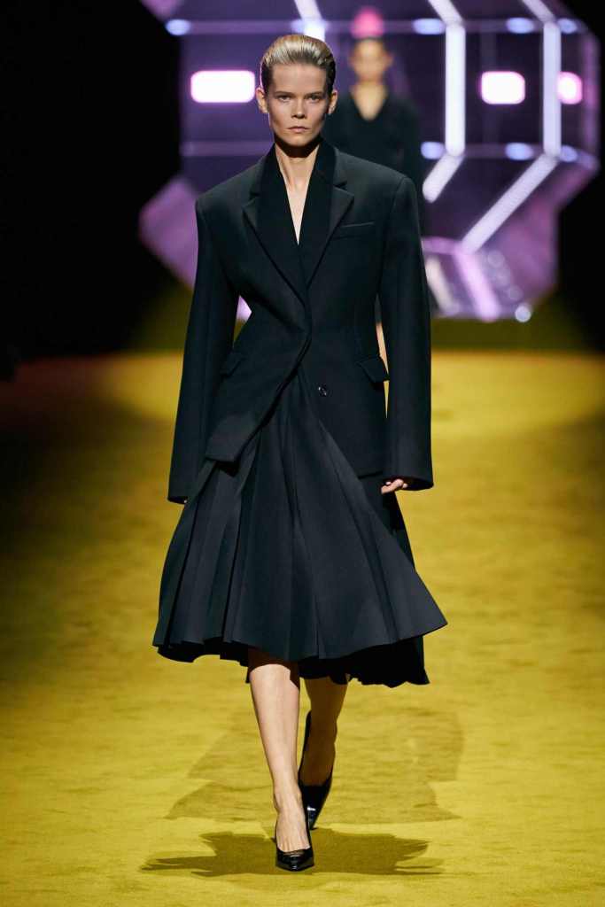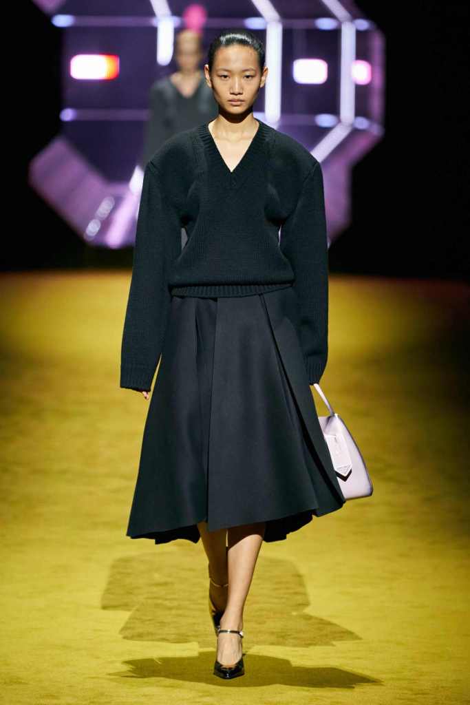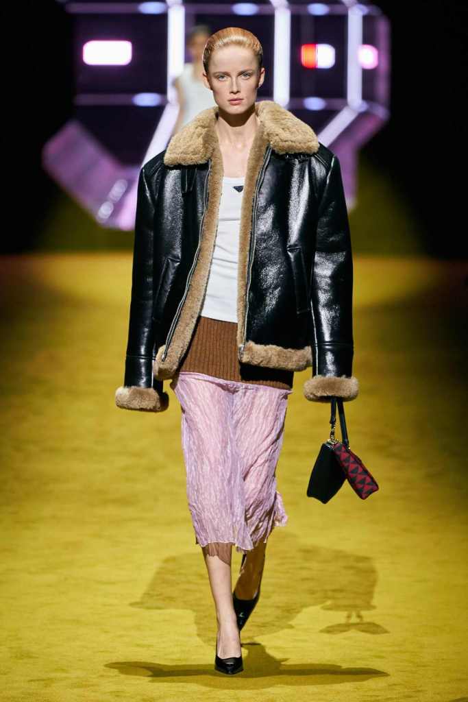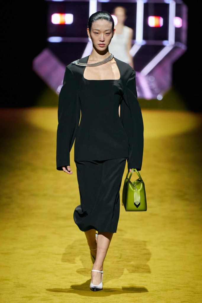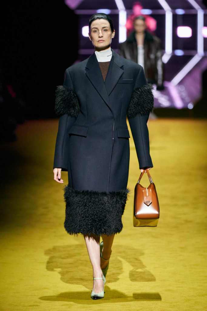 A nod to the archives came through vividly in sweaters showcasing the “ugly” prints that defined Prada in the ’90s—acid green, fuchsia, and brown—reimagined for a new generation. The outerwear stole the show, with bold black evening coats, vibrant shocking pink trenches, and jackets accented by playful rings of green faux fur. Each piece felt like a statement, designed to turn heads while remaining deeply wearable.