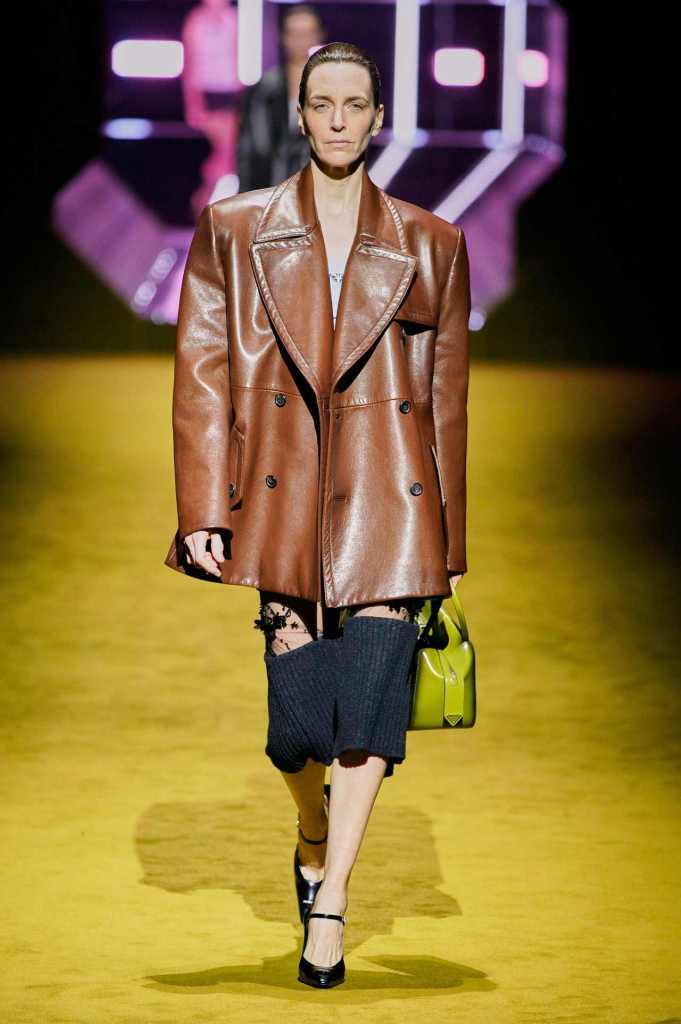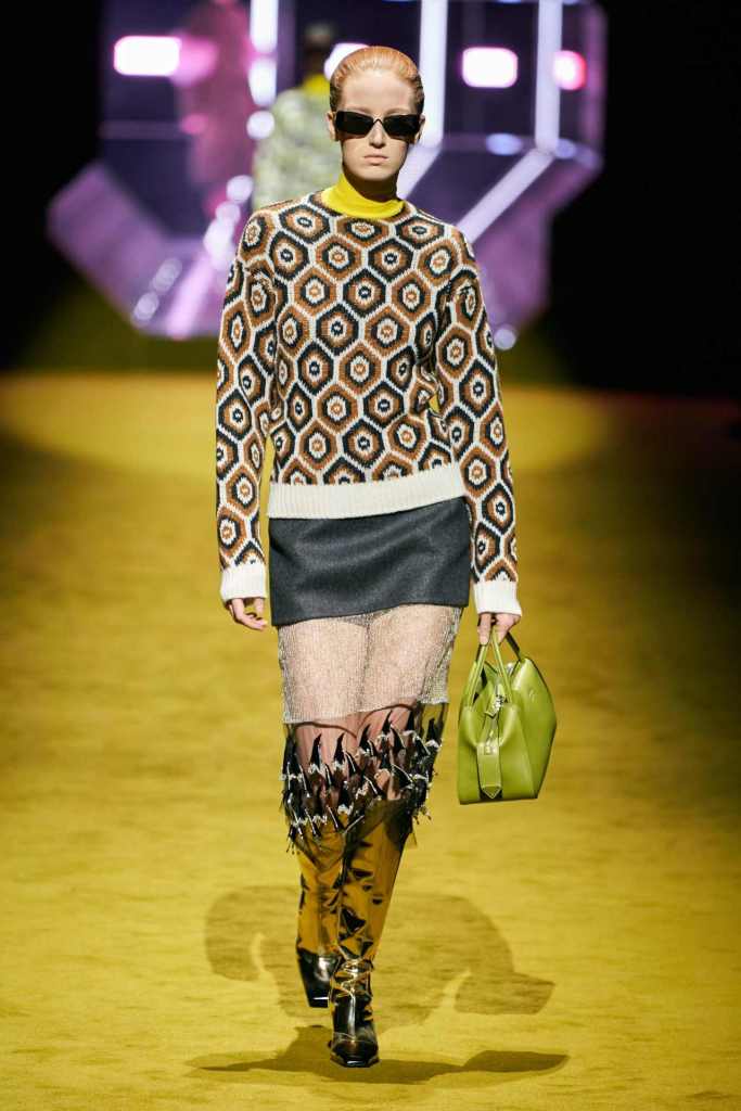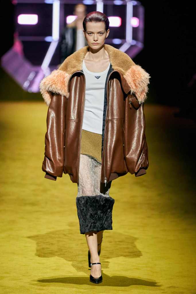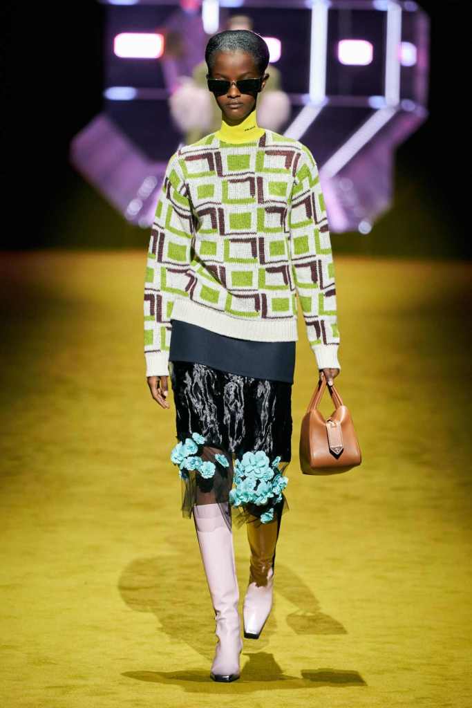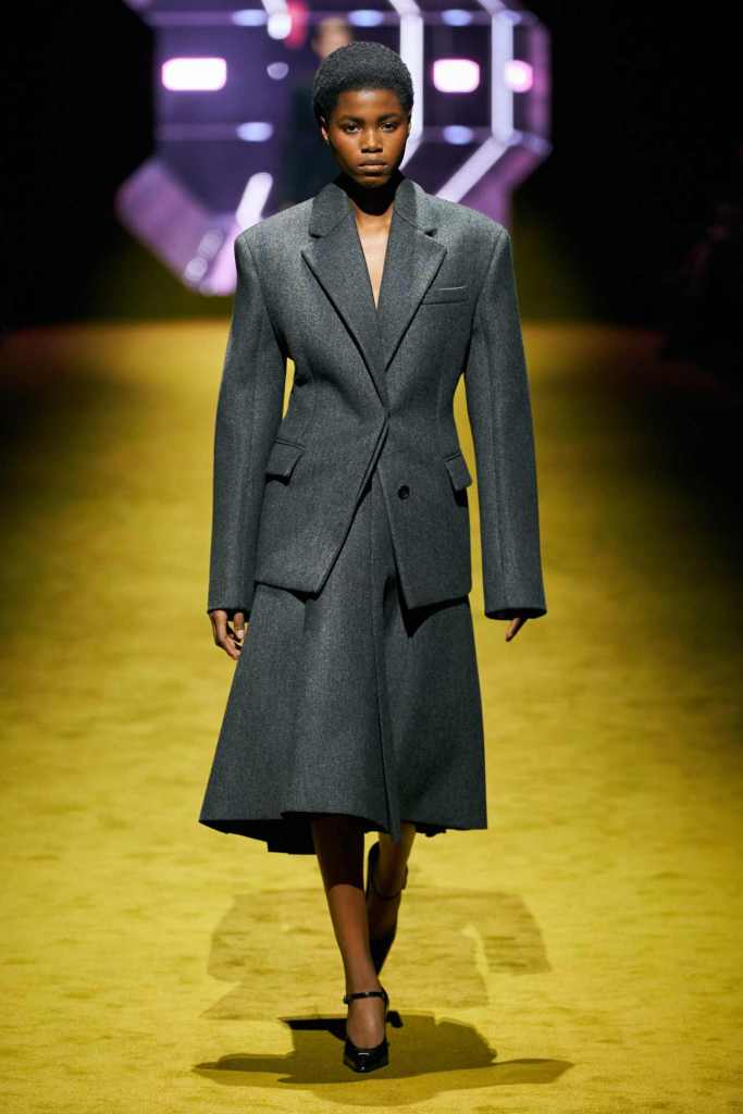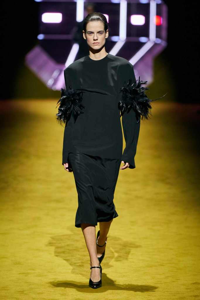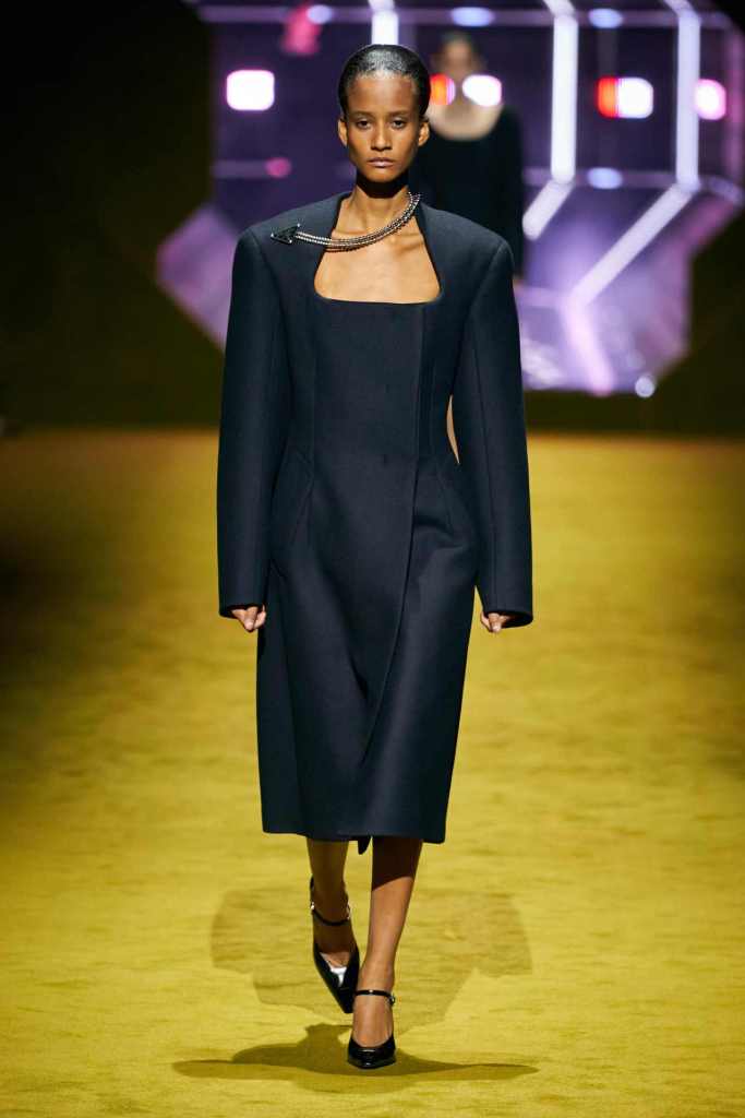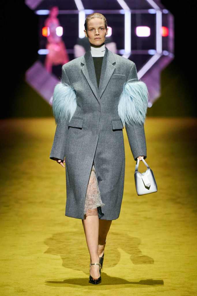 A nod to the archives came through vividly in sweaters showcasing the “ugly” prints that defined Prada in the ’90s—acid green, fuchsia, and brown—reimagined for a new generation. The outerwear stole the show, with bold black evening coats, vibrant shocking pink trenches, and jackets accented by playful rings of green faux fur. Each piece felt like a statement, designed to turn heads while remaining deeply wearable.