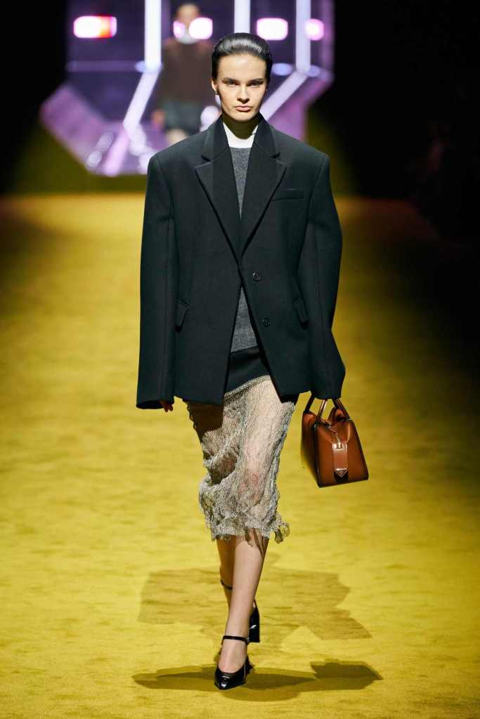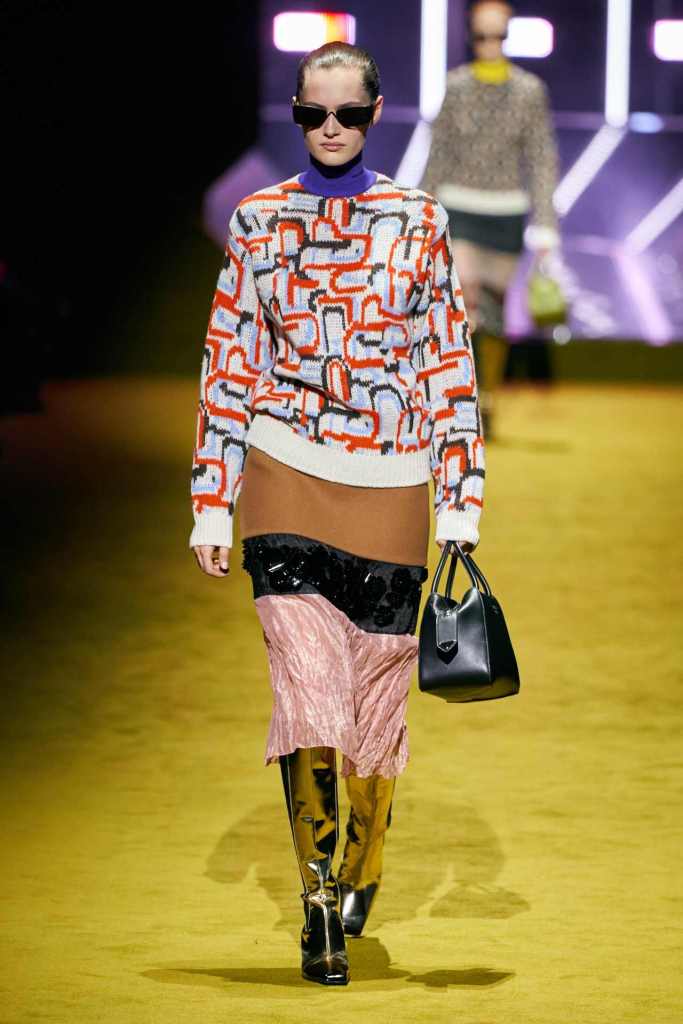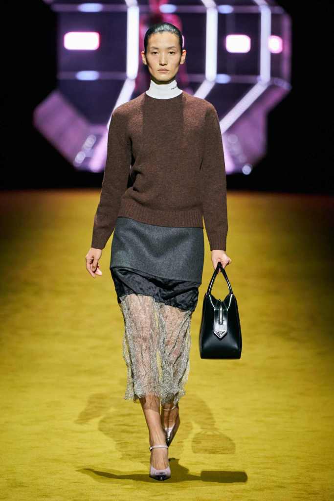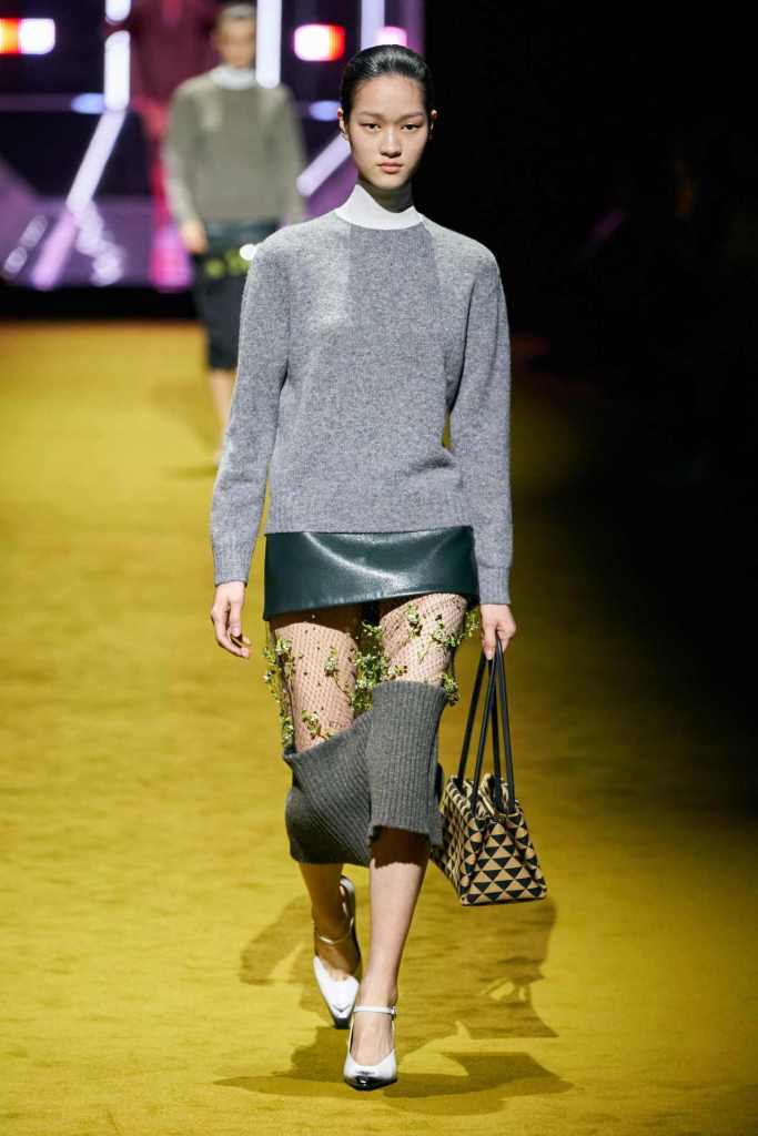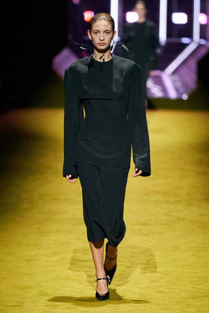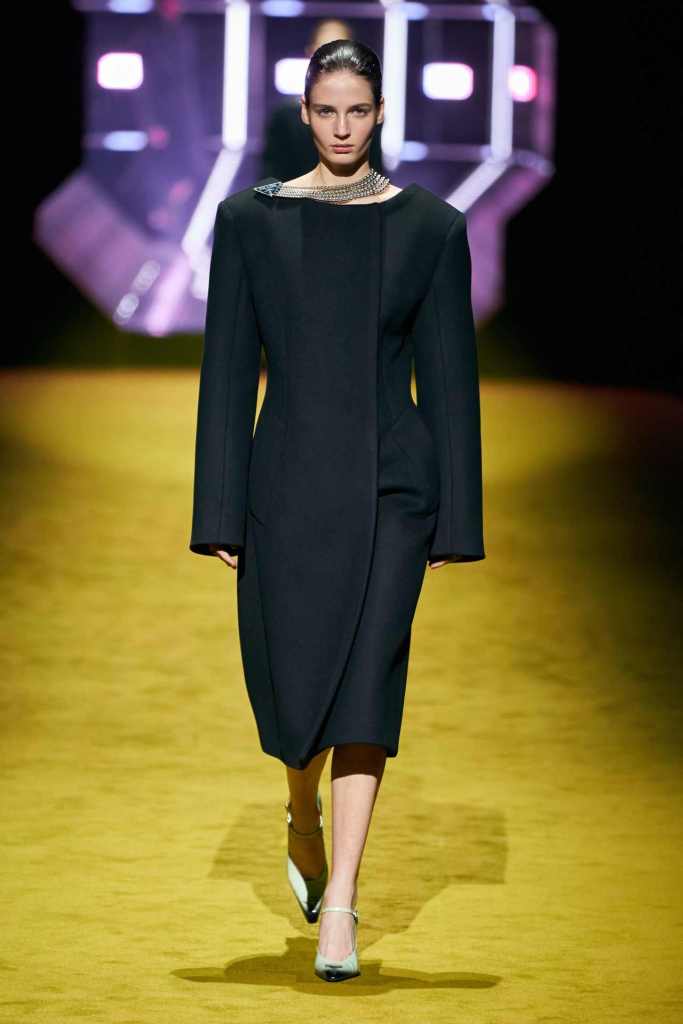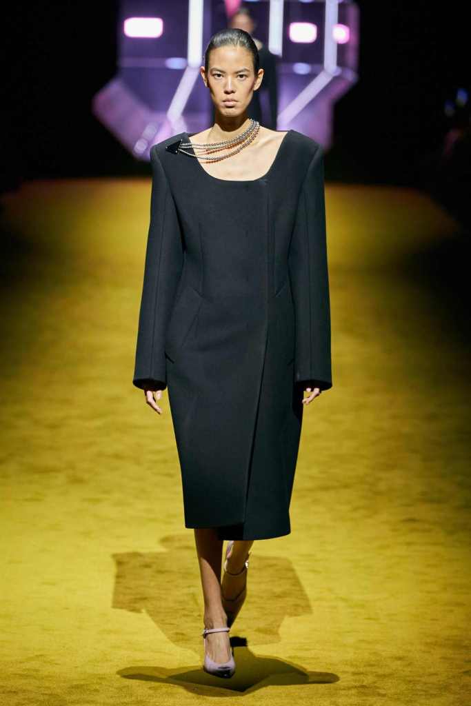 A nod to the archives came through vividly in sweaters showcasing the “ugly” prints that defined Prada in the ’90s—acid green, fuchsia, and brown—reimagined for a new generation. The outerwear stole the show, with bold black evening coats, vibrant shocking pink trenches, and jackets accented by playful rings of green faux fur. Each piece felt like a statement, designed to turn heads while remaining deeply wearable.