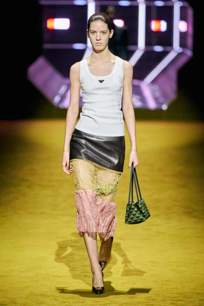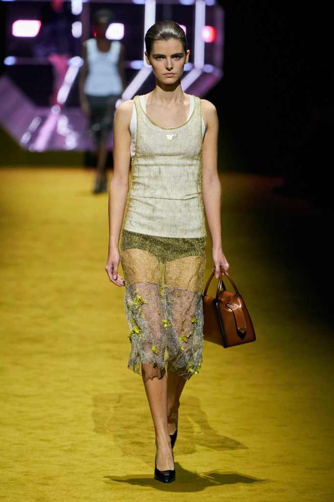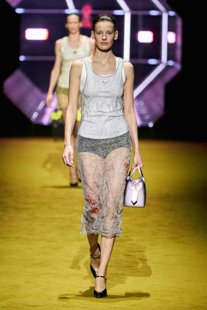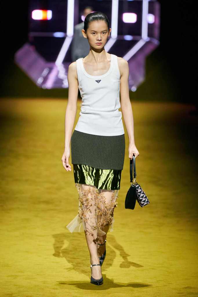 The ribbed tanks with Prada’s iconic triangular logo, paired with mixed-media midi skirts, are poised to become the season’s must-haves. They’re simple, wearable, and unmistakably Prada—perfect for the clicks and pics culture of our time. Kaia Gerber’s opening look, featuring one of these tanks styled with an embellished skirt and wedge heels, set the tone for a collection that celebrates contrasts: utility and elegance, masculinity and femininity, lightness and weight.