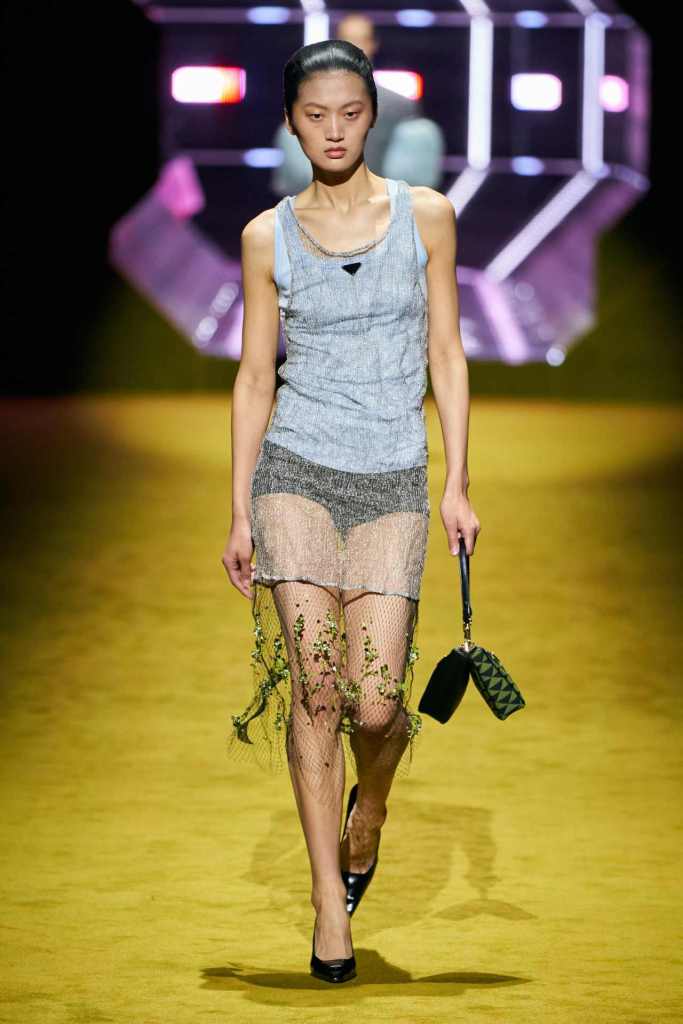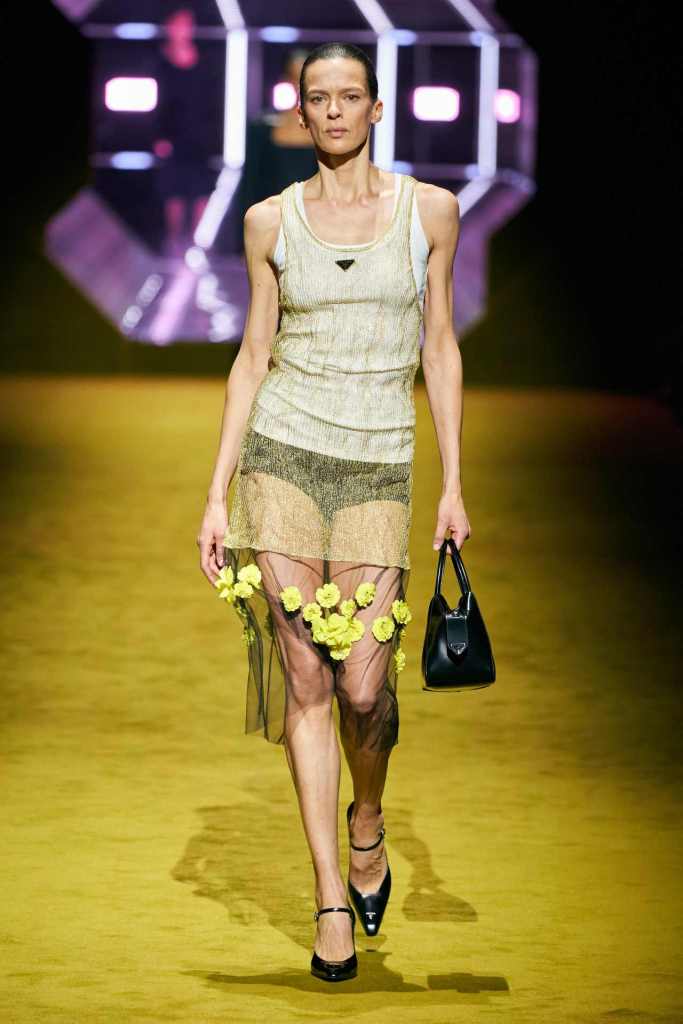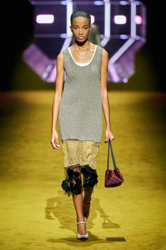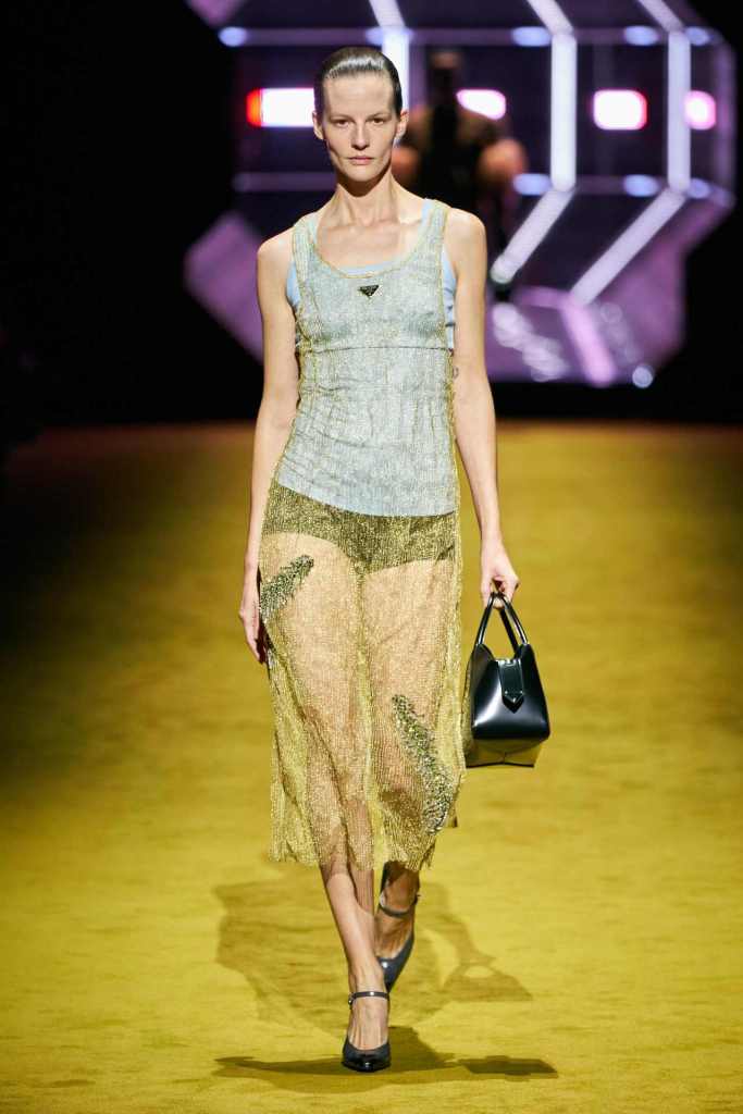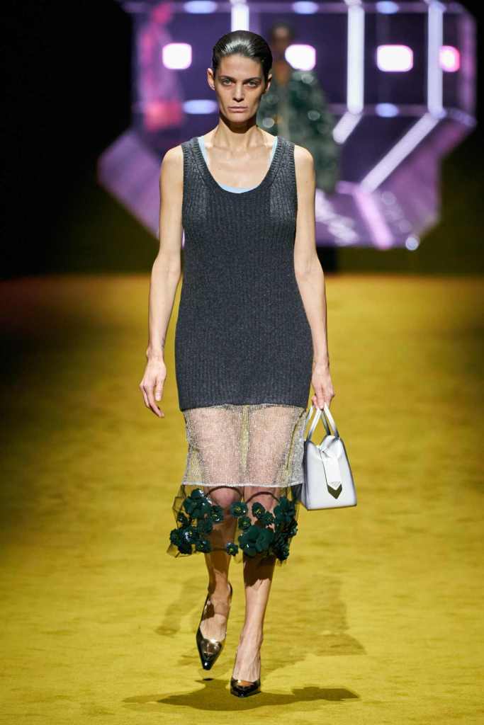 The ribbed tanks with Prada’s iconic triangular logo, paired with mixed-media midi skirts, are poised to become the season’s must-haves. They’re simple, wearable, and unmistakably Prada—perfect for the clicks and pics culture of our time. Kaia Gerber’s opening look, featuring one of these tanks styled with an embellished skirt and wedge heels, set the tone for a collection that celebrates contrasts: utility and elegance, masculinity and femininity, lightness and weight.