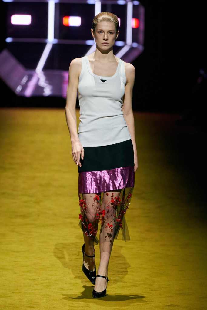 The designers leaned into juxtaposition throughout the collection. Sheer-panel skirts shimmered with beaded hems, while oversized bomber jackets were embroidered with flowers or adorned with feathery spikes. Masculine tailoring in the form of oversized suit jackets and leather trenches collided with soft, feminine details like pearl necklaces draped asymmetrically. It’s a balancing act that Prada and Simons have perfected, making the ordinary extraordinary and giving the everyday an air of occasion. The ribbed tanks with Prada’s iconic triangular logo, paired with mixed-media midi skirts, are poised to become the season’s must-haves. They’re simple, wearable, and unmistakably Prada—perfect for the clicks and pics culture of our time. Kaia Gerber’s opening look, featuring one of these tanks styled with an embellished skirt and wedge heels, set the tone for a collection that celebrates contrasts: utility and elegance, masculinity and femininity, lightness and weight.