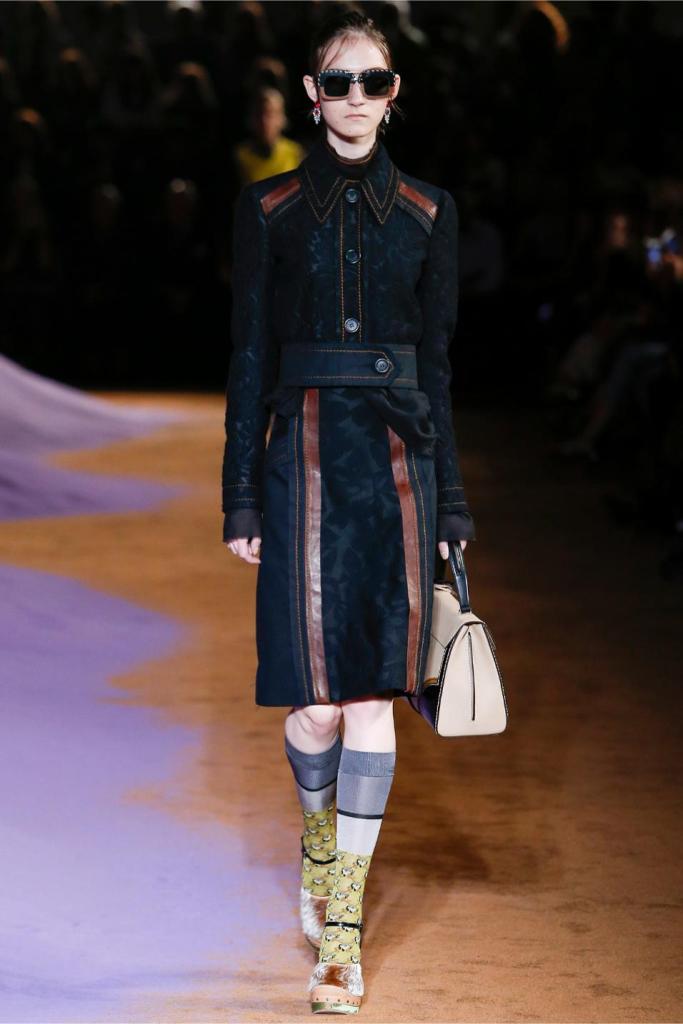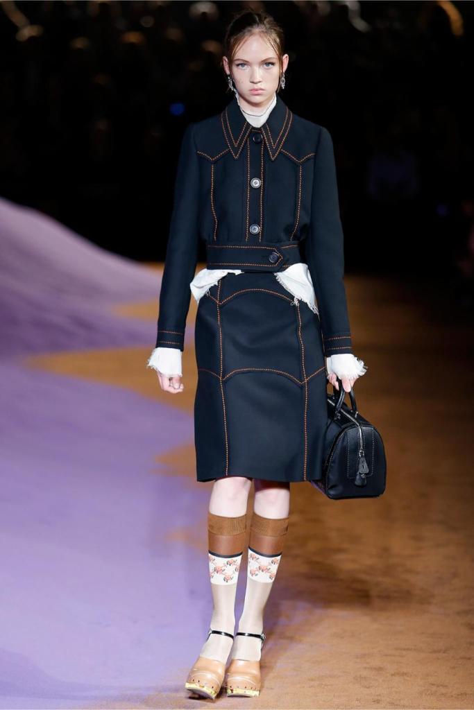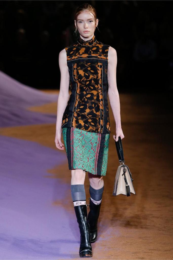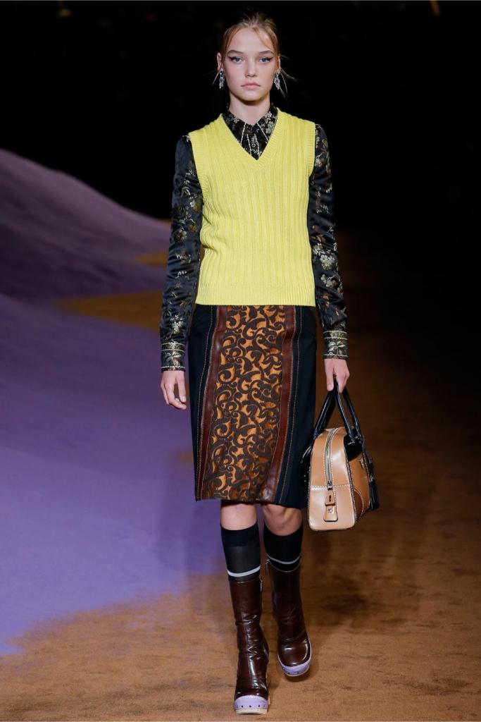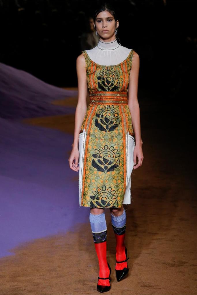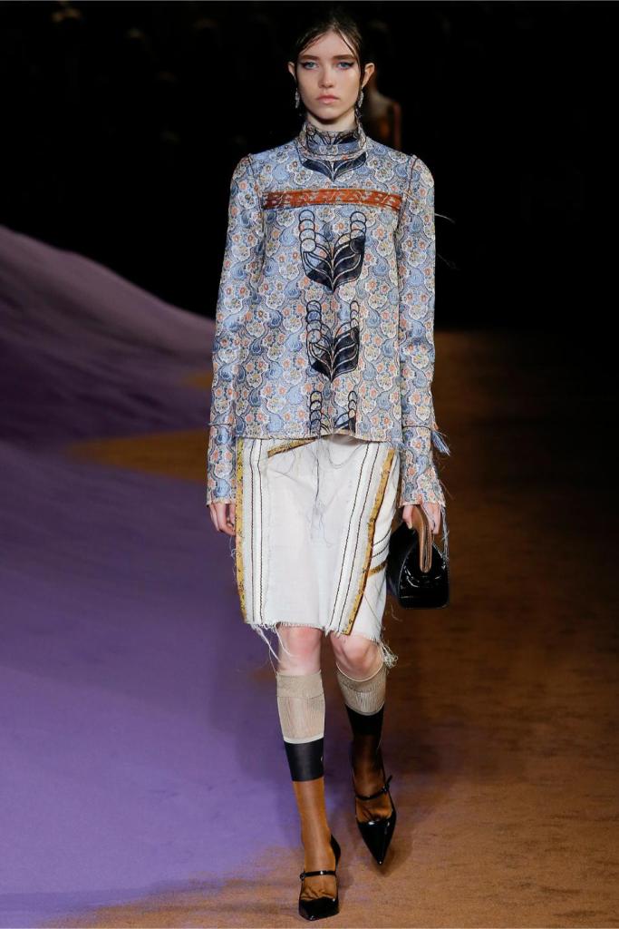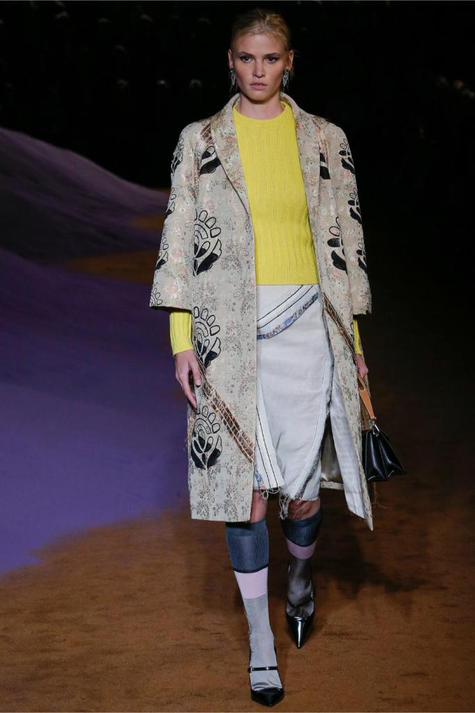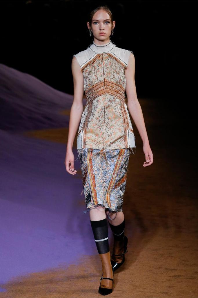 What really stood out, though, were the details. Prada layered different fabrics in unexpected ways. Knitwear featured bold, ornate patterns that drew attention to the center of the body, especially around the neck and face, creating a striking focal point. Some of the pieces felt like they were pieced together, with patchwork details, frayed hems, and threads trailing from seams—like clothes that had been repaired and reworked, showing signs of life lived in. It gave the clothes a feeling of being well-loved or even salvaged from something else.