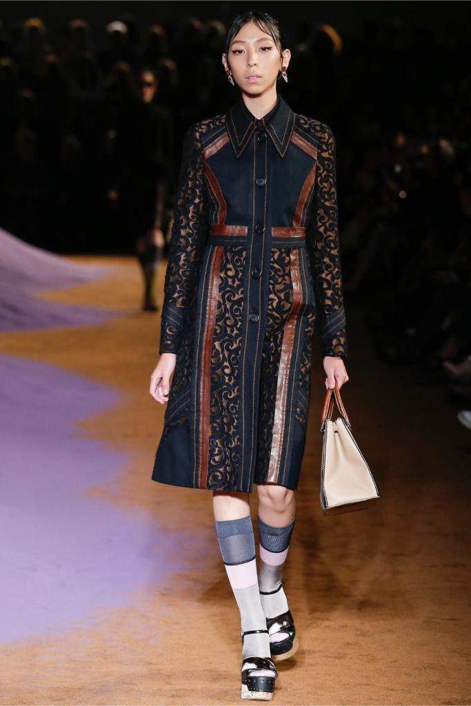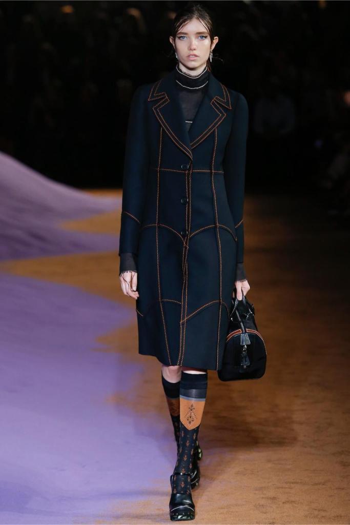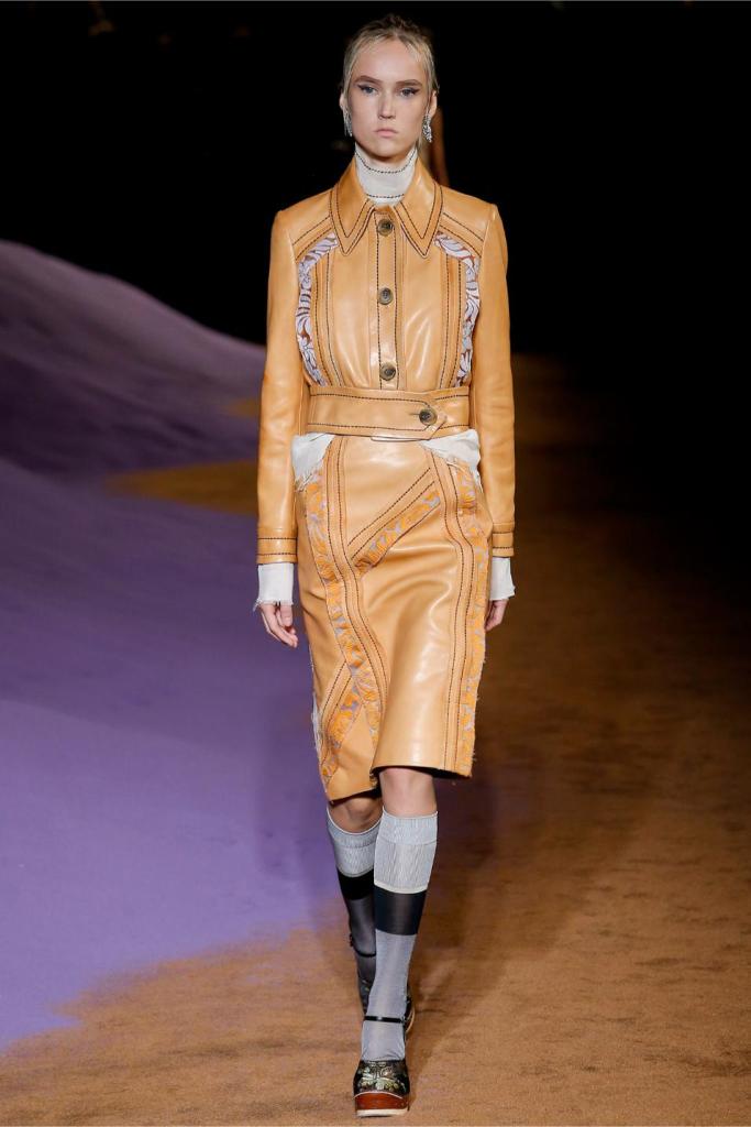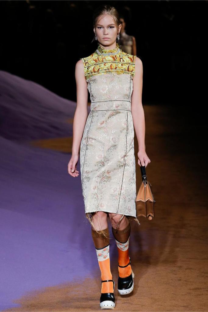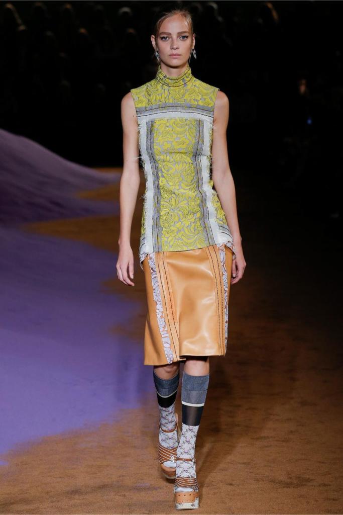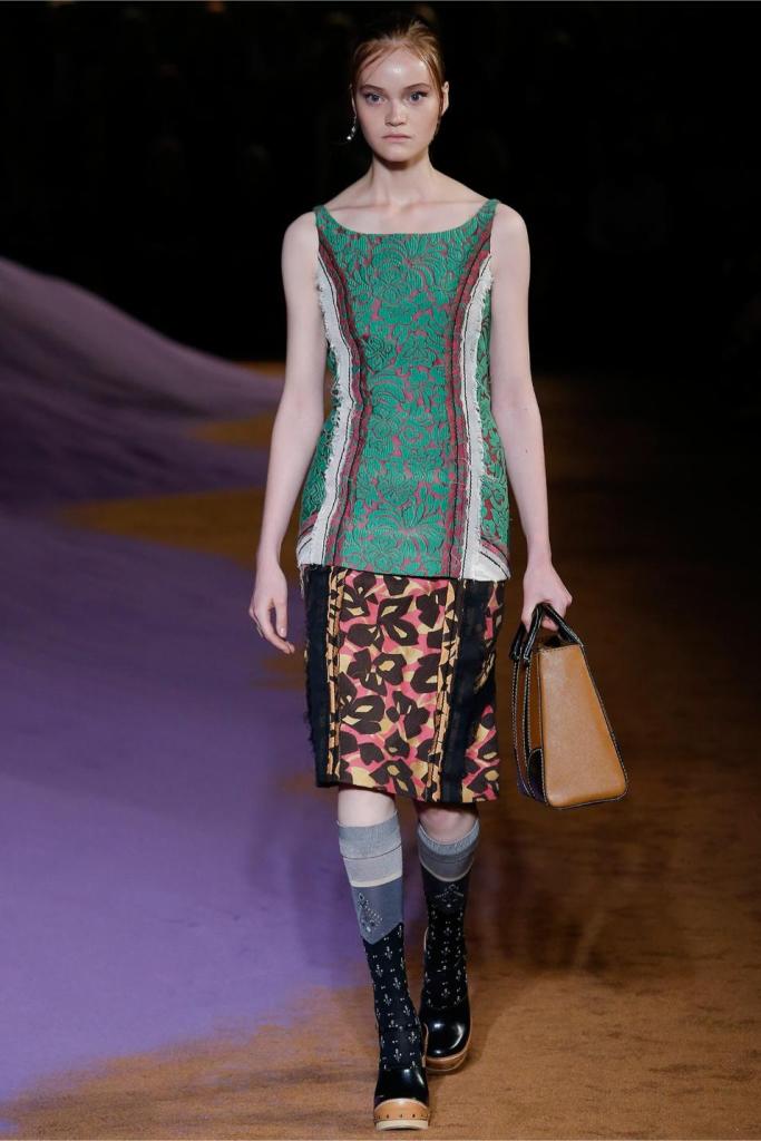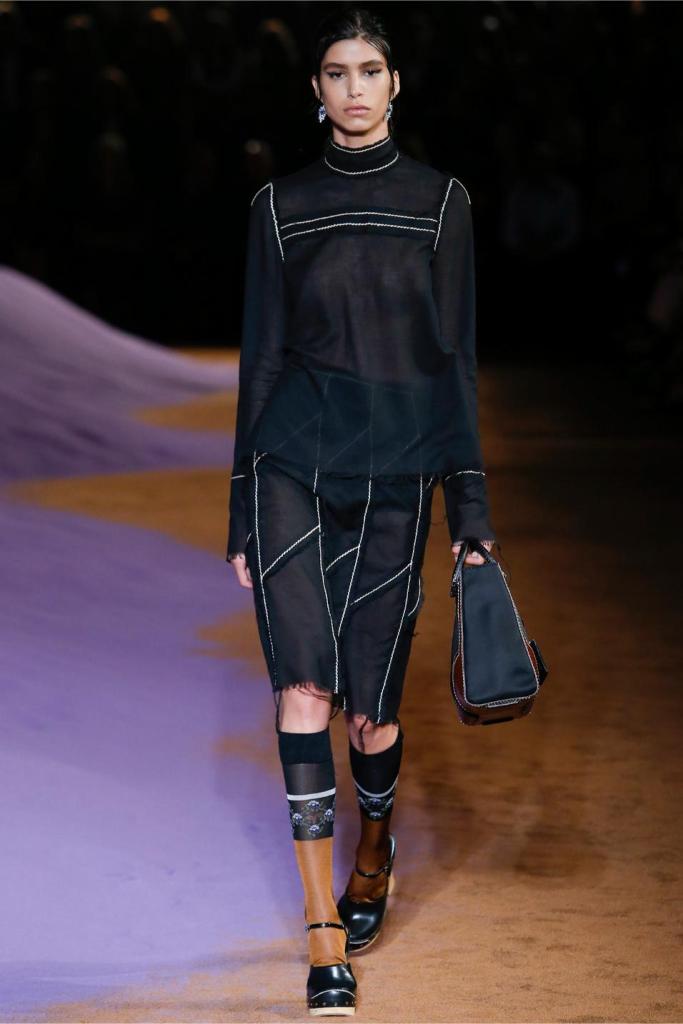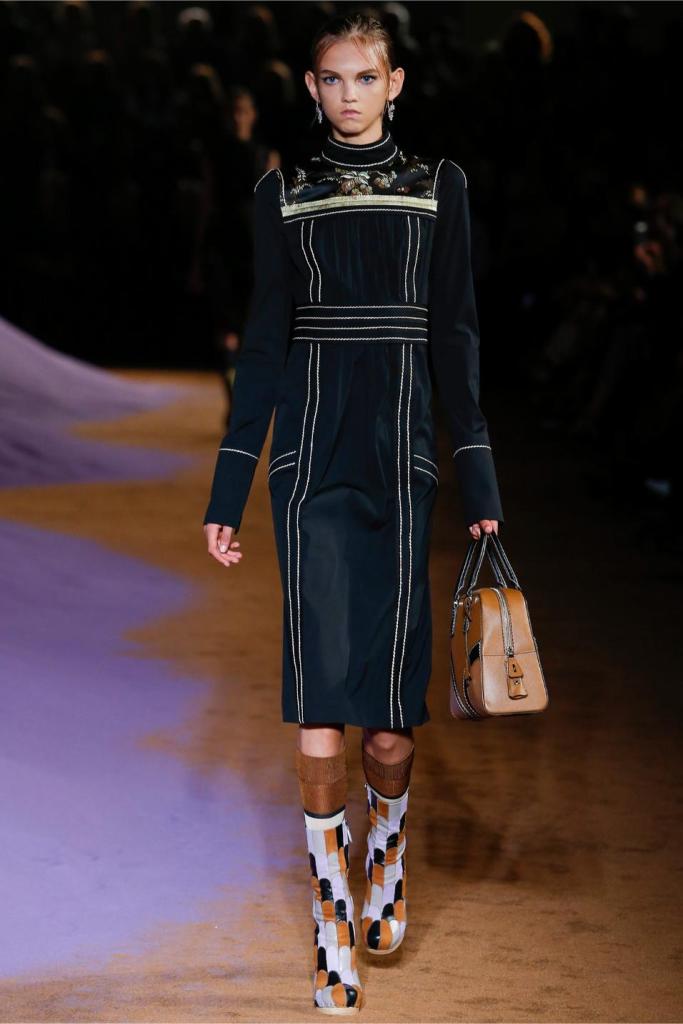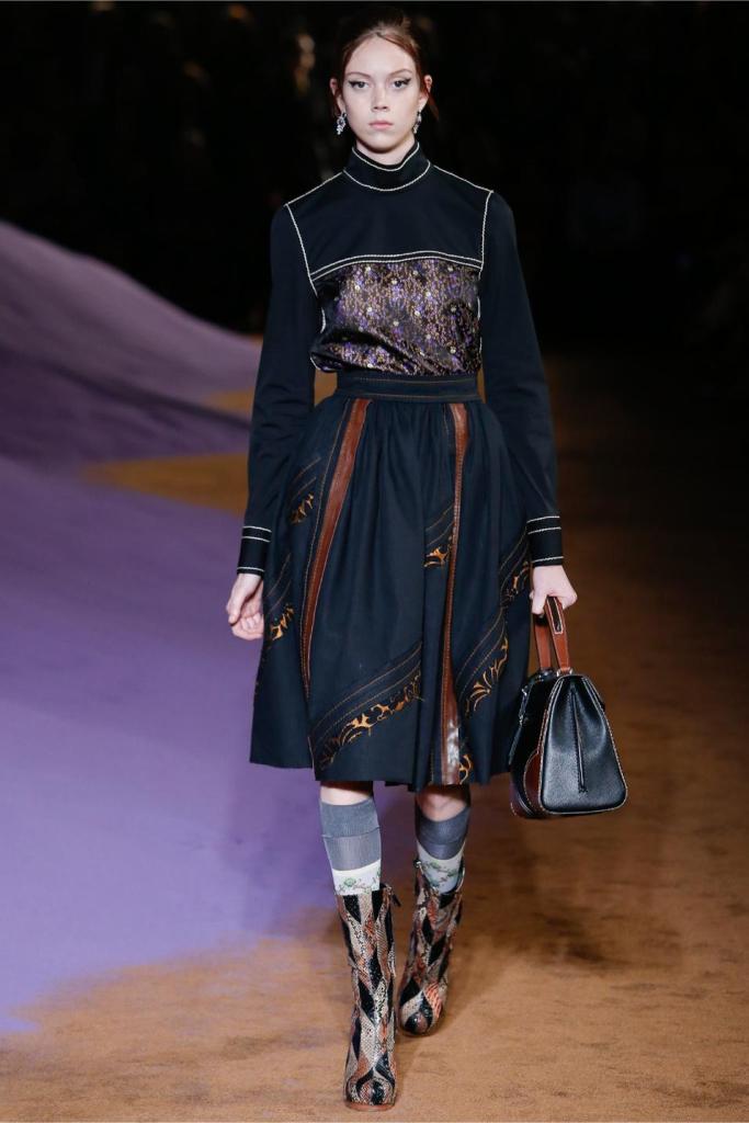 What really stood out, though, were the details. Prada layered different fabrics in unexpected ways. Knitwear featured bold, ornate patterns that drew attention to the center of the body, especially around the neck and face, creating a striking focal point. Some of the pieces felt like they were pieced together, with patchwork details, frayed hems, and threads trailing from seams—like clothes that had been repaired and reworked, showing signs of life lived in. It gave the clothes a feeling of being well-loved or even salvaged from something else.