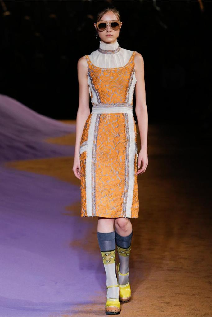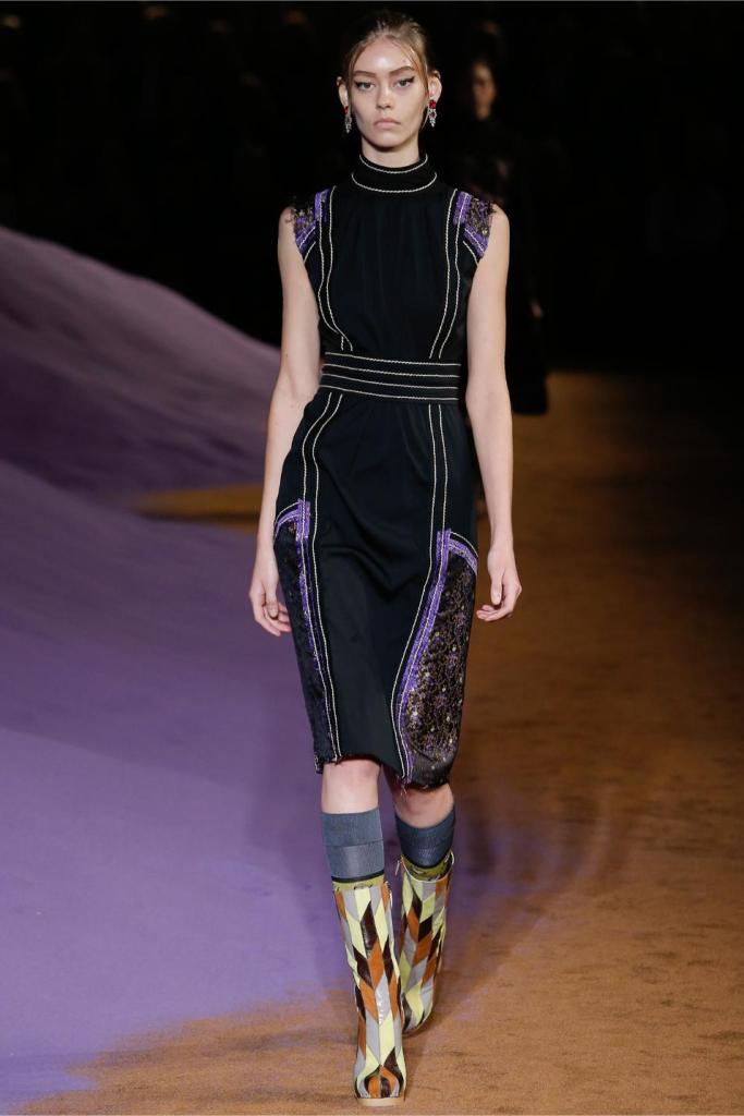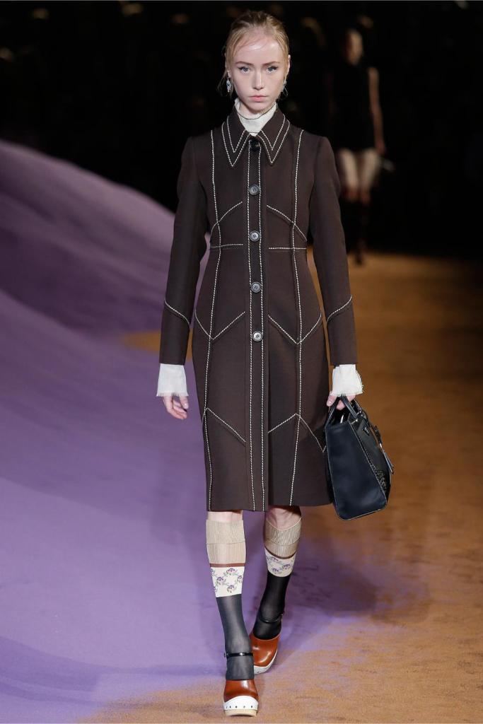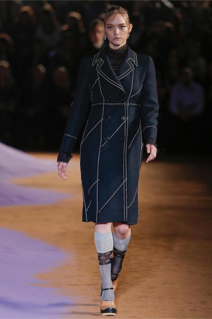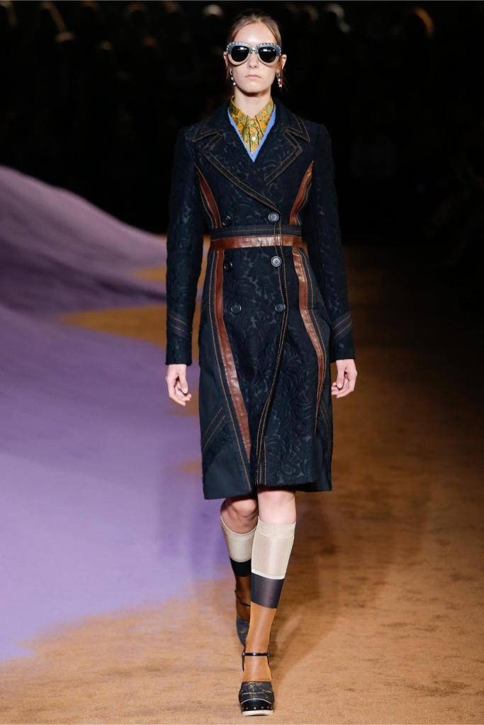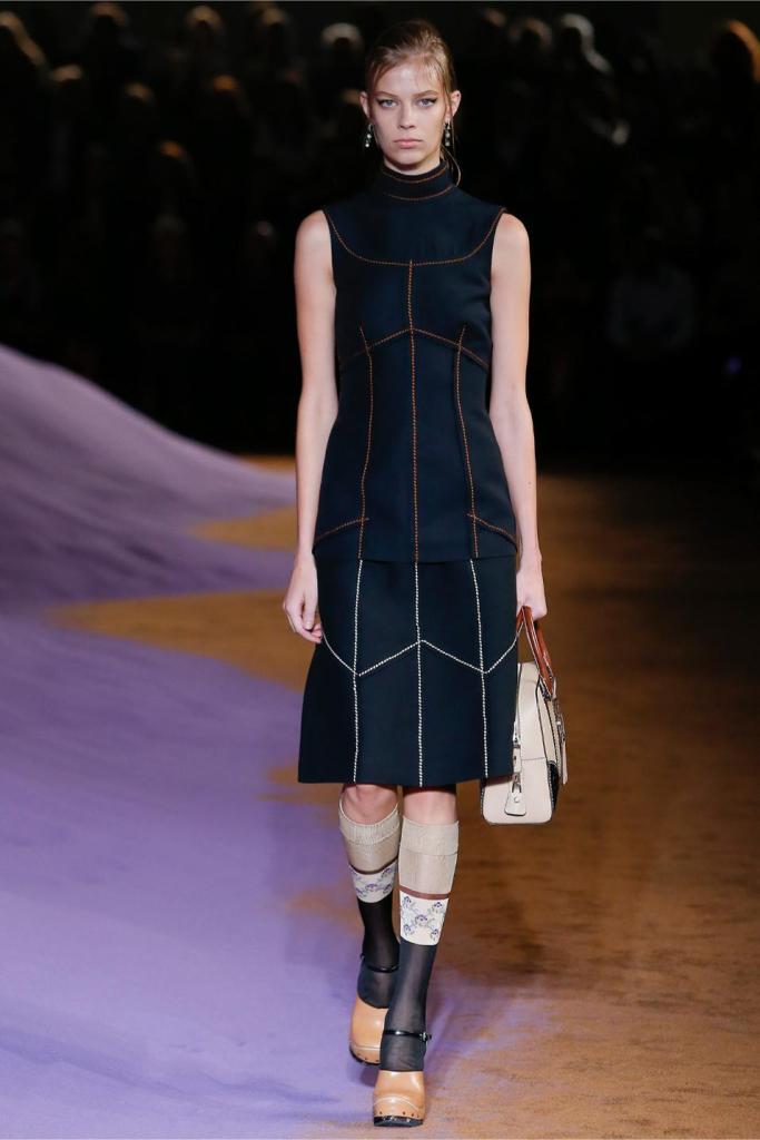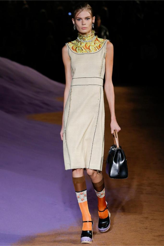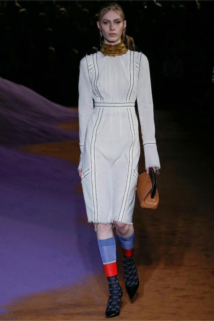 What really stood out, though, were the details. Prada layered different fabrics in unexpected ways. Knitwear featured bold, ornate patterns that drew attention to the center of the body, especially around the neck and face, creating a striking focal point. Some of the pieces felt like they were pieced together, with patchwork details, frayed hems, and threads trailing from seams—like clothes that had been repaired and reworked, showing signs of life lived in. It gave the clothes a feeling of being well-loved or even salvaged from something else.