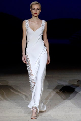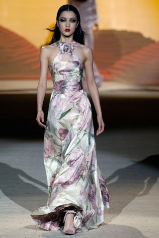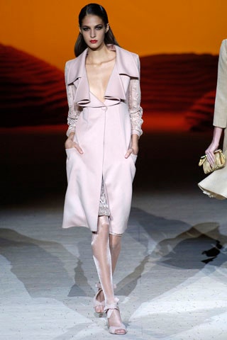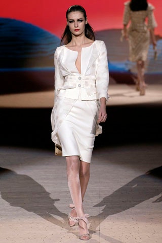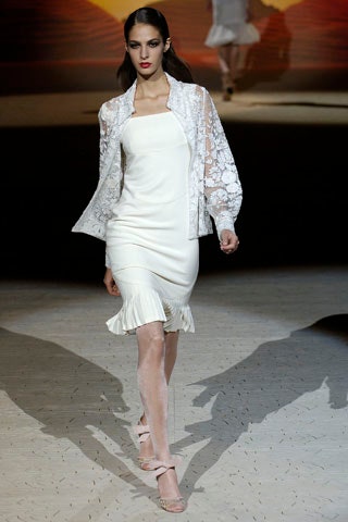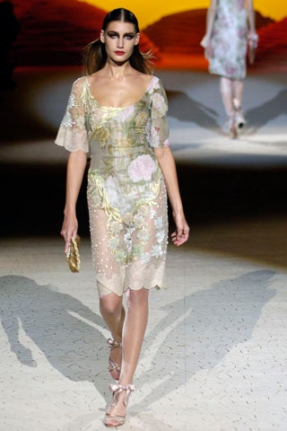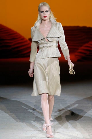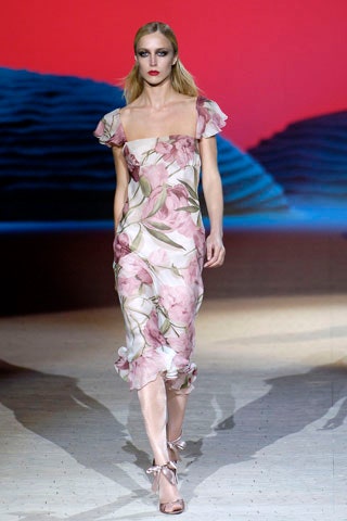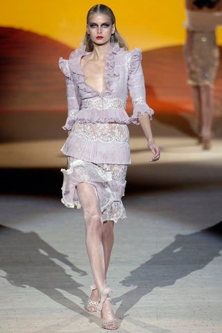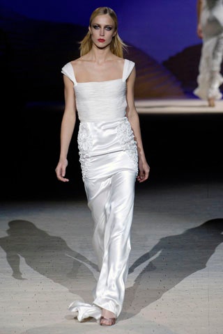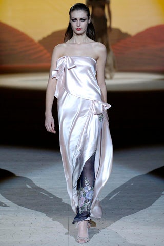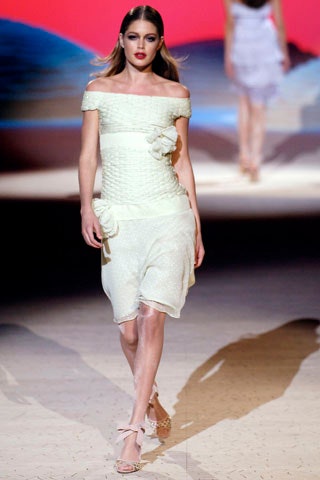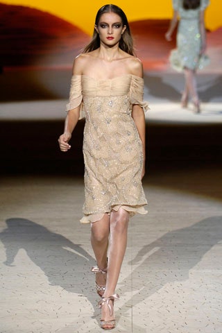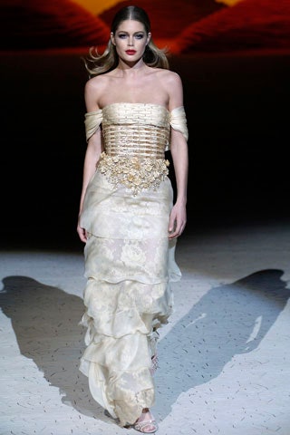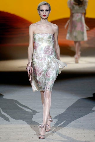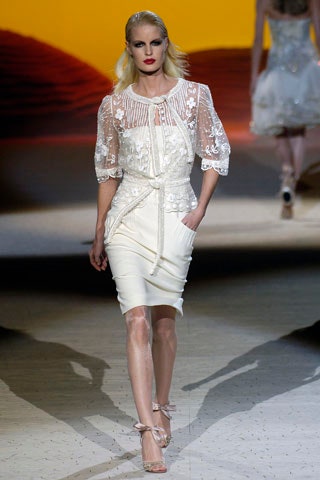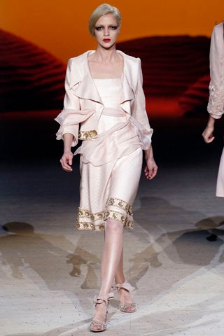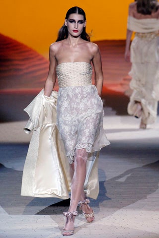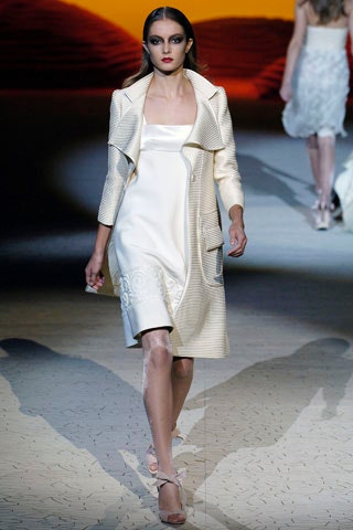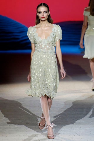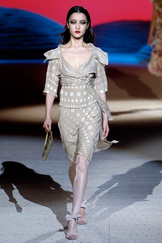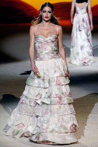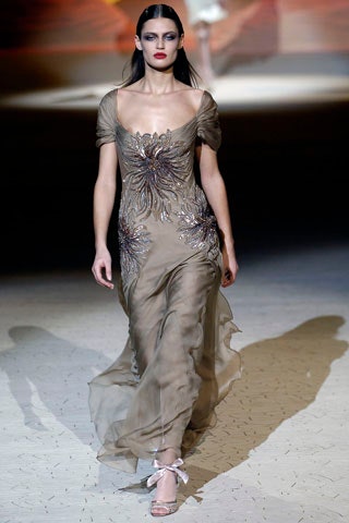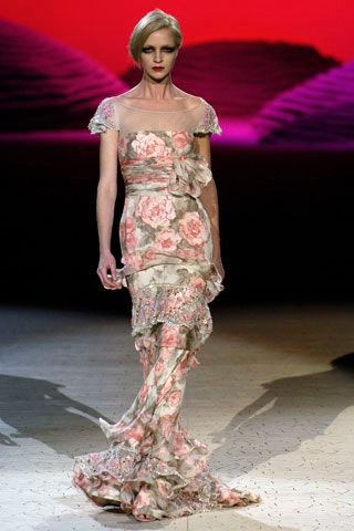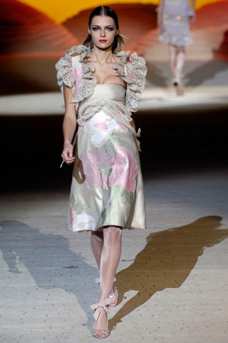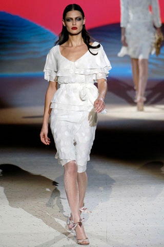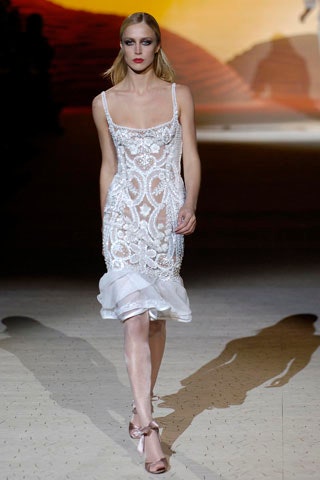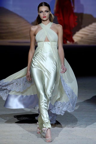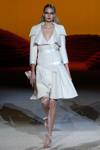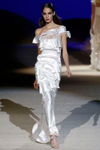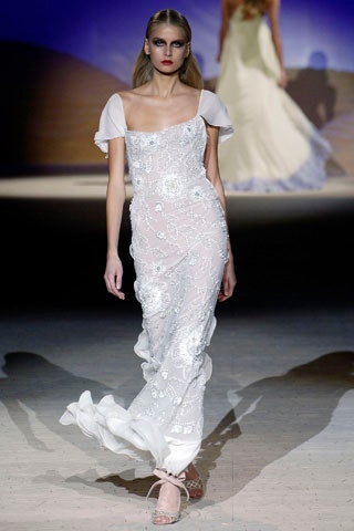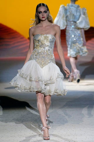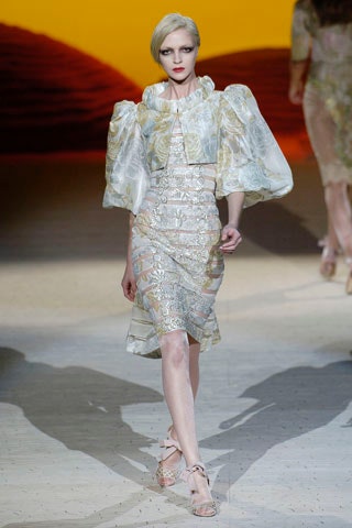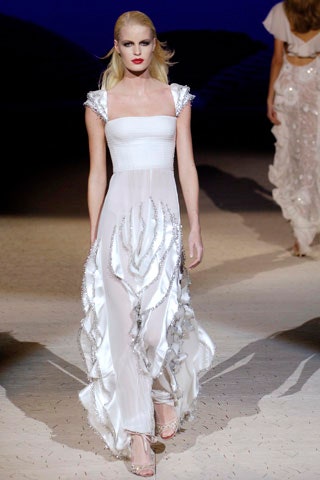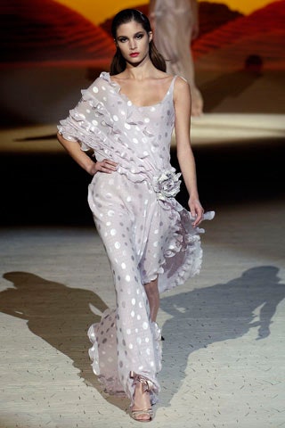 The show started with a beautiful sand-colored strapless gown, with a skirt made of soft, tiered silk ruffles that moved perfectly with each step. One of the most iconic pieces was a white silk jersey gown, with pleats running vertically and silver sequins trimming the frills, creating a soft shimmer. The collection featured delicate florals and pouf sleeves, which gave the pieces a vintage feel, but with a modern twist. Silk chiffon was used throughout, draping elegantly around the body in soft, fluttery panels that seemed to float. The beading, especially on tulle, added a touch of luxury, making each piece feel so refined. Valentino perfectly captured the mix of sexy and elegant.