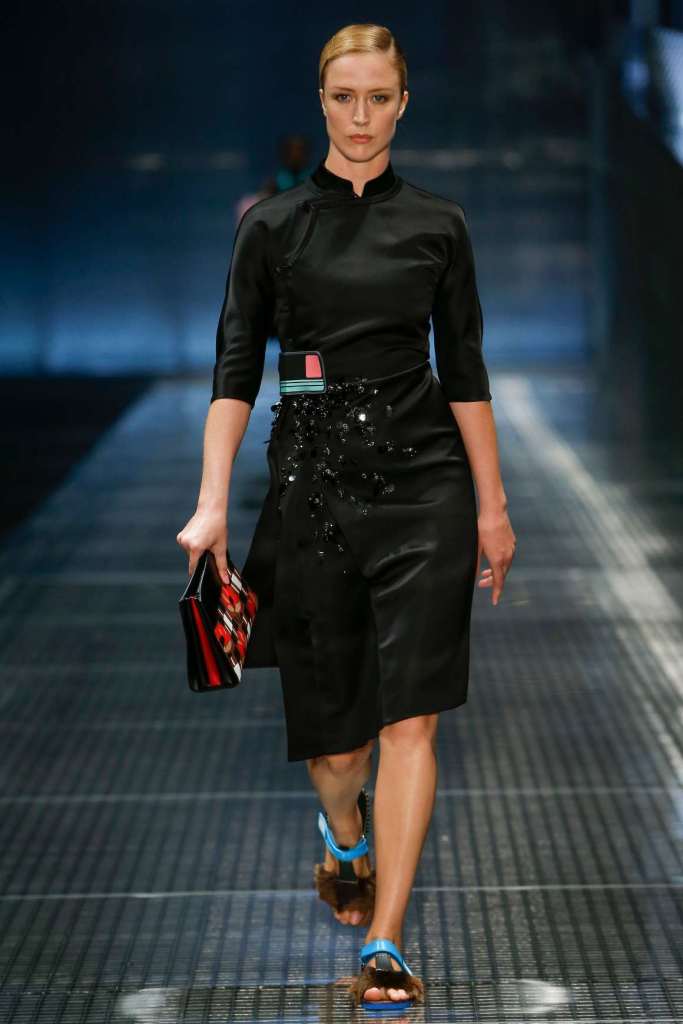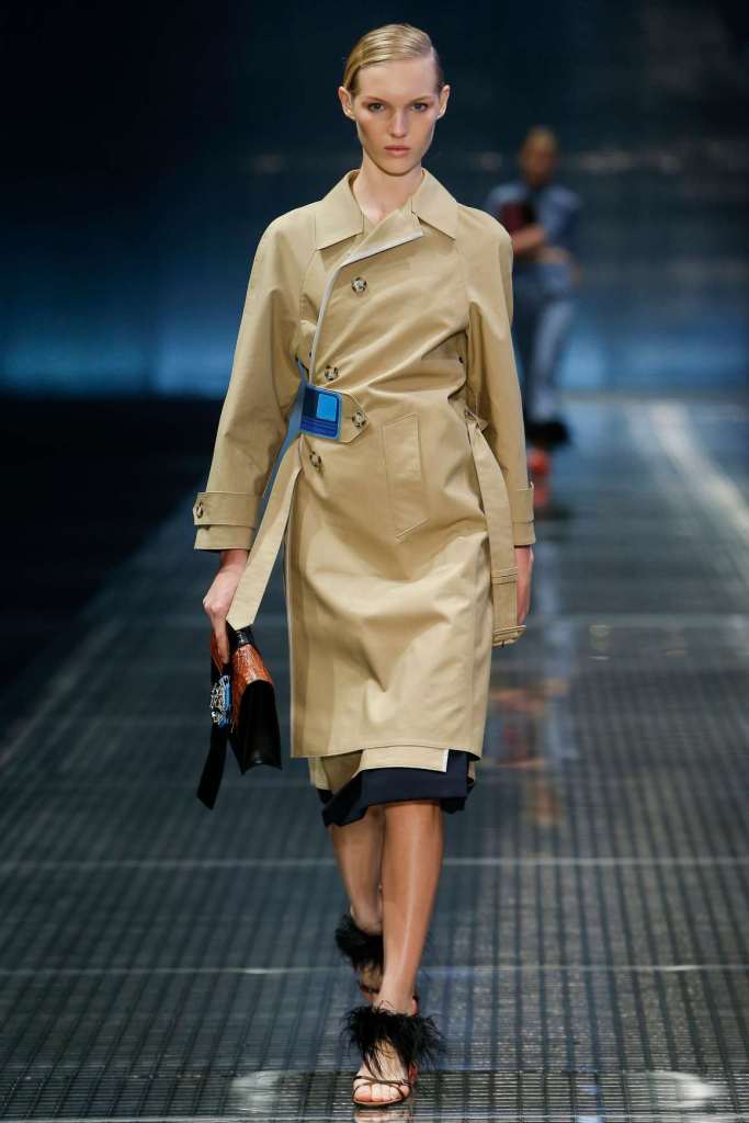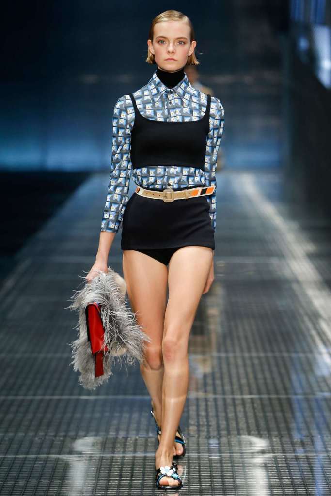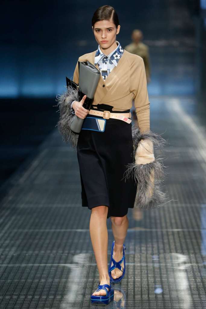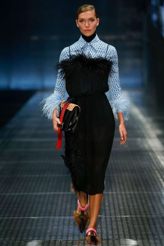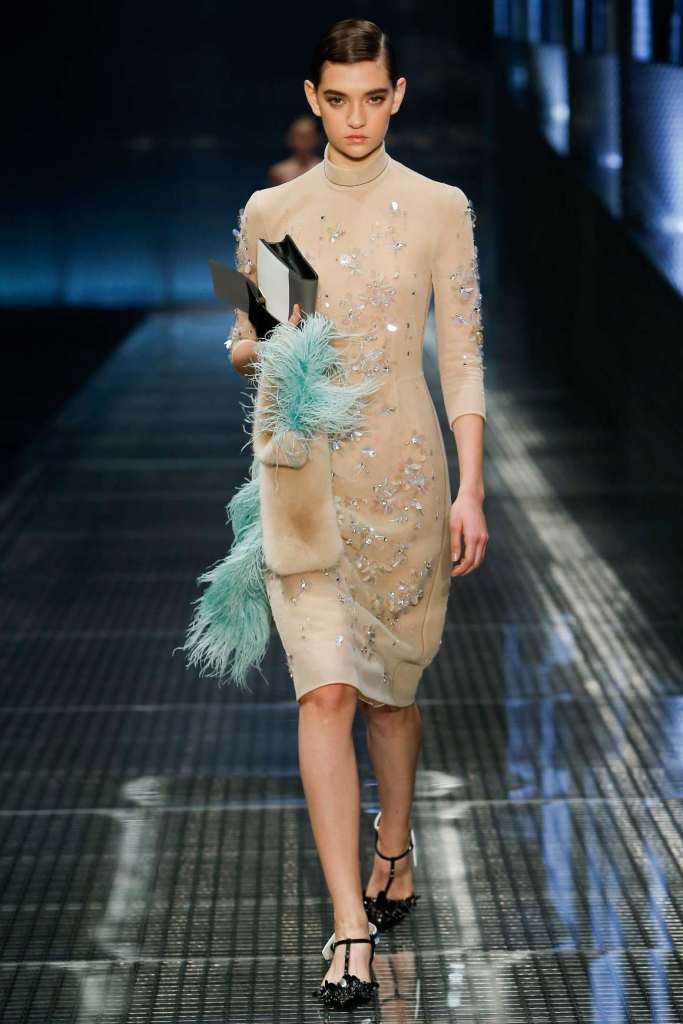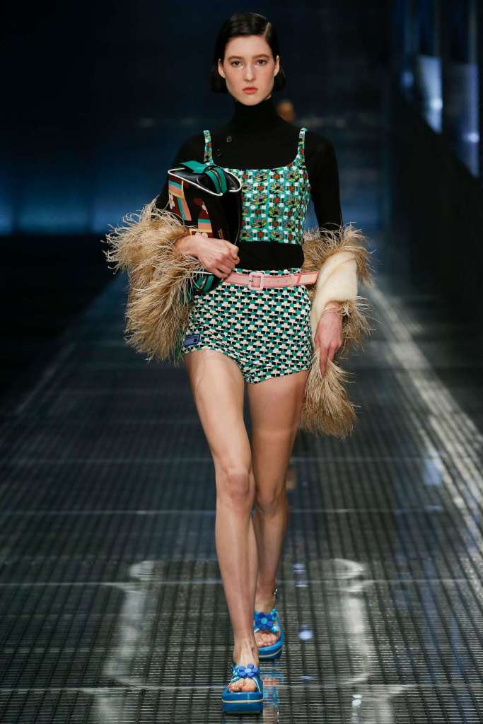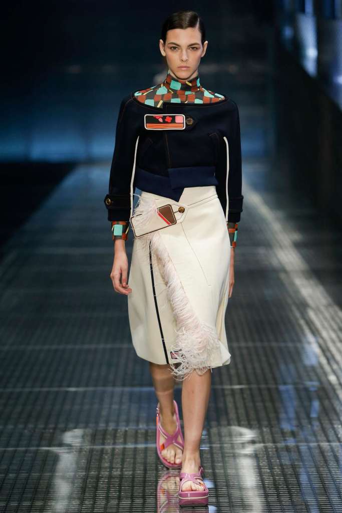 What stood out most were the subtle nods to Prada’s past: ’90s minimalism, Deco-graphic prints, and even the high-waisted knickers reminiscent of 1940s stars like Betty Grable. But the true show-stealers were the extravagant details—ostrich feathers, marabou trimmings, and diamanté sparkles—that transformed everyday pieces into something extraordinary. A beige lemony wrap skirt, paired with a feather-trimmed coat, exemplified the effortless chic Prada is known for.