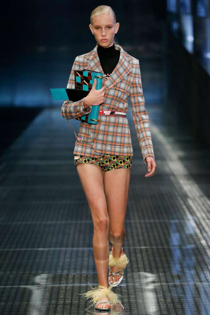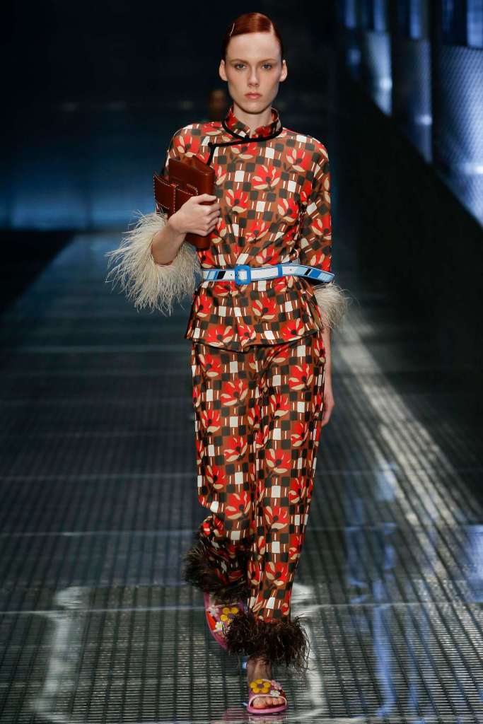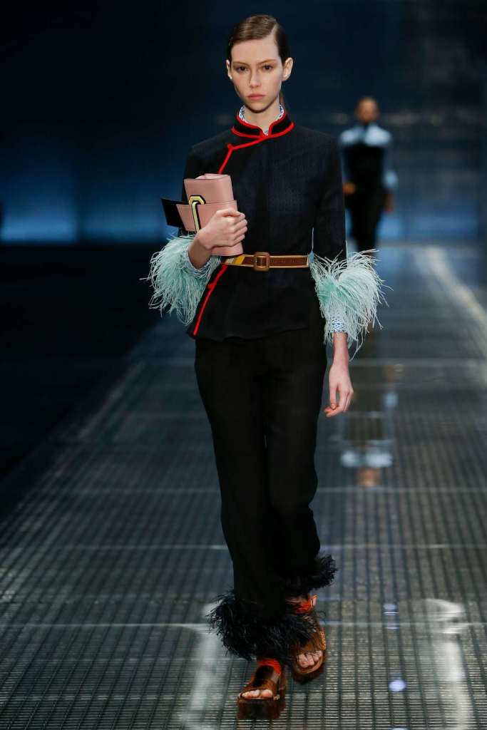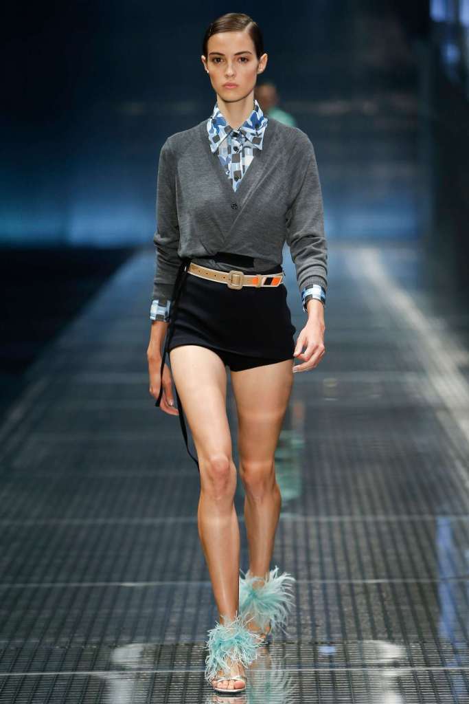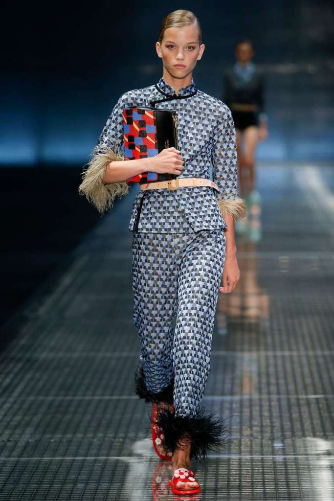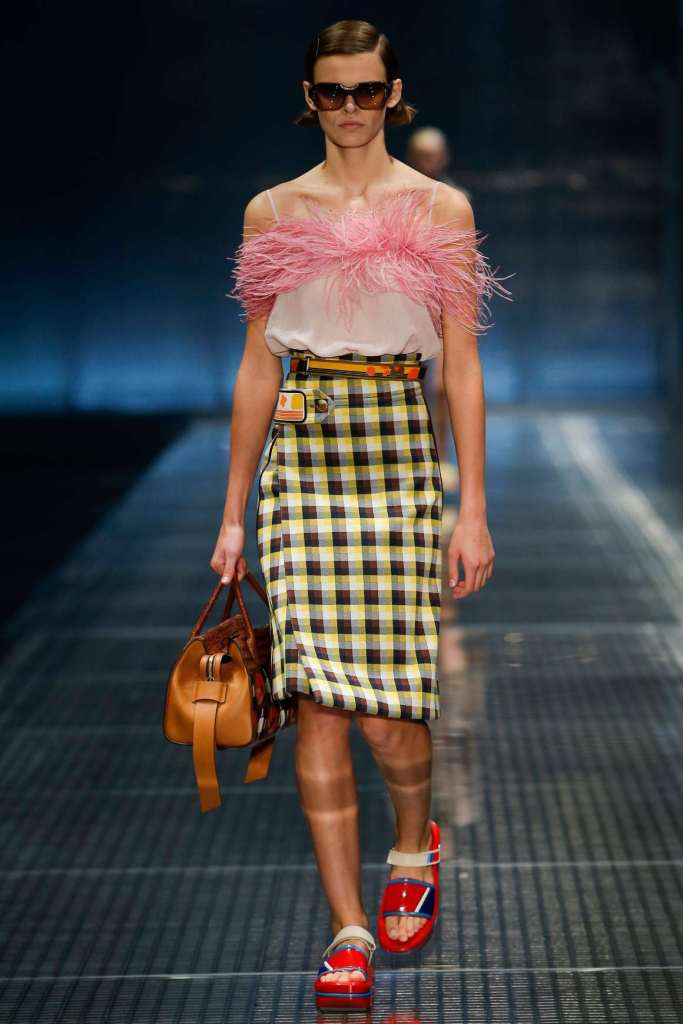 The footwear mirrored this blend of nostalgia and modernity. Kitten heels with feathered ankle trim evoked classic Hollywood glamour, while the clunky, embellished shoes gave a more contemporary edge. Prada’s use of ostrich feathers throughout the collection added a luxurious touch to minimalist silhouettes, from chic pajama-style eveningwear to plaid blazers paired with cotton candy-colored skirts.