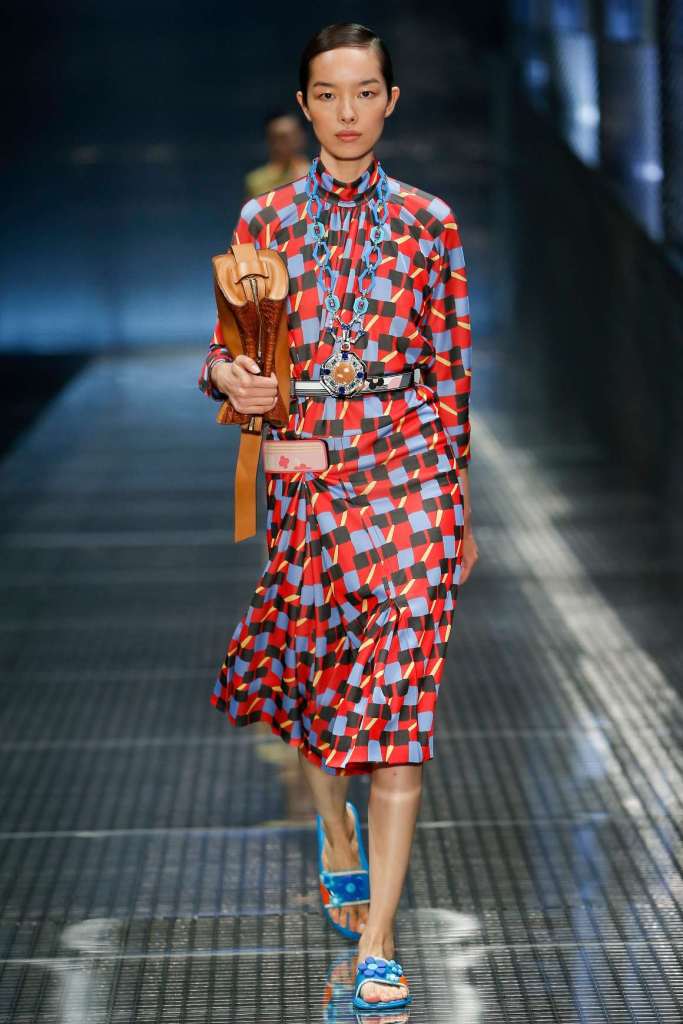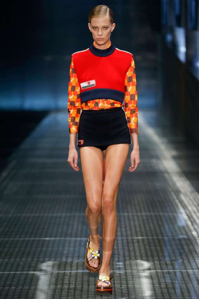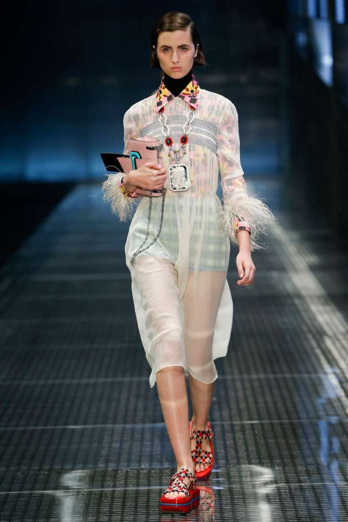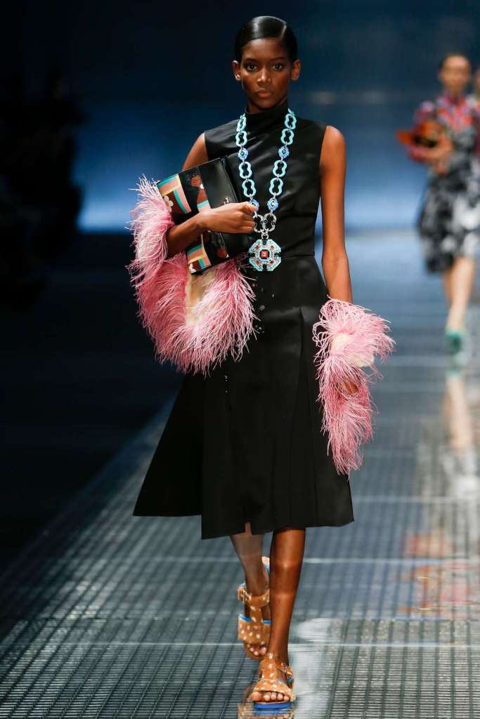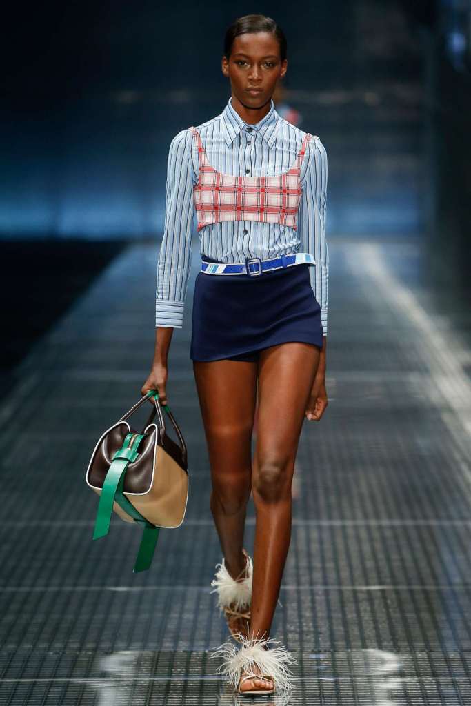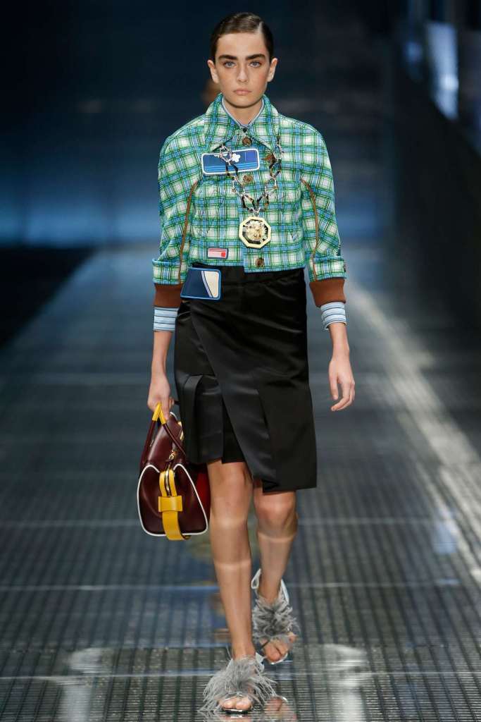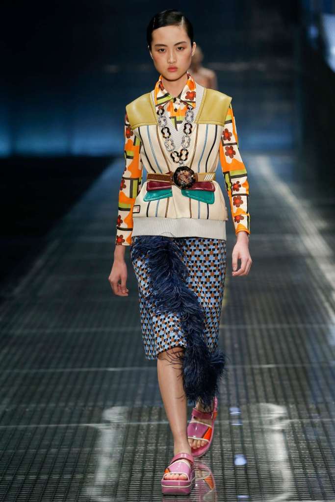 The footwear mirrored this blend of nostalgia and modernity. Kitten heels with feathered ankle trim evoked classic Hollywood glamour, while the clunky, embellished shoes gave a more contemporary edge. Prada’s use of ostrich feathers throughout the collection added a luxurious touch to minimalist silhouettes, from chic pajama-style eveningwear to plaid blazers paired with cotton candy-colored skirts.