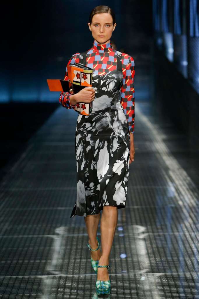 There was also an unexpected mixture of old and new. Retro plaid jackets were paired with modernistic touches like a floral dress worn over a printed button-up, or a feather-trimmed skirt matched with a leather peacoat. The mix felt fresh and playful, though some pieces, like turtleneck coats or high kimono collars, might not have been for everyone.