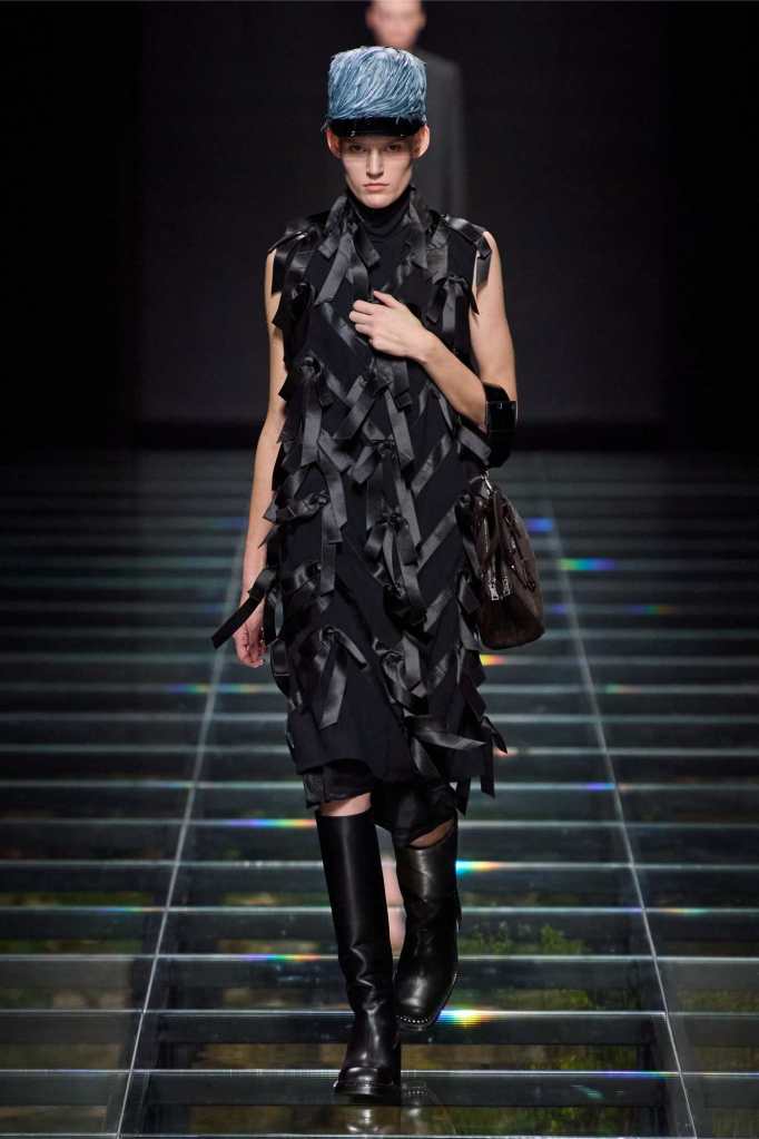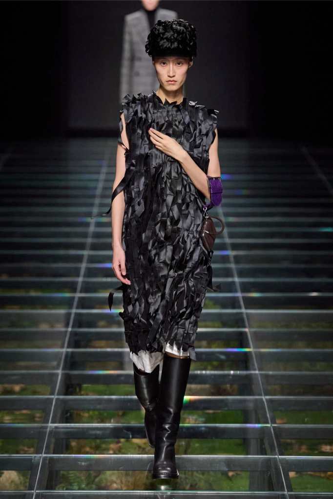 The standout feature of the collection is the use of bows, which playfully challenge traditional notions of femininity. Bows are typically seen as symbols of softness and grace, but Prada and Simons transform them into something more complex. From simple bows adorning black shift dresses to intricate, multicolored ribbons on skirts, they encourage us to question why these feminine clichés persist. The designers don’t shy away from presenting these bows alongside strong, structured pieces like leather jackets and tailored wool overcoats, offering a dynamic contrast between softness and strength.