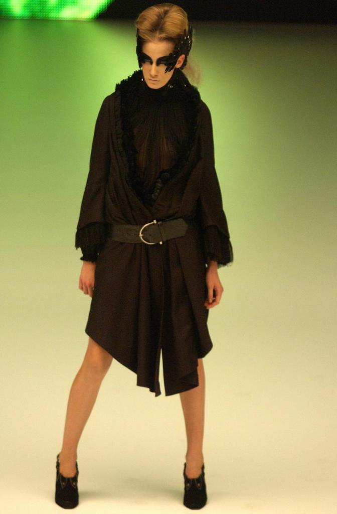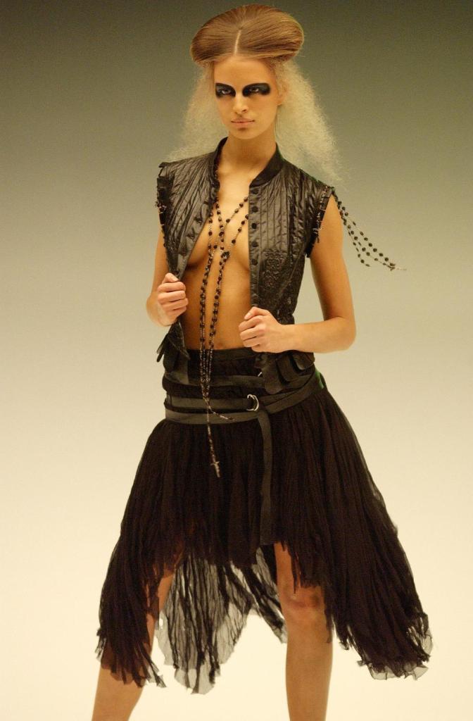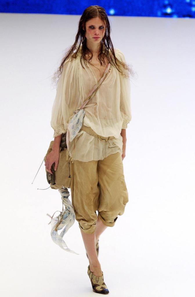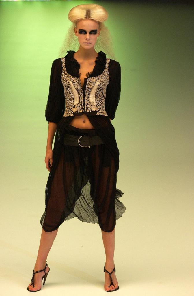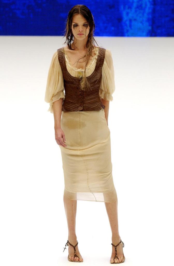 The show opened with shipwrecked pirates emerging from the chaos of the sea. Models, styled with smeared makeup and wet hair, wore ruffled tops, leather corsets, and distressed fabrics, evoking Elizabethan adventurers battered by waves. The standout look was the “oyster dress,” a masterpiece of layered organza resembling a deconstructed seashell—a poetic nod to survival amidst turmoil.