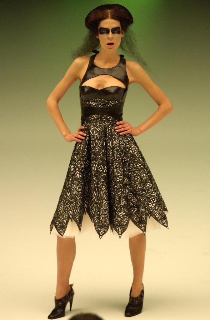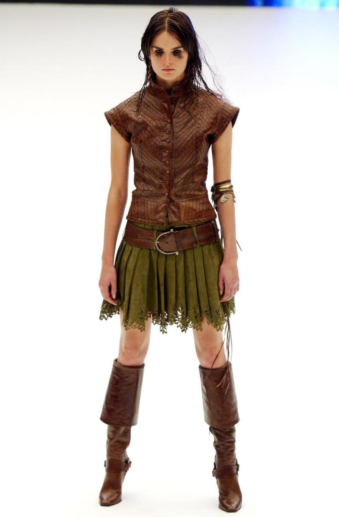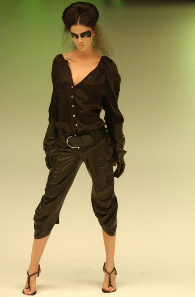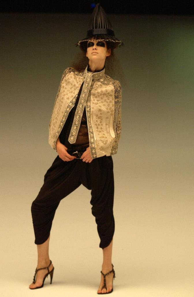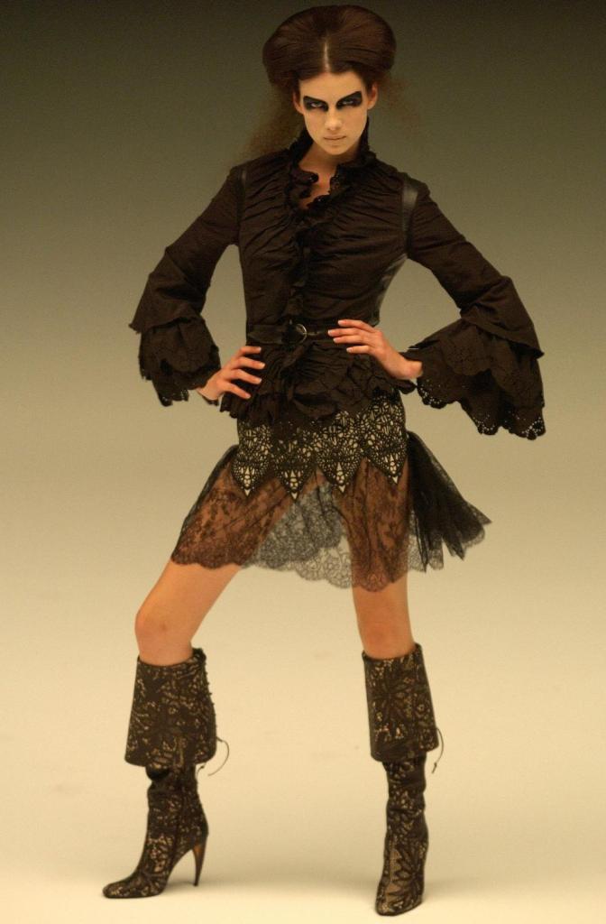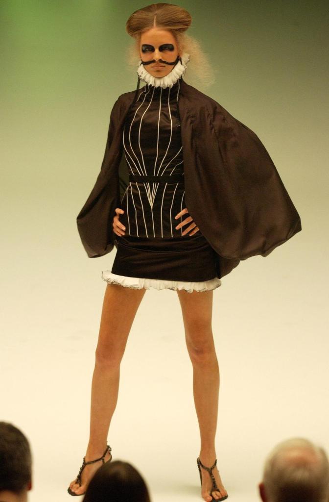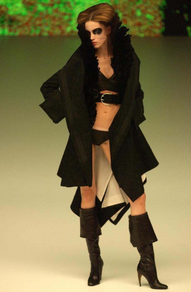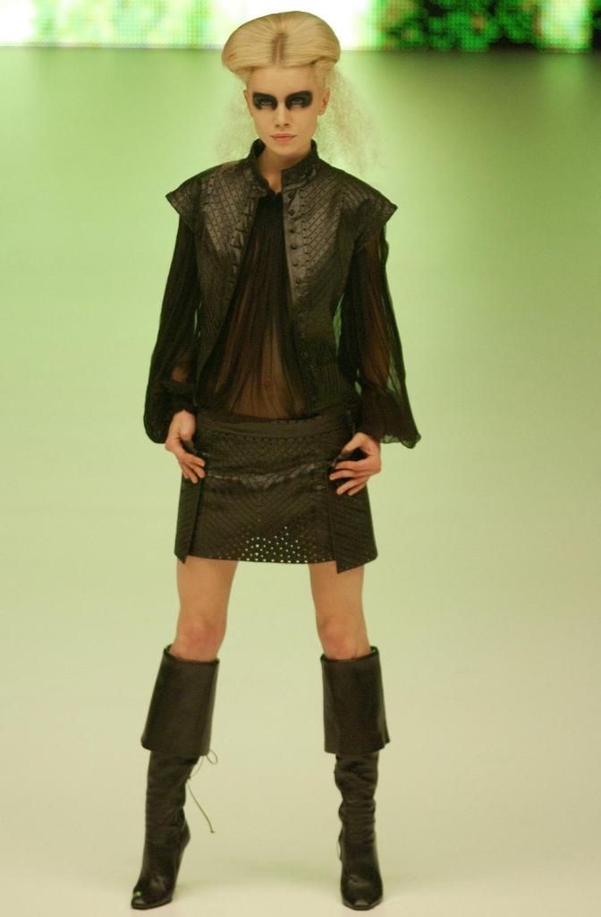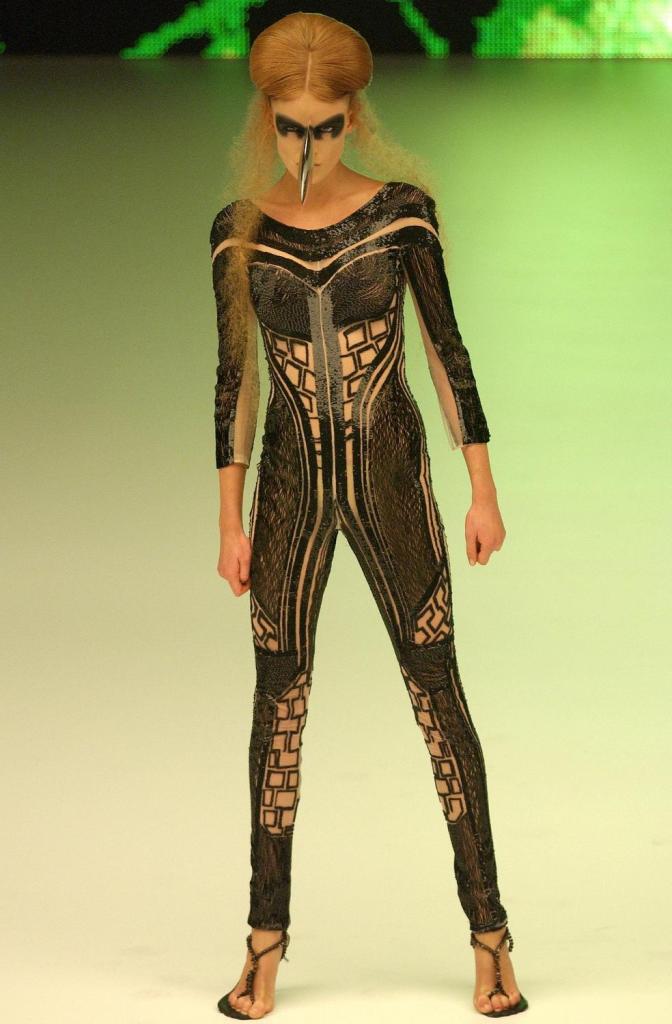 The second phase shifted into darker territory, with models donning black ensembles inspired by Spanish and Portuguese conquistadors. Snake-printed and laser-cut details added a menacing edge. While this section felt visually cohesive, it lacked the vibrancy that defined McQueen’s storytelling.