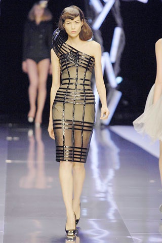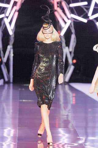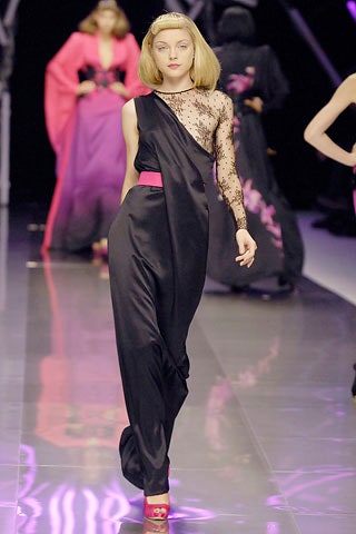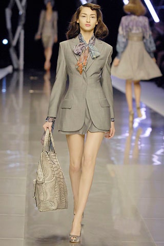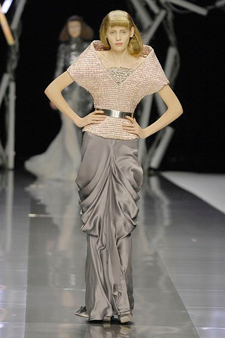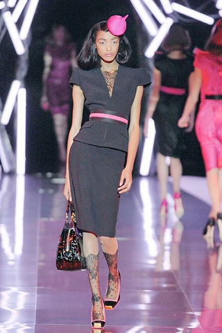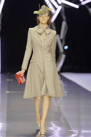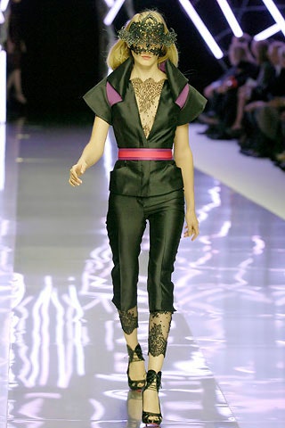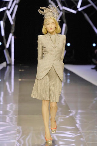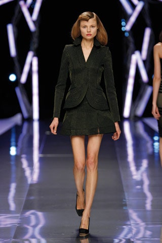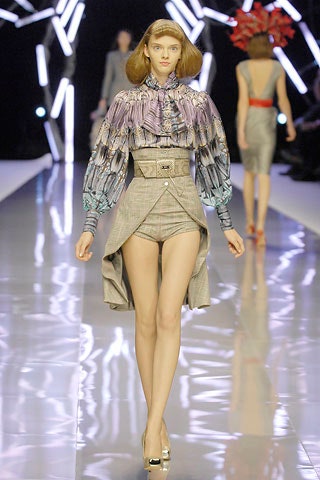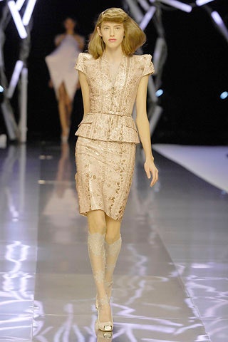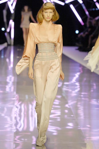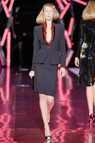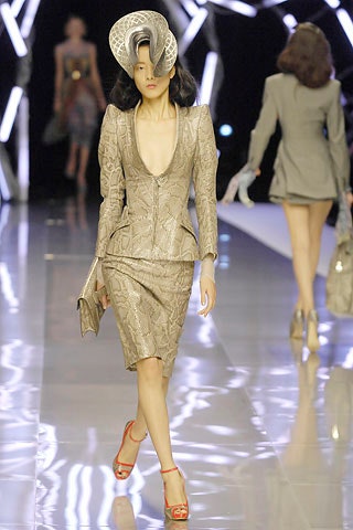 Savile Row tailoring formed the foundation, with sharply cut jackets in Prince of Wales checks and strong, exaggerated shoulders that radiated power. Wide belts cinched waists, emphasizing dramatic hourglass silhouettes that hinted at Blow’s penchant for bold statements. Dresses with molded hips and sleek black skirt suits in exotic reptile skins added a layer of sleek modernity to the lineup.