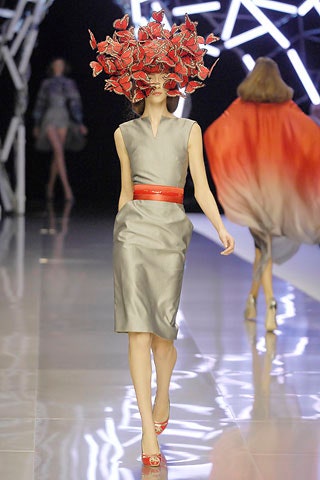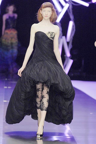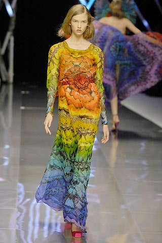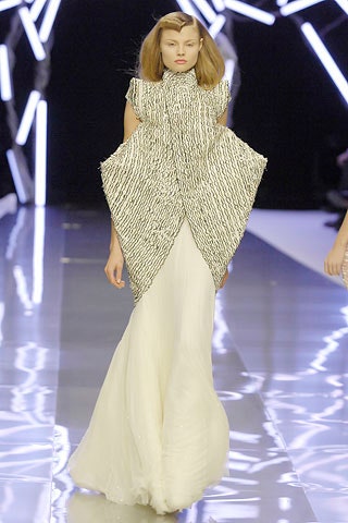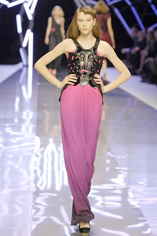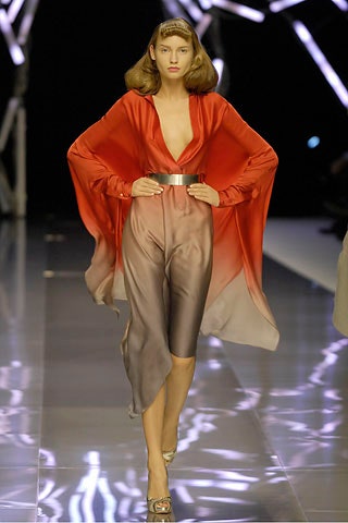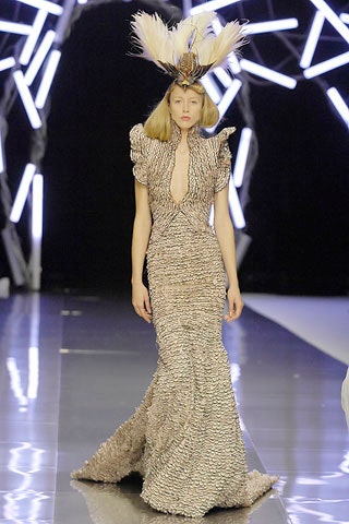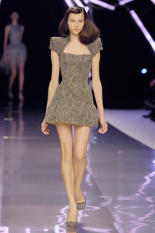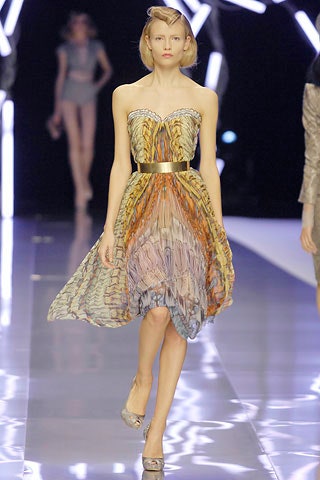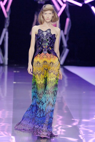 But McQueen’s romantic side shone through as well. Gowns in floating silk chiffon and organza swept the runway, embellished with ombré bird-of-paradise prints and delicate pleating that moved like wings in flight. These lighter pieces contrasted beautifully with the grounded strength of structured tailoring, showcasing McQueen’s duality as a designer.