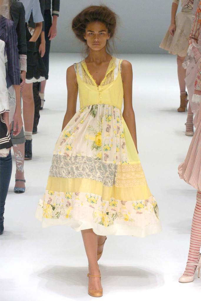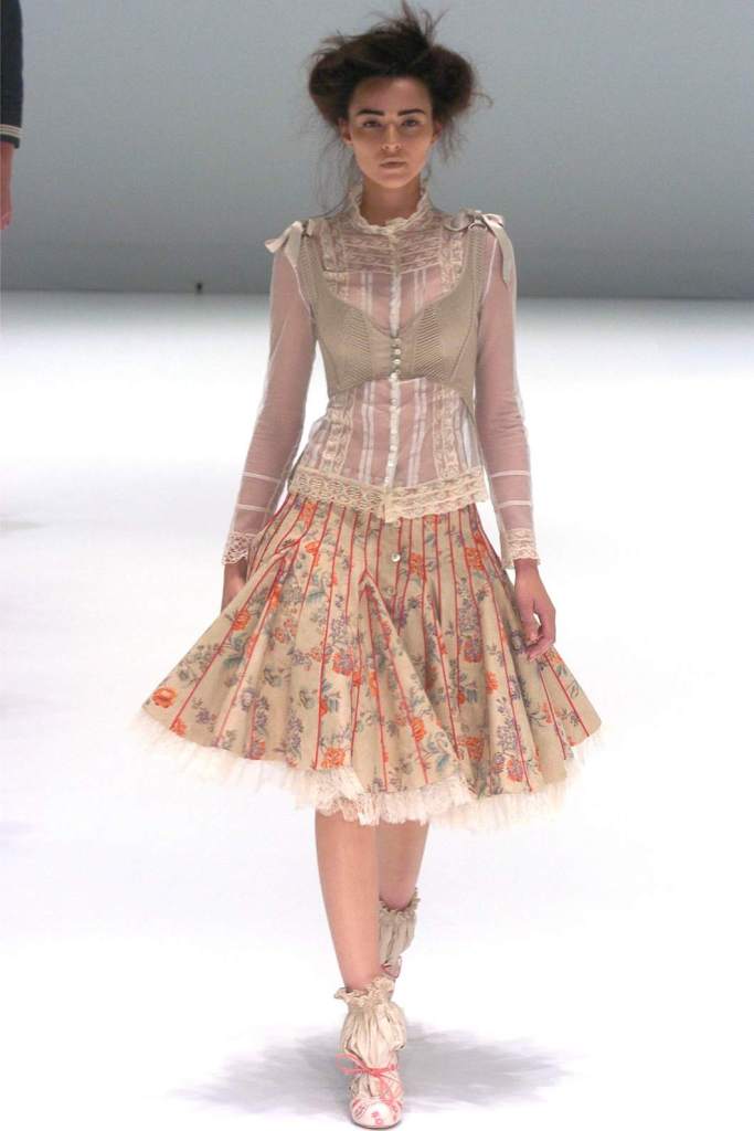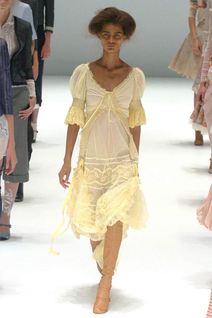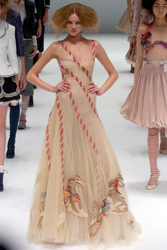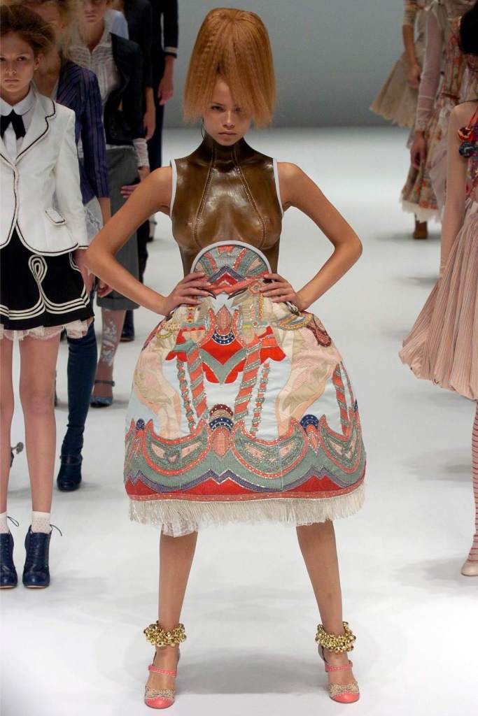 The use of texture and embellishment was impeccable. Floral embroidery, candy-striped puffball skirts, and chiffon dresses floated down the runway, while sculptural leather pieces showcased McQueen’s mastery of tailoring. Delicate lace dresses contrasted with bold, structured silhouettes, creating a collection that was equal parts romantic and powerful.