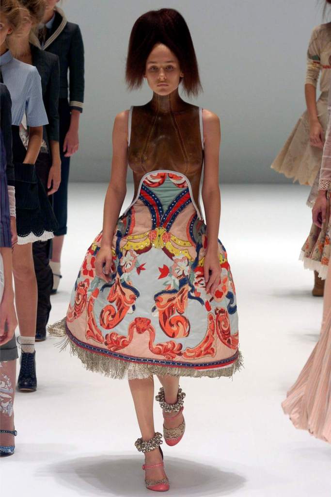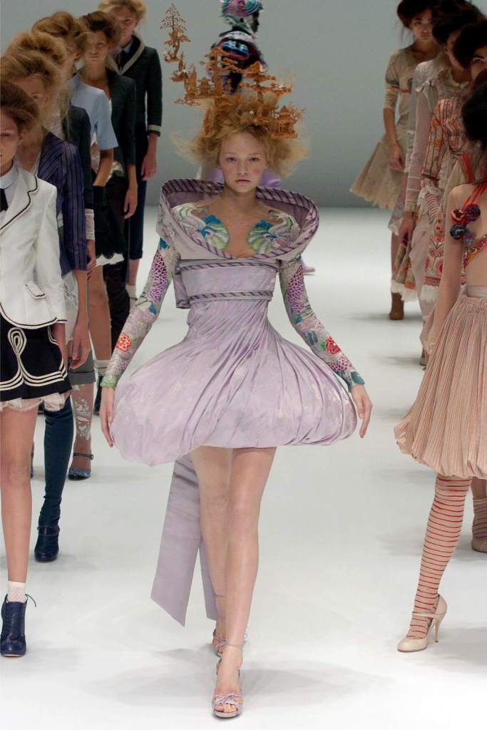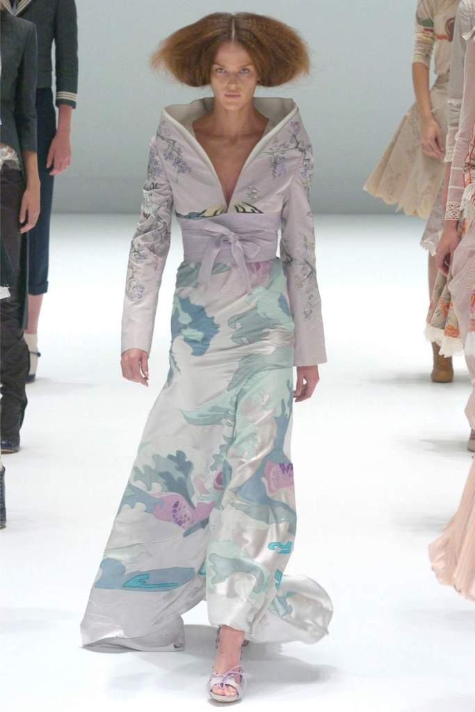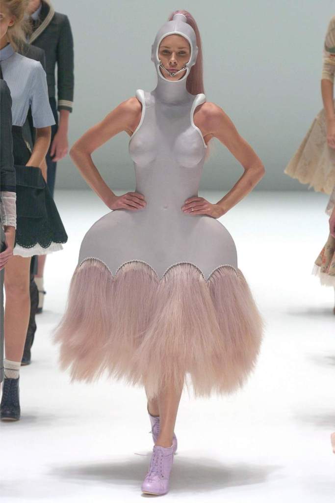 As the collection progressed, McQueen’s dramatic flair took center stage. Molded corsets, some adorned with horsehair, echoed his earlier Eshu collection but were softened with updated details. Intricate kimonos and garments featuring traditional Japanese motifs demonstrated his skill at merging cultural influences. Meanwhile, American football-inspired looks—complete with ornate helmets and shoulder pads—offered an unexpected yet striking contrast.