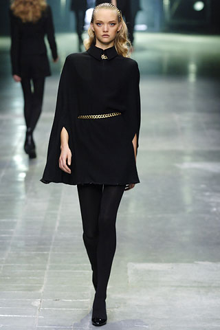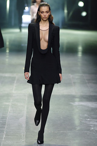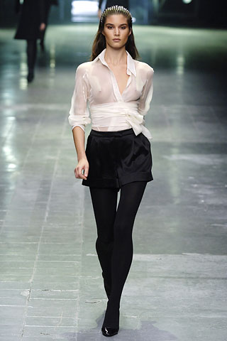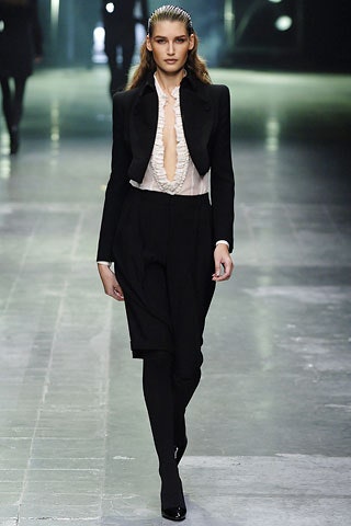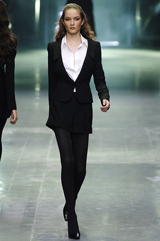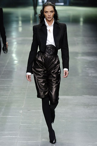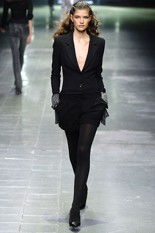 The show started with sleek black outfits, like tailored jackets paired with short skirts, shorts, and tights. These looks had a cool, slightly rocker vibe but were simple enough to wear off the runway. The dramatic cuts and bold shapes McQueen was known for were toned down, replaced with a more understated style.