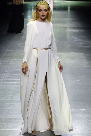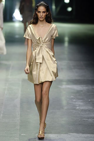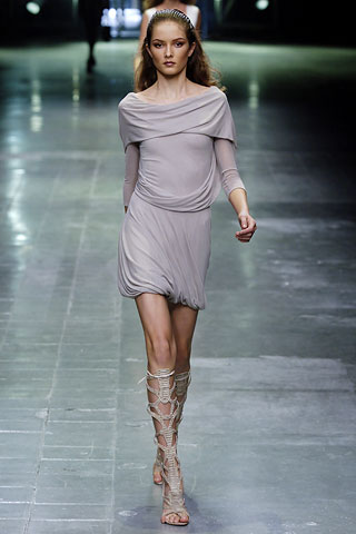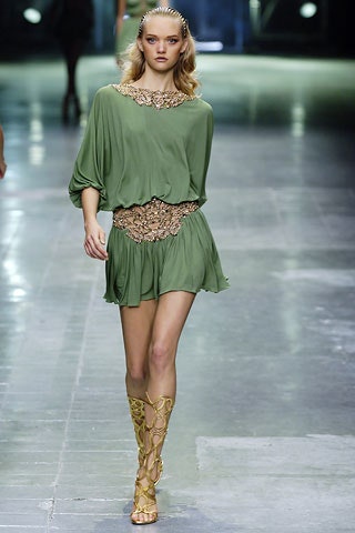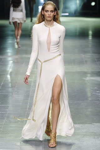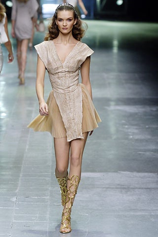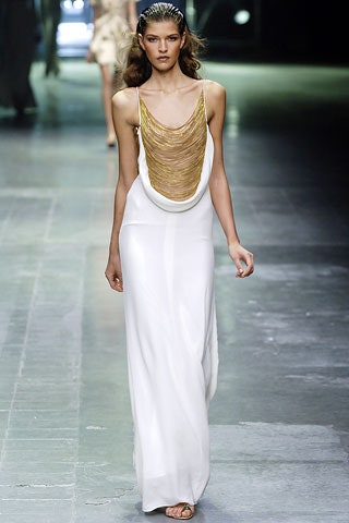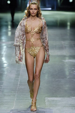 For eveningwear, McQueen looked to Greek goddesses, but the results didn’t quite hit the mark. Shiny dresses, crystal details, and gold wraps felt more like costumes than the show-stopping creations fans expect from him. Even the metal body pieces, which were meant to wow, felt a little clunky.