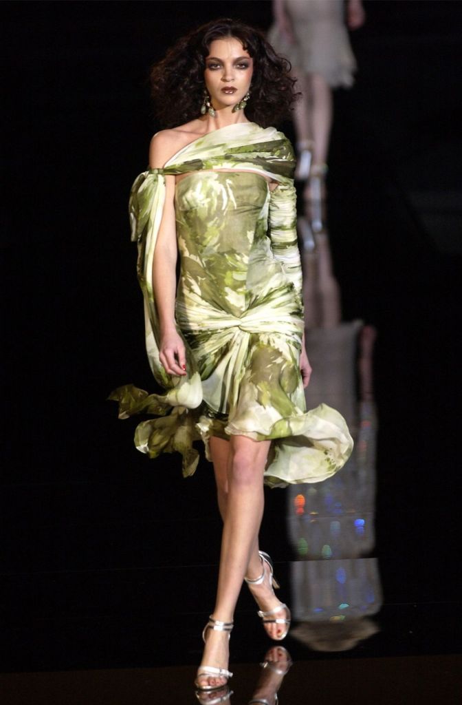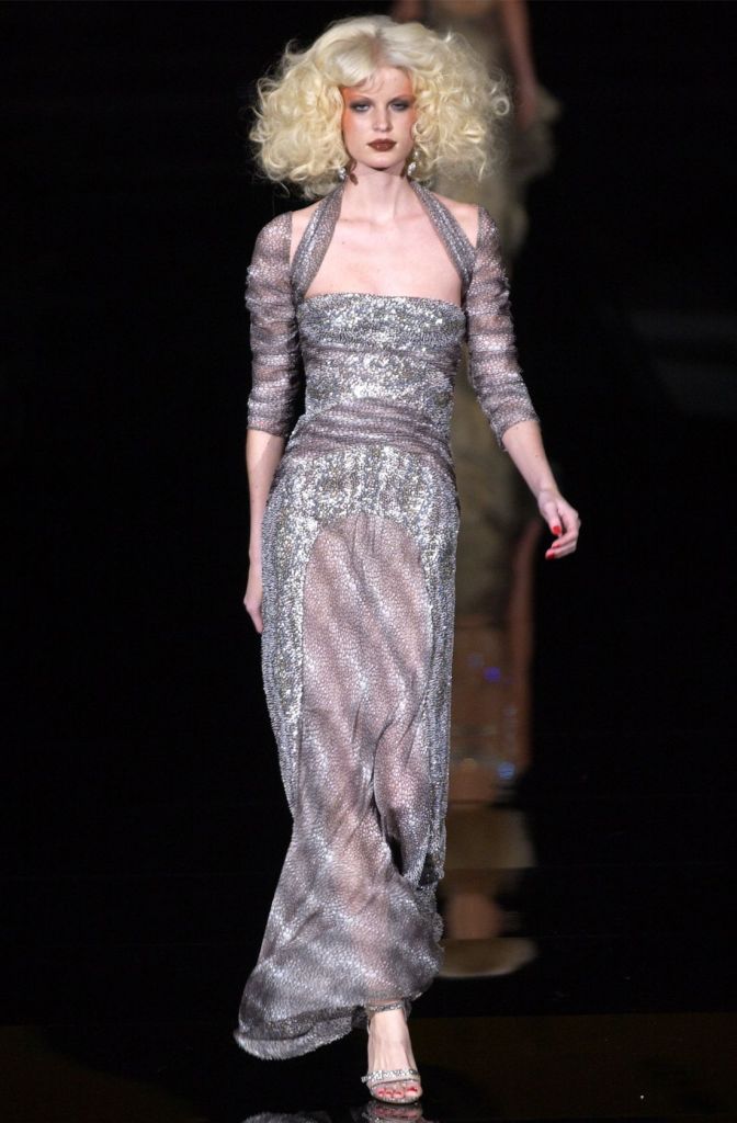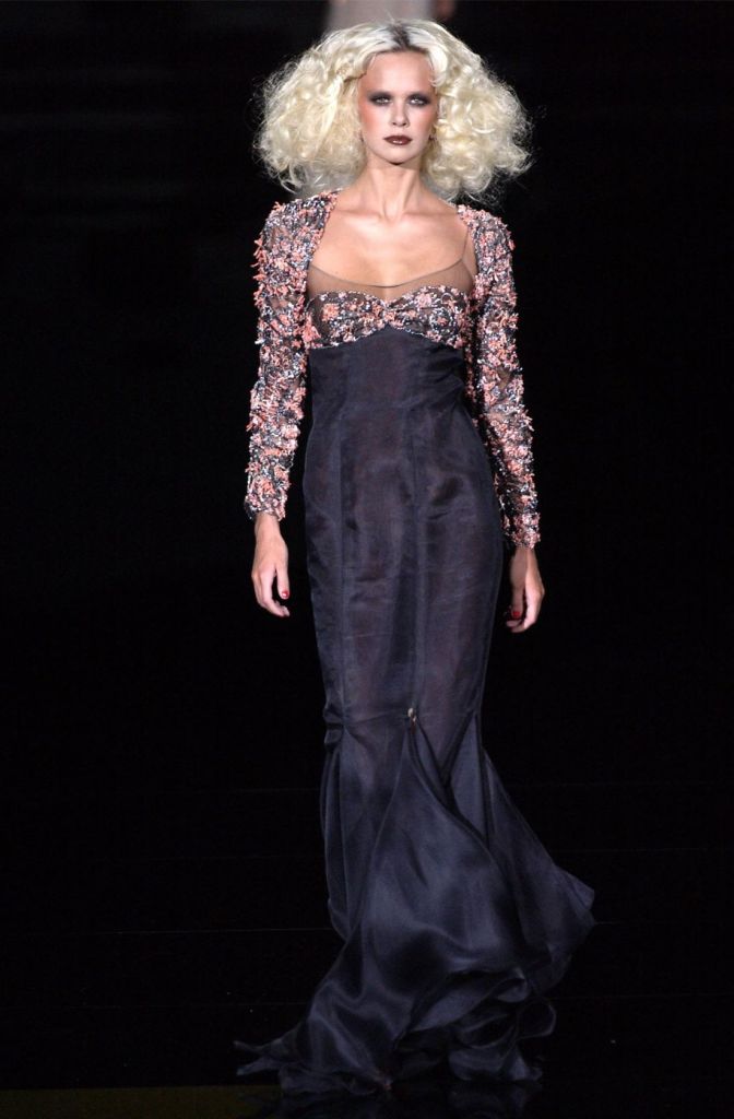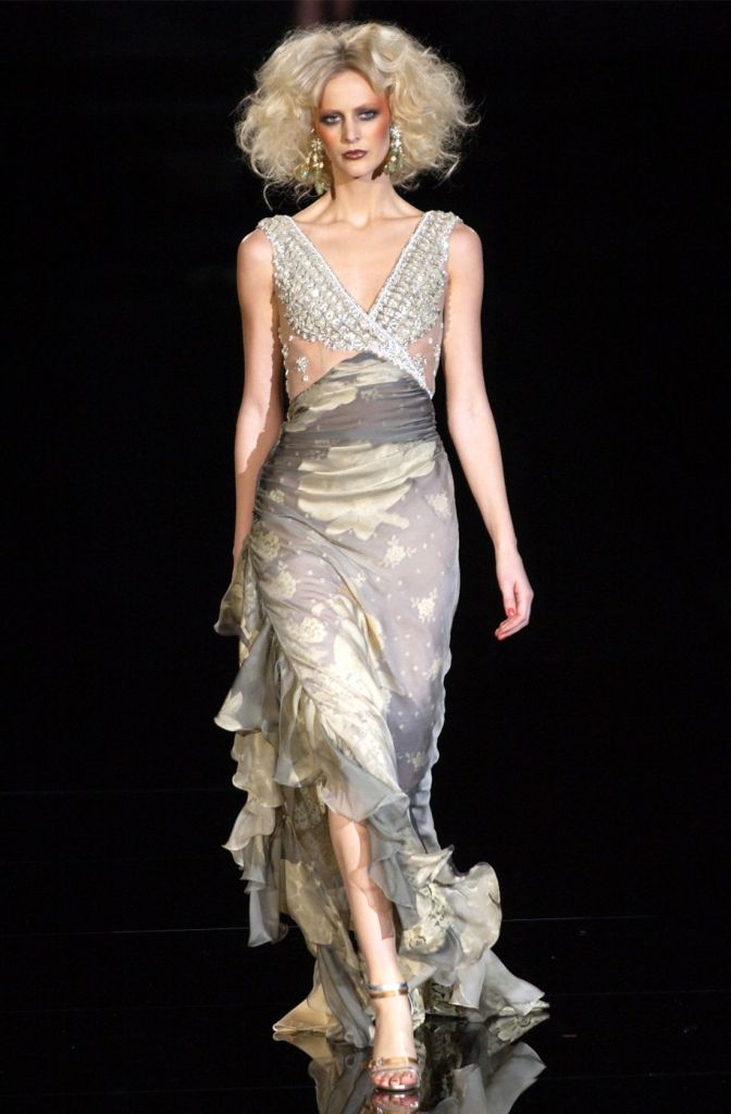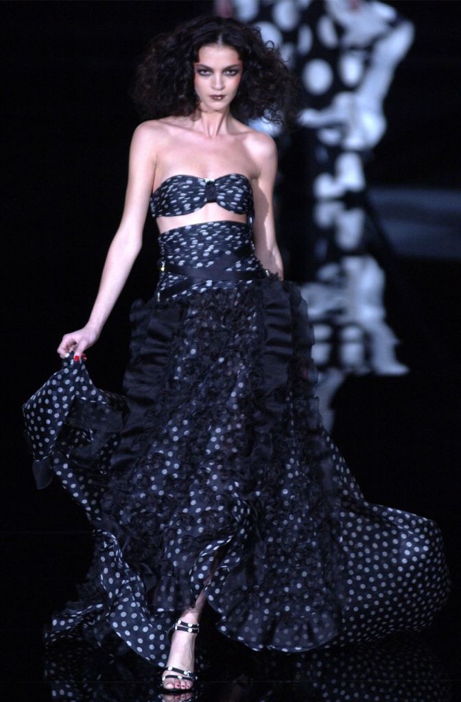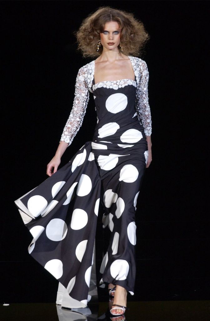 Known for his romantic bows, lace, and refined suits, he brought a fresh twist this season by adding a bold touch of sex appeal. The models, with their seventies-inspired frizz and dramatic makeup, exuded confidence and playfulness. Valentino cleverly mixed delicate details like lace and bows with daring sheer fabrics, highlighting the décolleté and creating a seductive yet sophisticated vibe. While there were some traditional pieces, like flowered silk dresses, the collection felt modern and empowering.