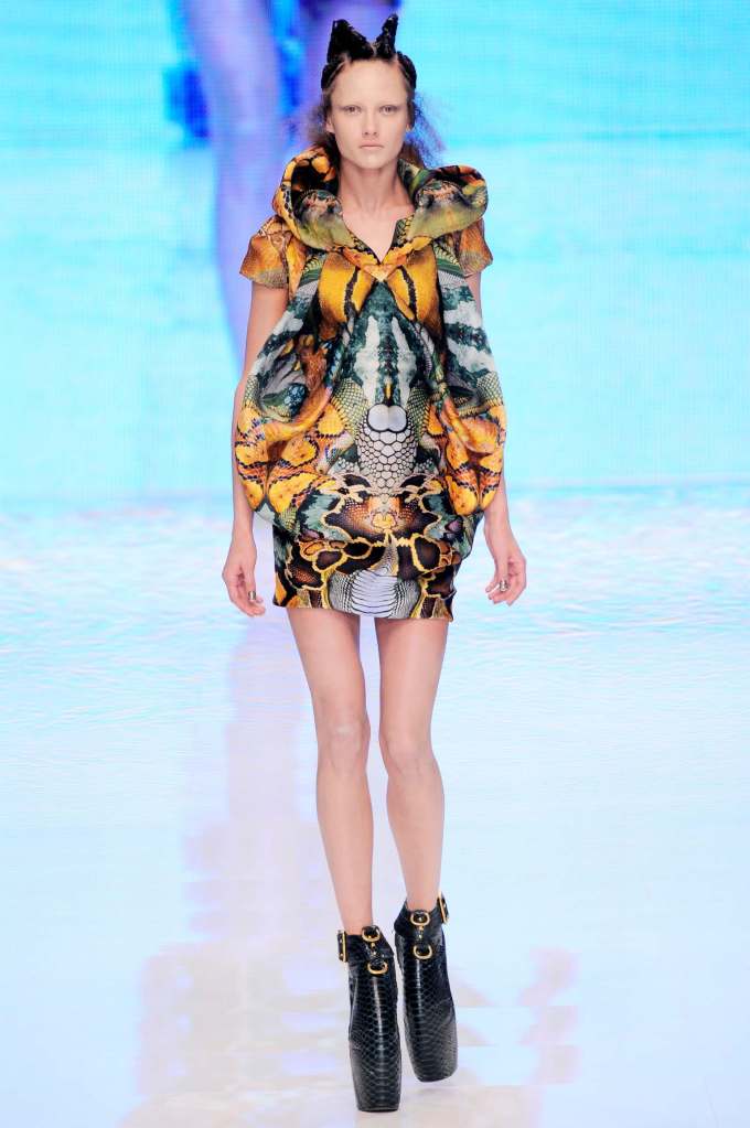 The runway itself was a spectacle: two robotic cameras mimicked submarine arms, panning over the audience and models. As the first model stepped onto the runway, wearing reptilian-printed, sculptural dresses, it was clear McQueen was pushing boundaries. The digitally printed garments transformed the models into otherworldly creatures, complete with prosthetic features and towering braided hairstyles, embodying the collection’s theme of human evolution into aquatic beings.