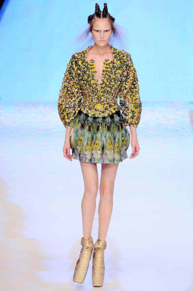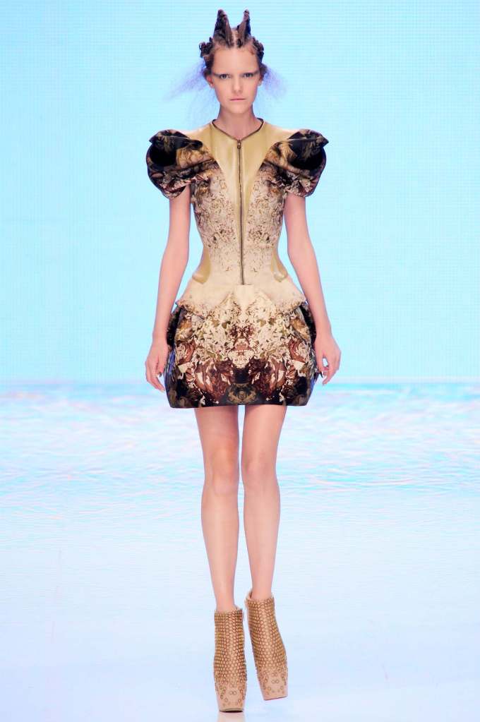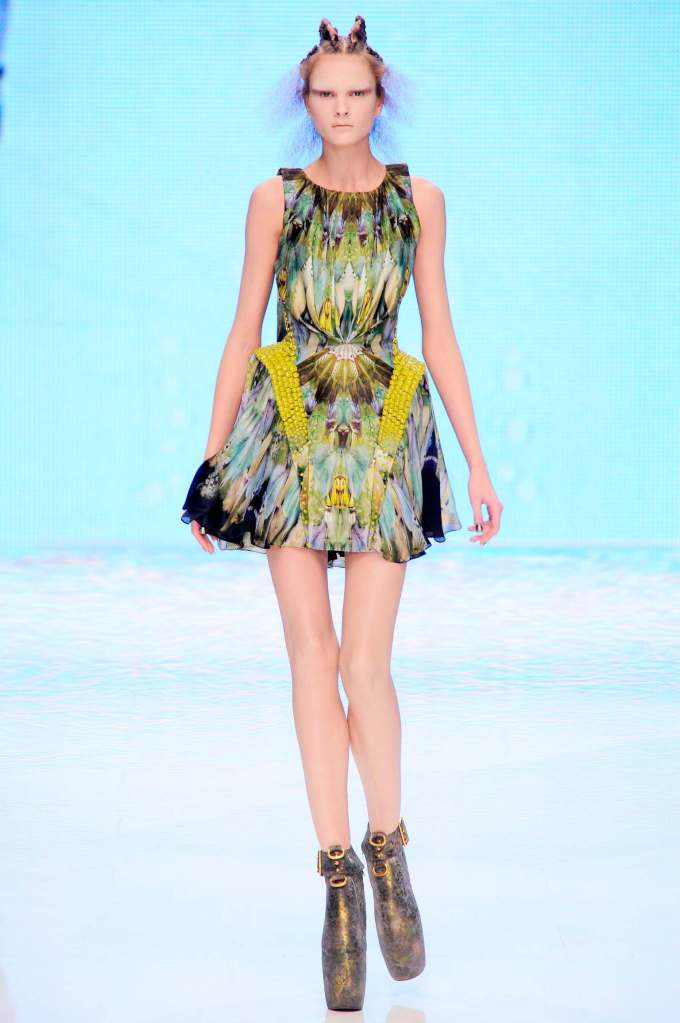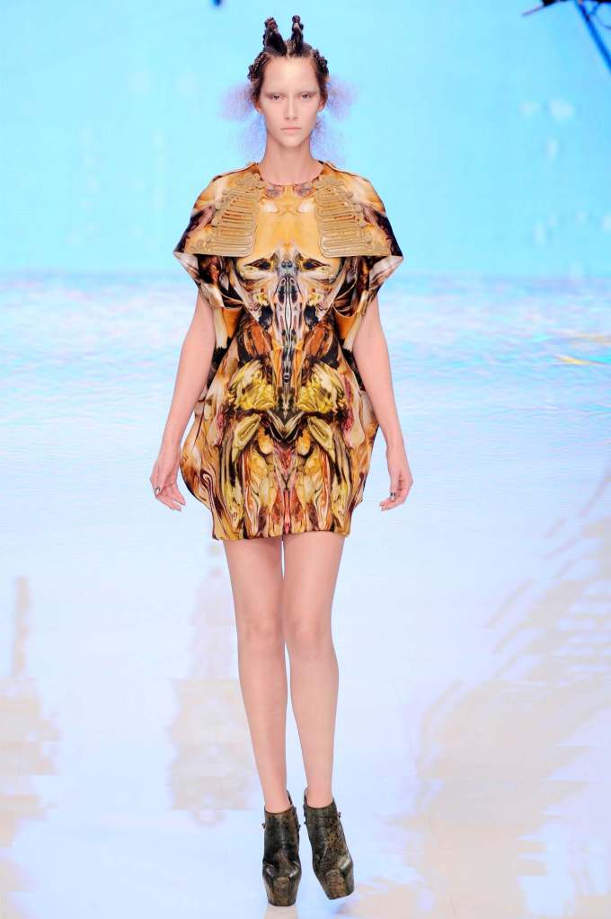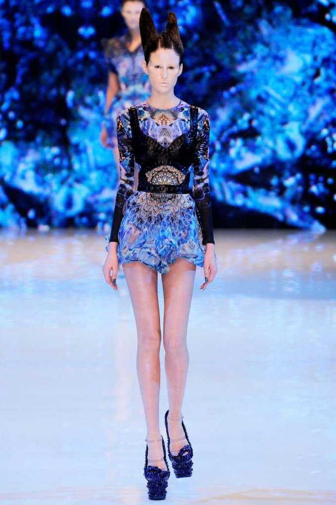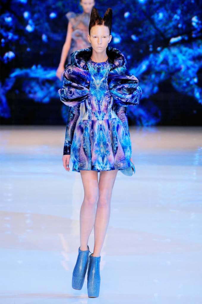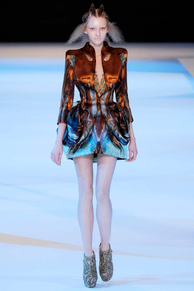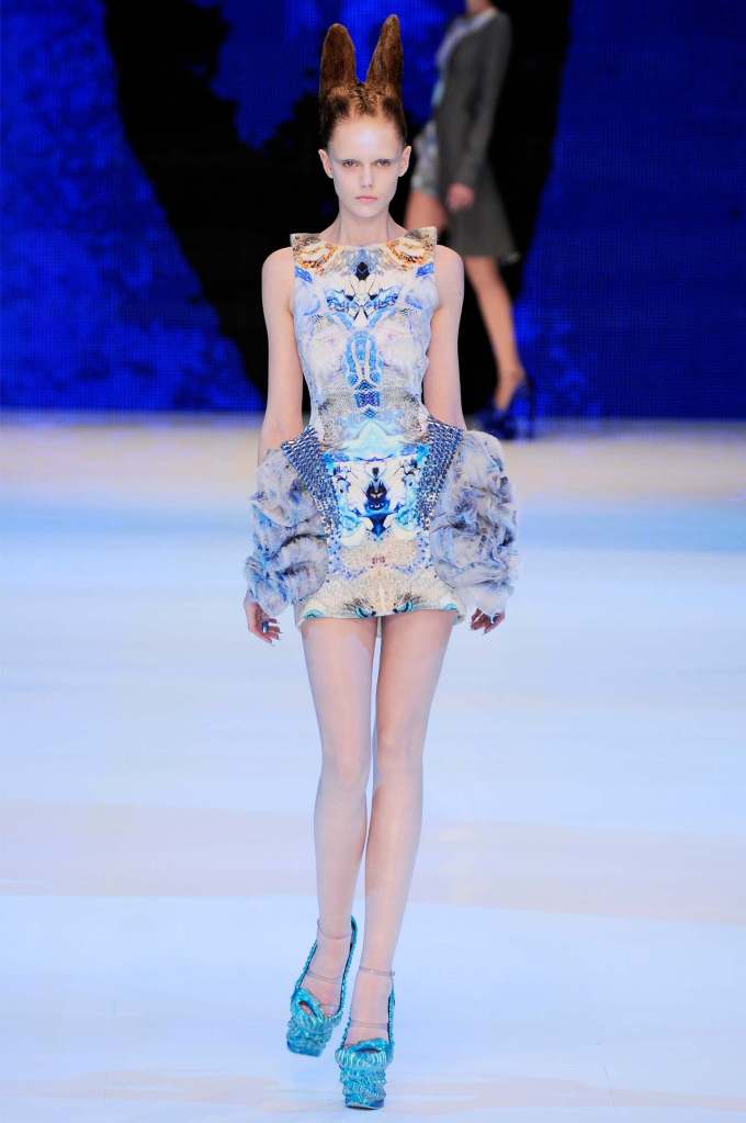 The collection’s palette transitioned from earthy greens and browns to oceanic blues and aquas, reflecting the narrative of land creatures returning to the sea. McQueen’s ability to merge storytelling with cutting-edge design made this collection a masterpiece.