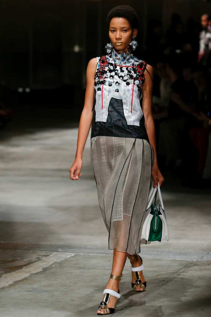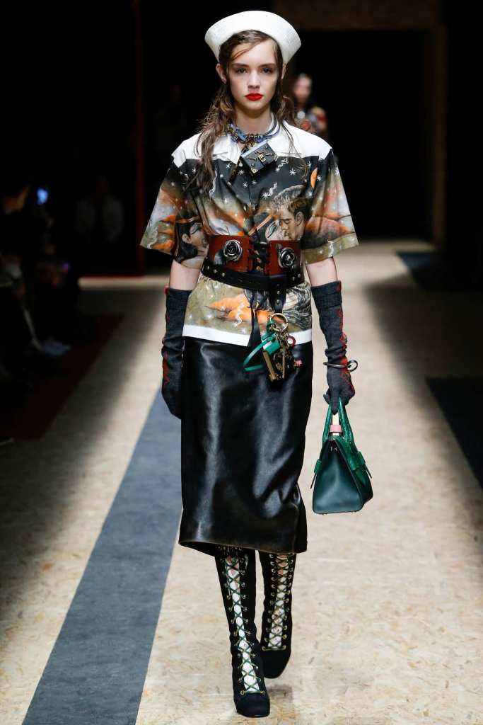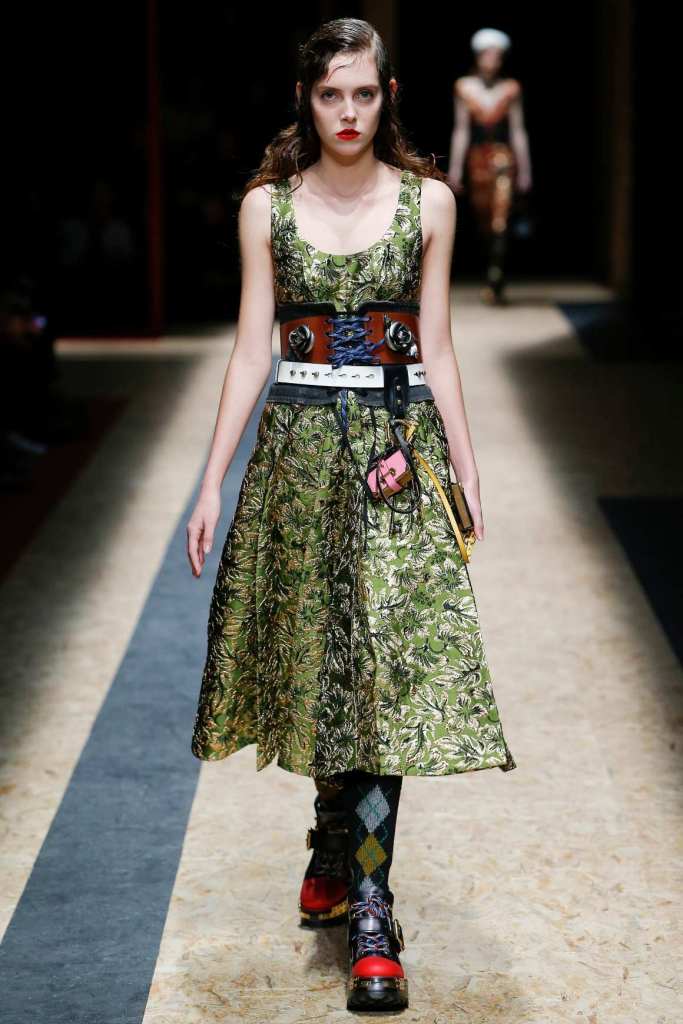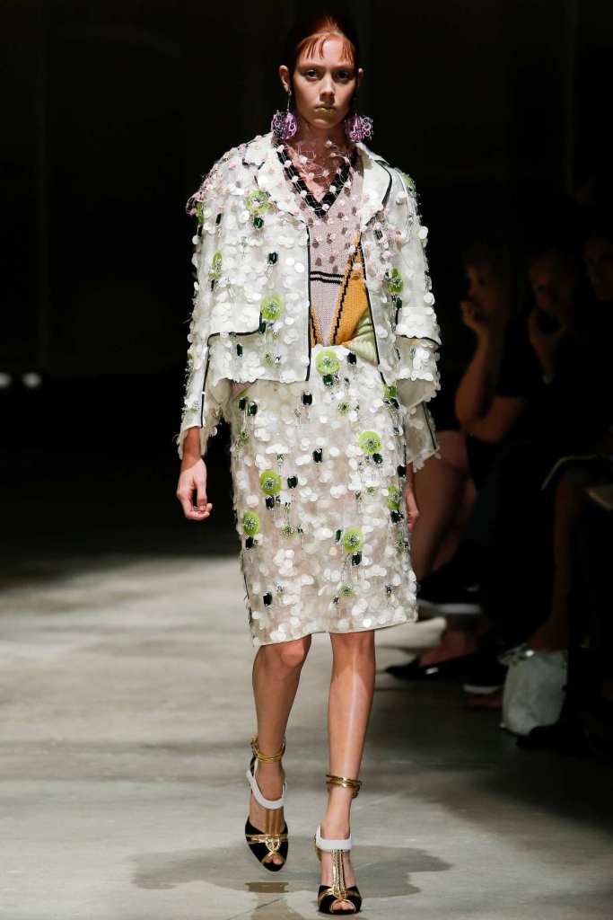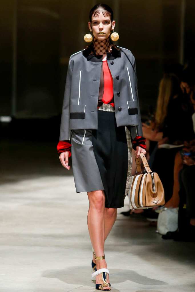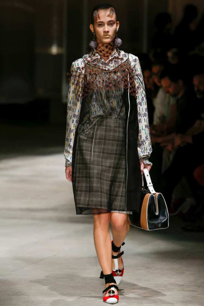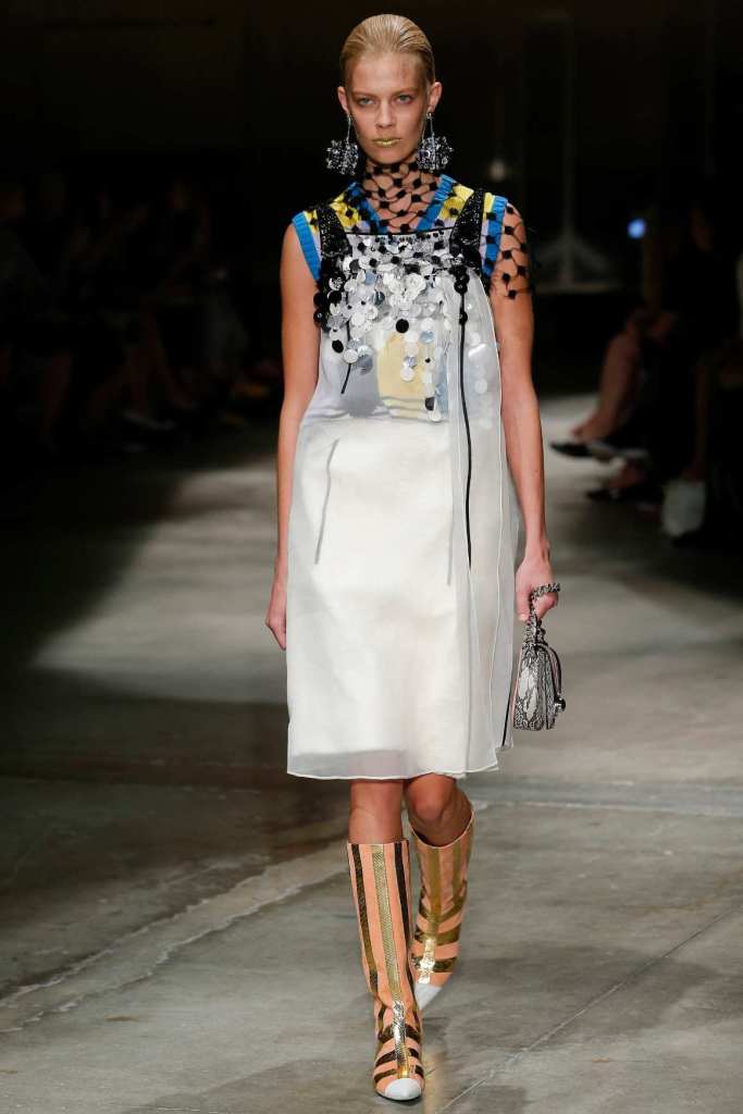 Accessories played a major role, with metallic boots, ankle-wrap flats, and statement collars adding to the collection’s overall impact. Earrings, often large and round like disco balls, added an extra layer of fun to each look. These quirky details made the collection feel both avant-garde and playful, capturing the spirit of the Prada woman—confident, stylish, and never afraid to stand out.