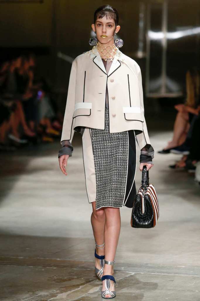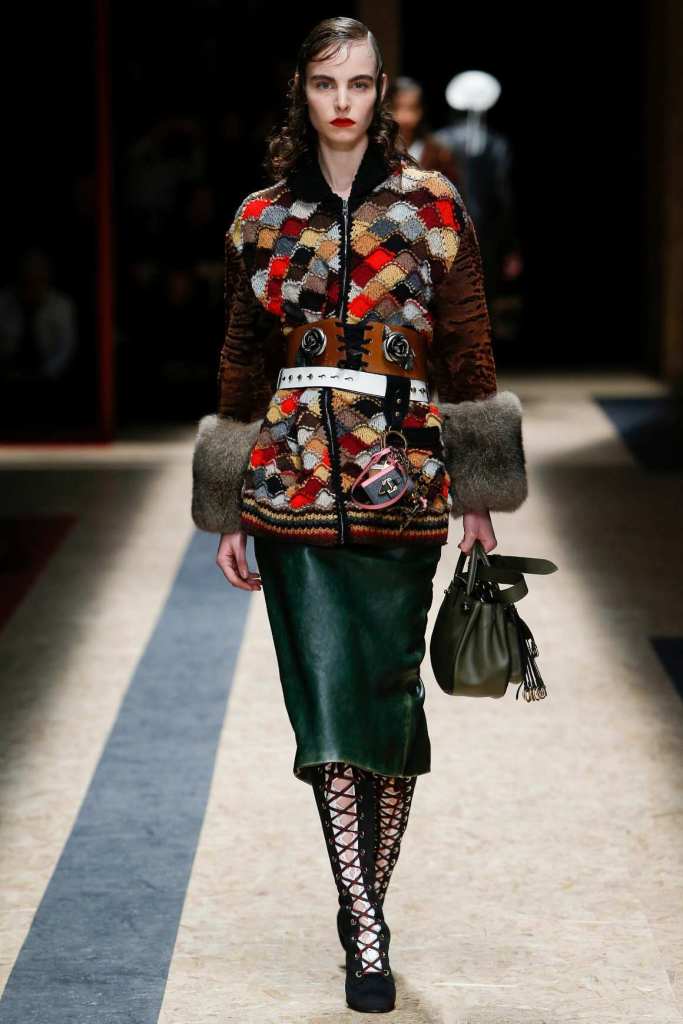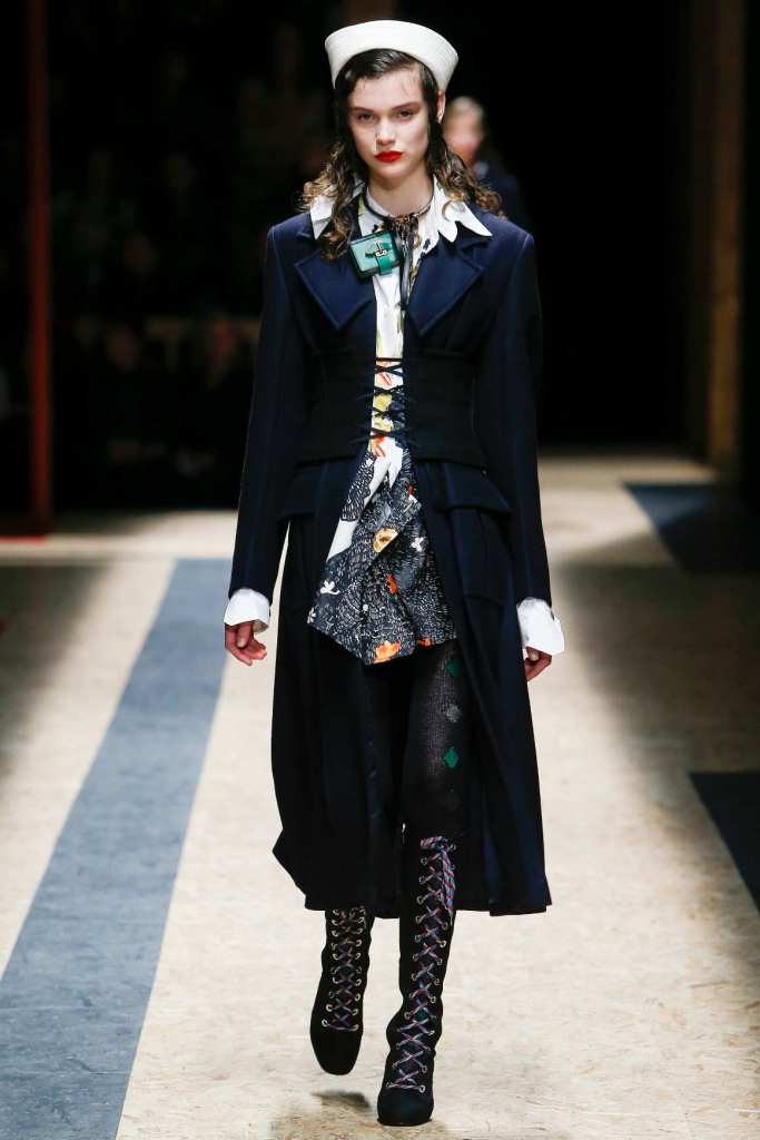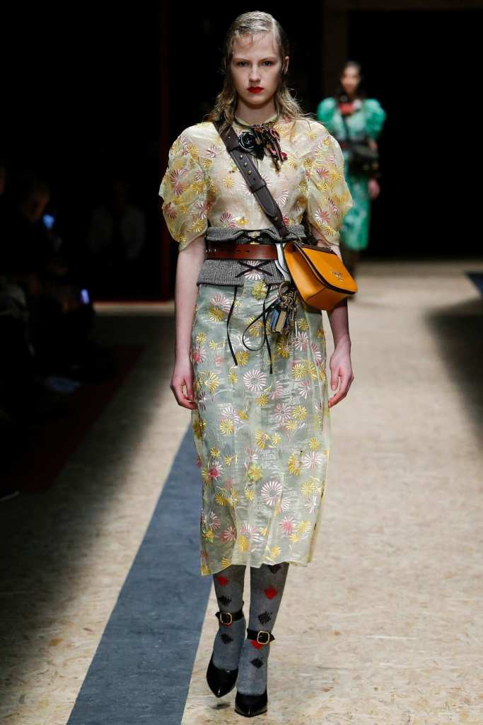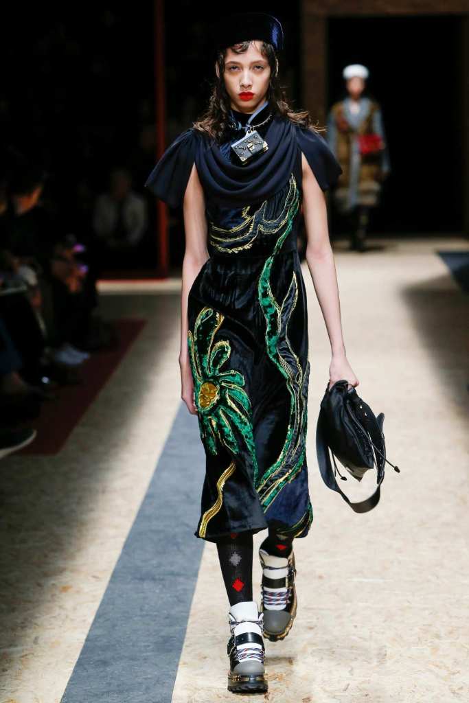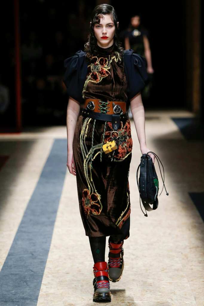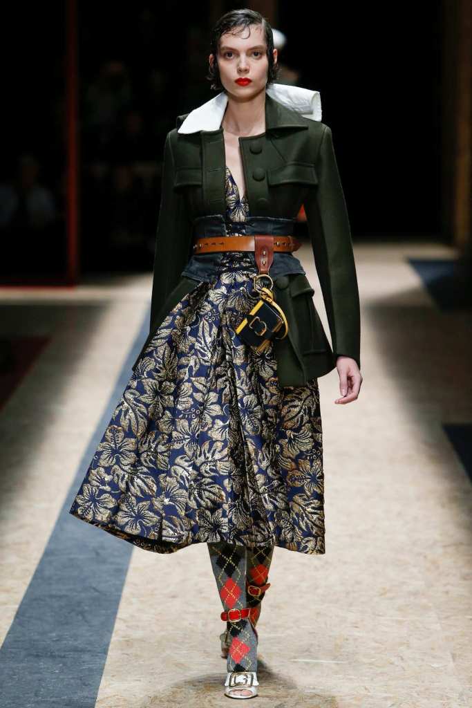 Accessories played a major role, with metallic boots, ankle-wrap flats, and statement collars adding to the collection’s overall impact. Earrings, often large and round like disco balls, added an extra layer of fun to each look. These quirky details made the collection feel both avant-garde and playful, capturing the spirit of the Prada woman—confident, stylish, and never afraid to stand out.