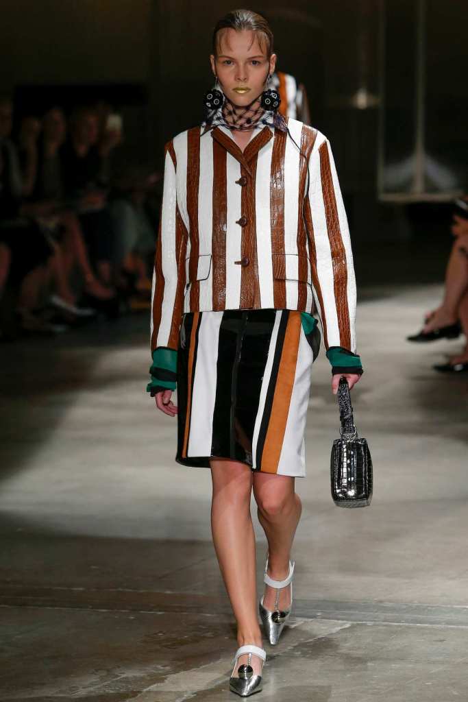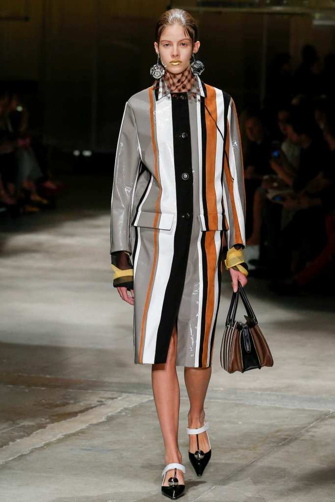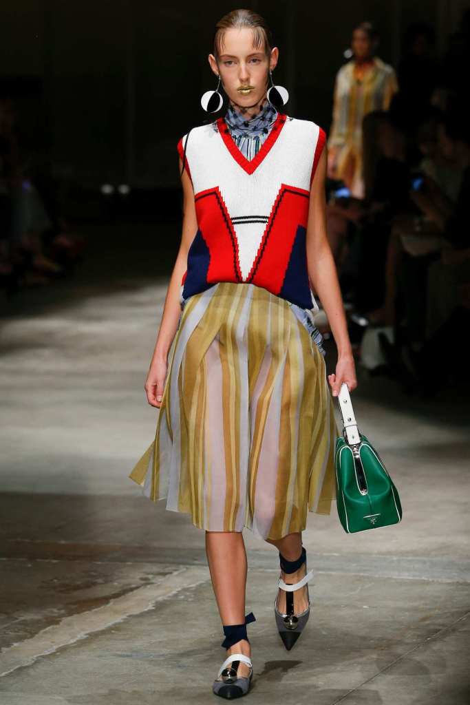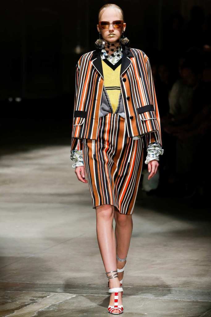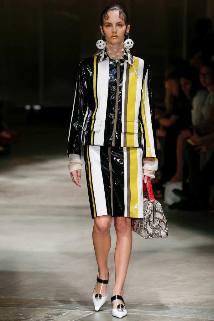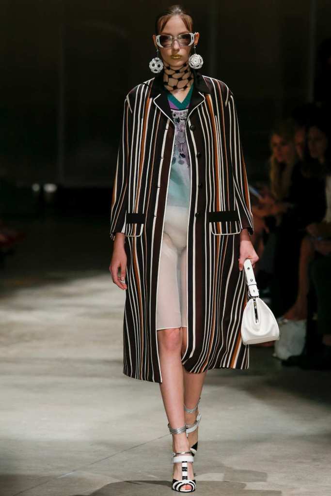 The use of stripes, often seen as a fashion cliché, was elevated in this collection. Prada subverted the pattern with innovative textures like fur and translucent materials, incorporating layers of sheer transparency that gave the stripes a new life. The precision in these designs was remarkable, reminiscent of constructivism and geometric art, where colors and shapes were carefully considered to create a cohesive whole.