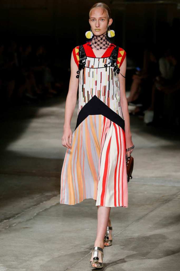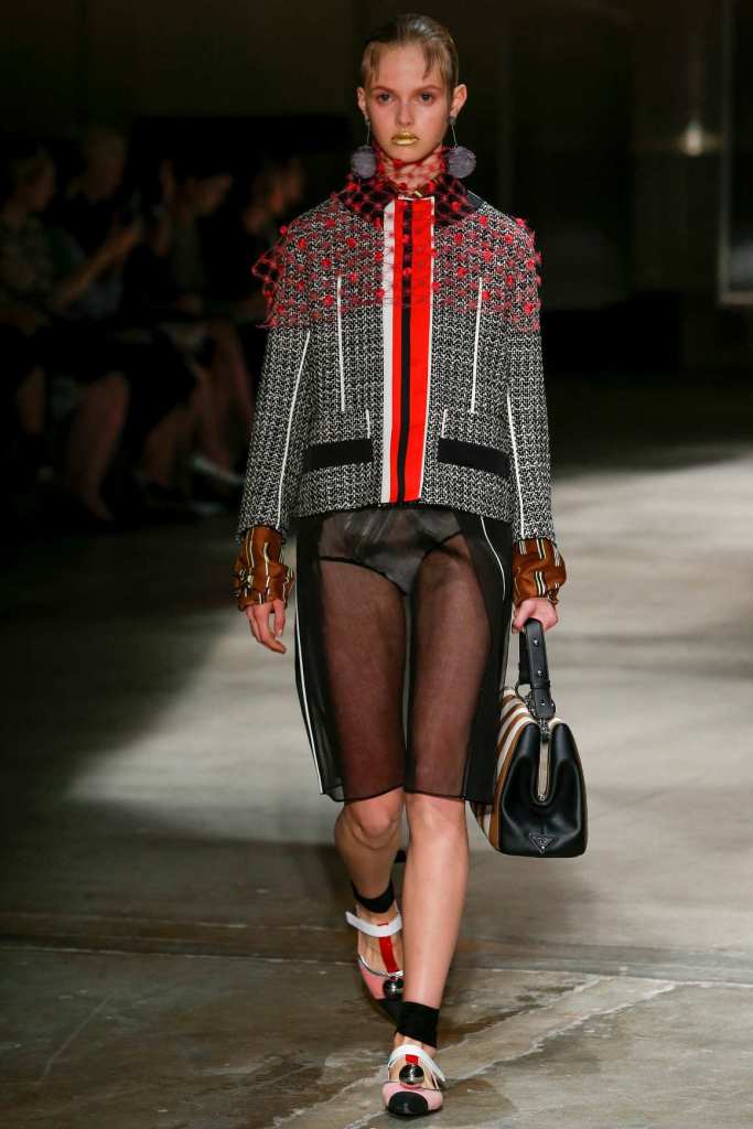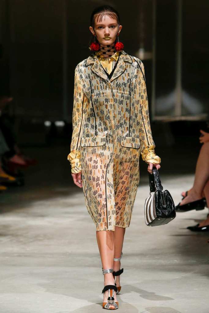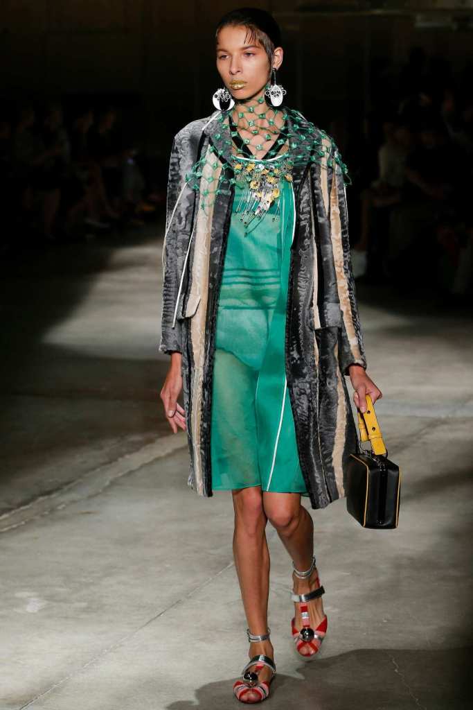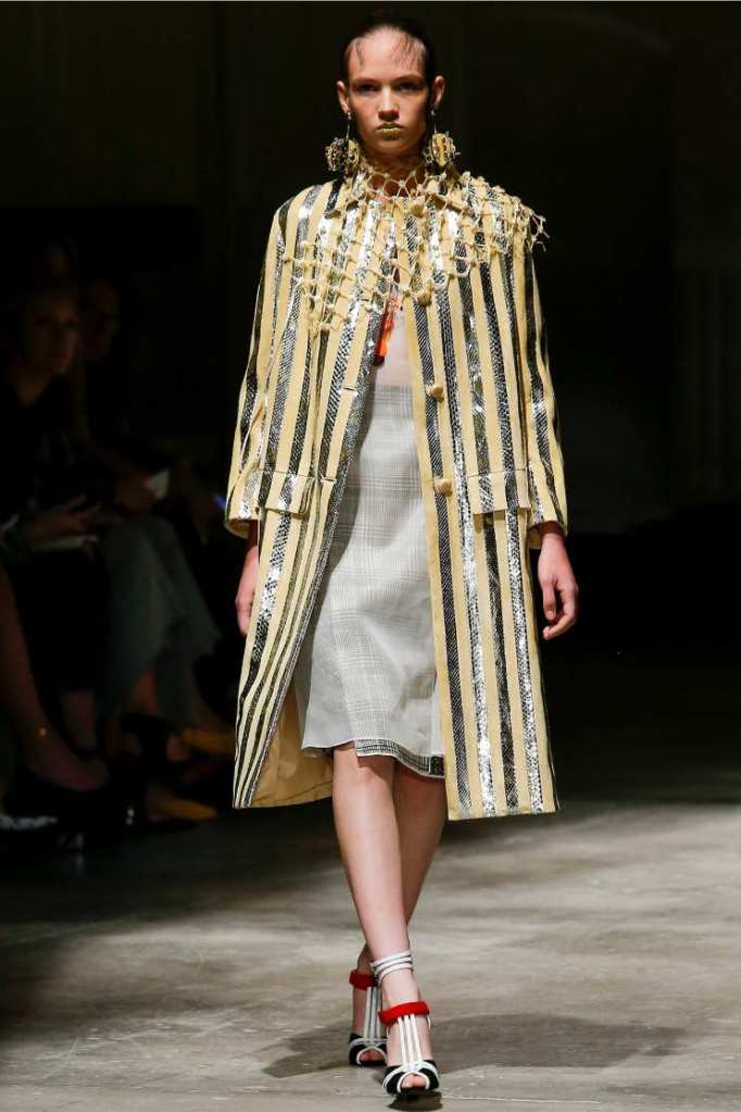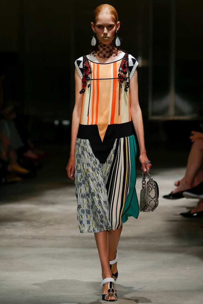 The use of stripes, often seen as a fashion cliché, was elevated in this collection. Prada subverted the pattern with innovative textures like fur and translucent materials, incorporating layers of sheer transparency that gave the stripes a new life. The precision in these designs was remarkable, reminiscent of constructivism and geometric art, where colors and shapes were carefully considered to create a cohesive whole.