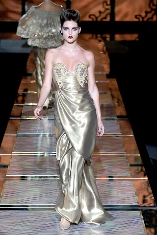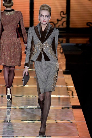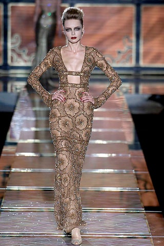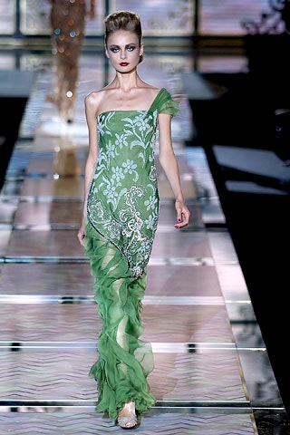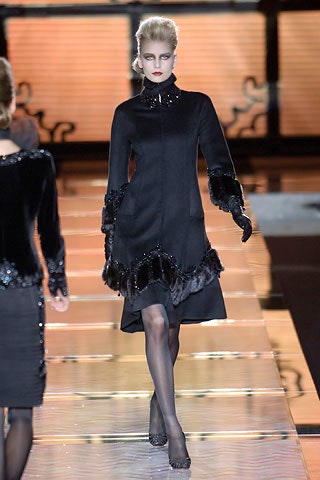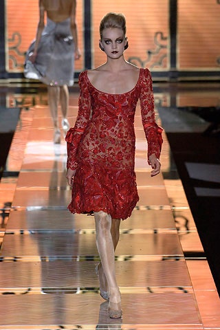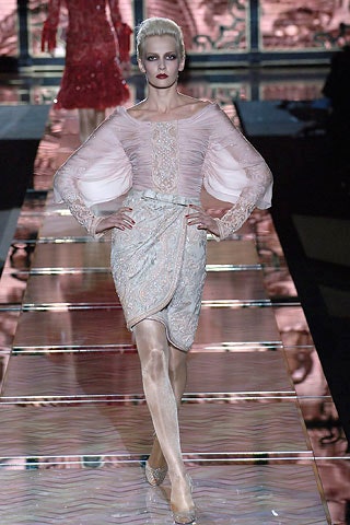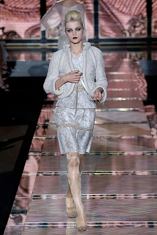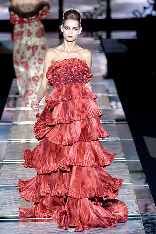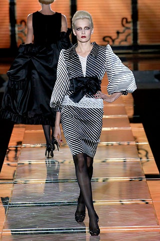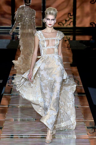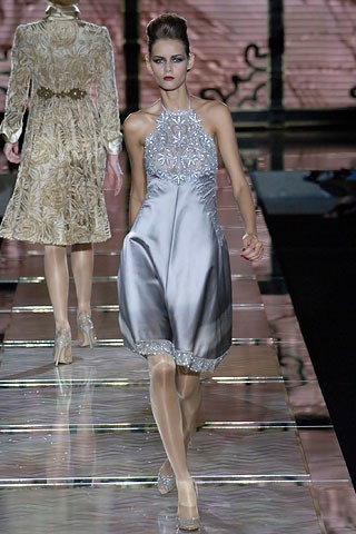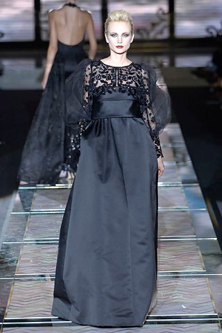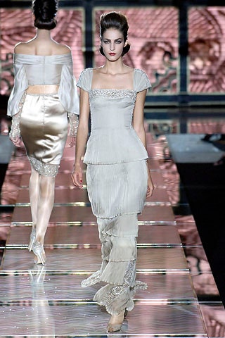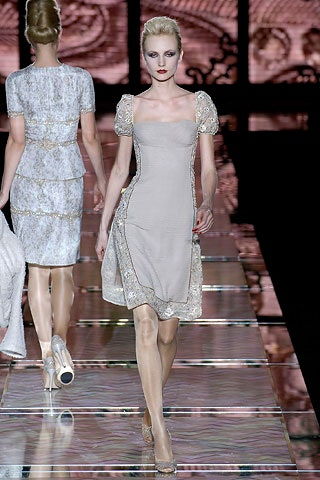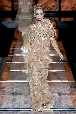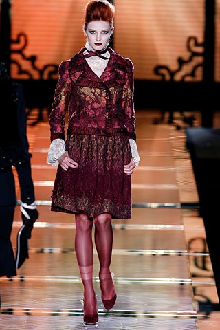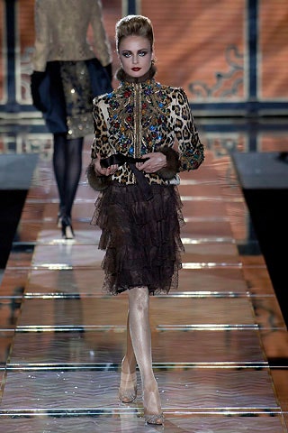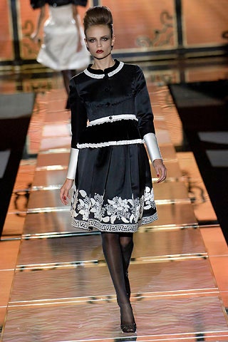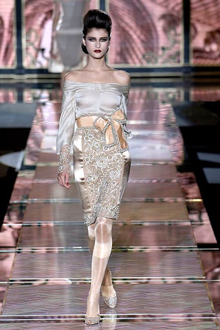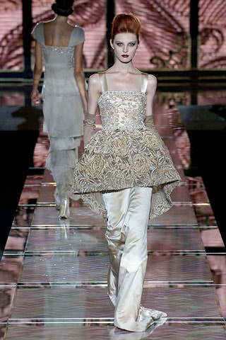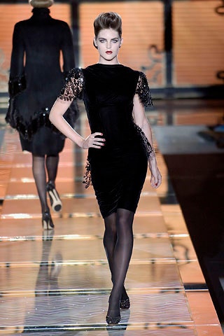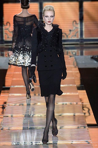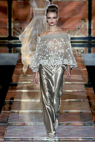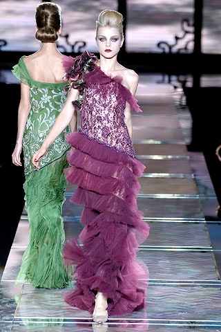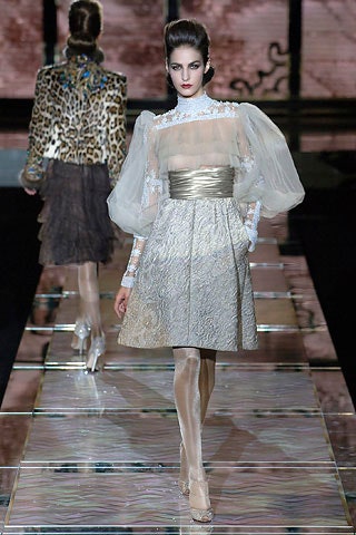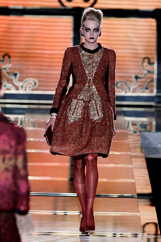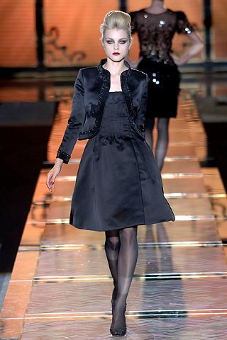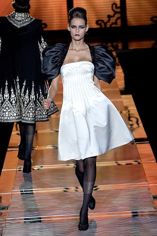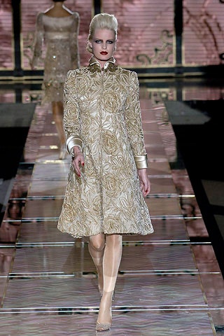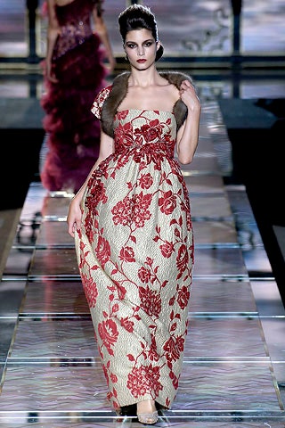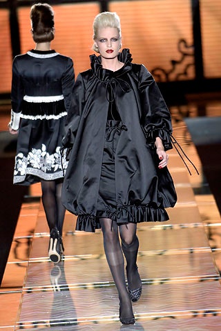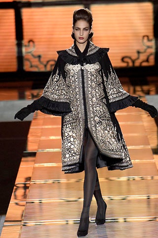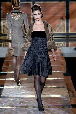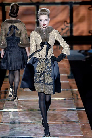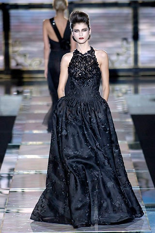 The collection opened with a striking black swing coat featuring folkloric embroidery, followed by stunning pieces like a bubble coat in black duchesse satin, mixing nostalgic fifties style with modern flair. The dresses, from bell-skirted cocktail pieces to exquisite evening gowns, showcased impeccable craftsmanship. The garments use opulent fabrics such as lace, silk, velvet, and tulle; The designs feature exquisite embroidery, beadwork,fur and metallic accents.