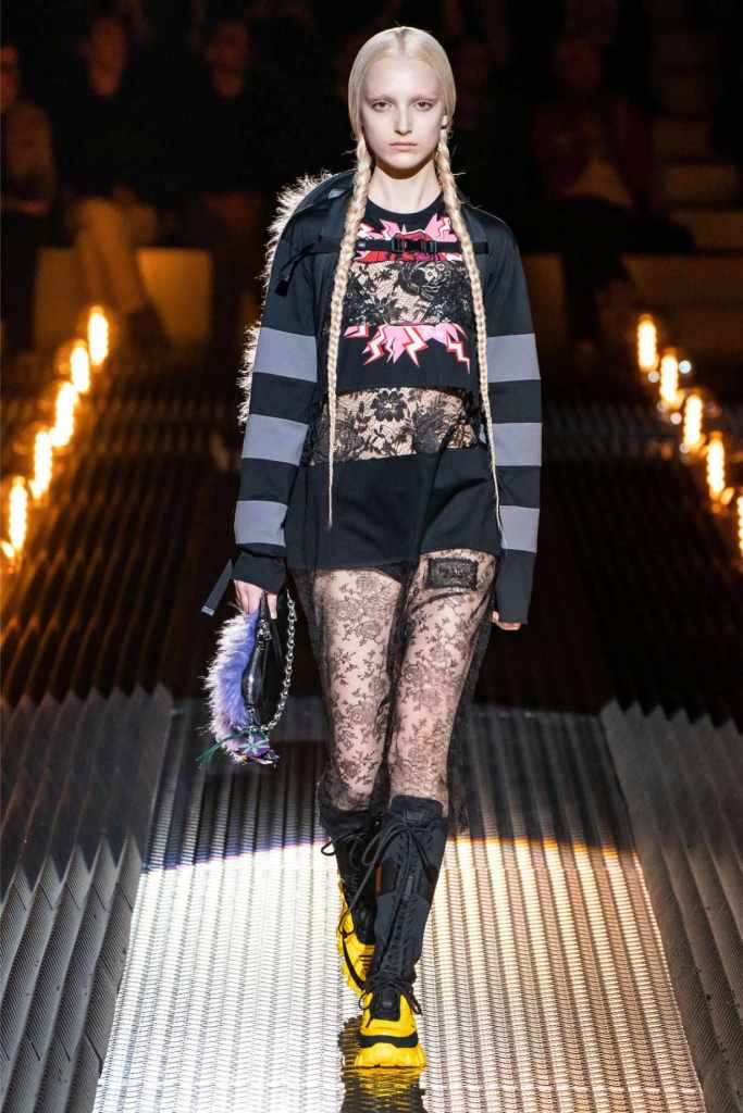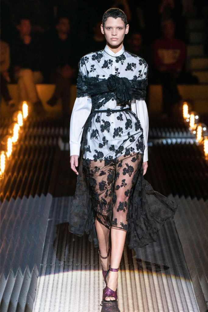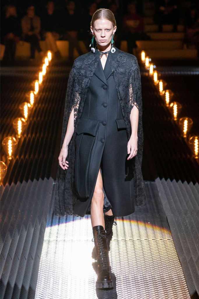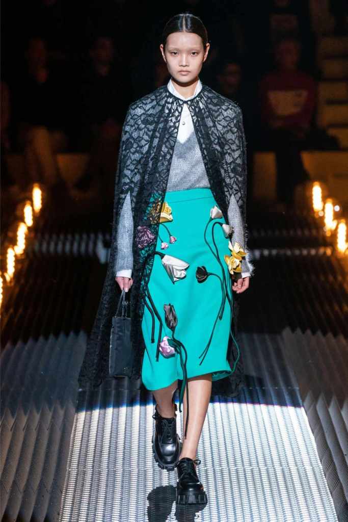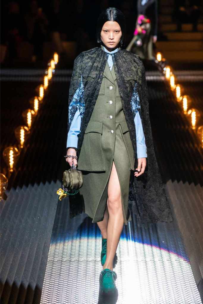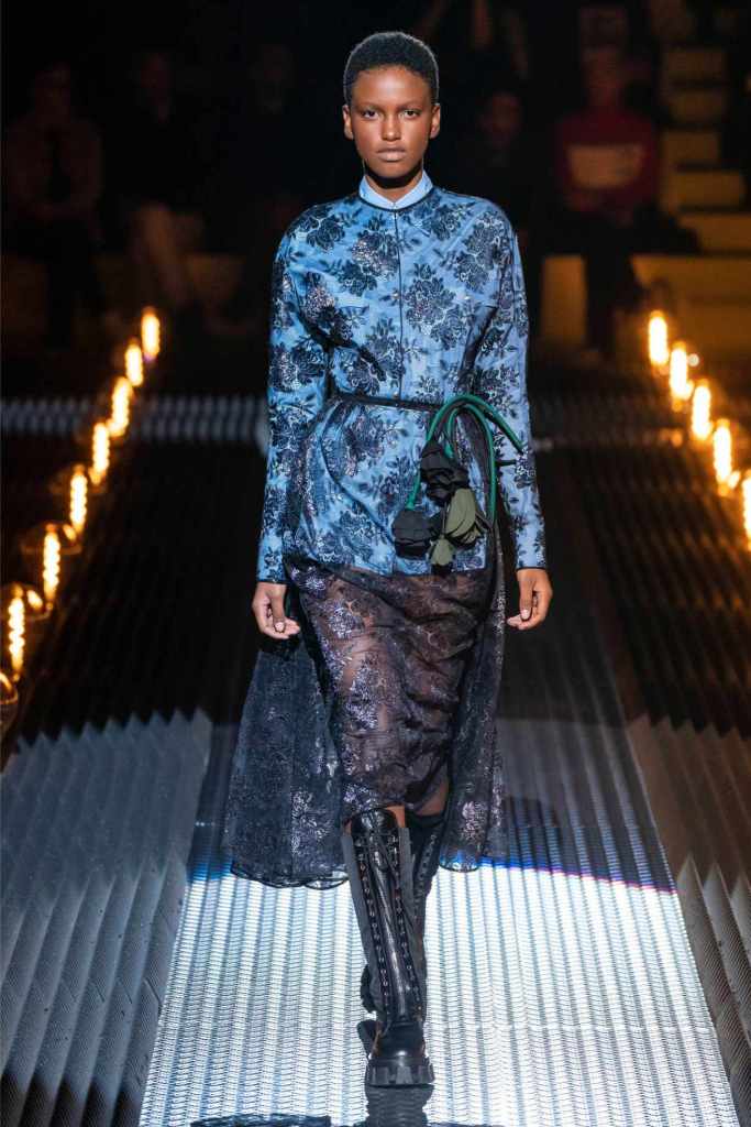 This was an exploration of contrasts, blending romance with darkness, softness with edge, and utilitarian grit with delicate beauty. Drawing inspiration from Mary Shelley’s Frankenstein—a theme she began with her menswear collection—Prada took us on a journey through the “Anatomy of Romance,” creating a world where love and fear coexist in every stitch and seam.