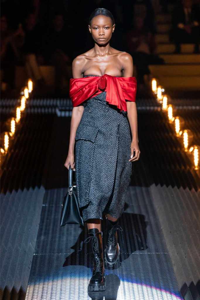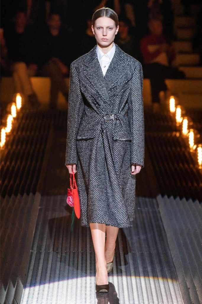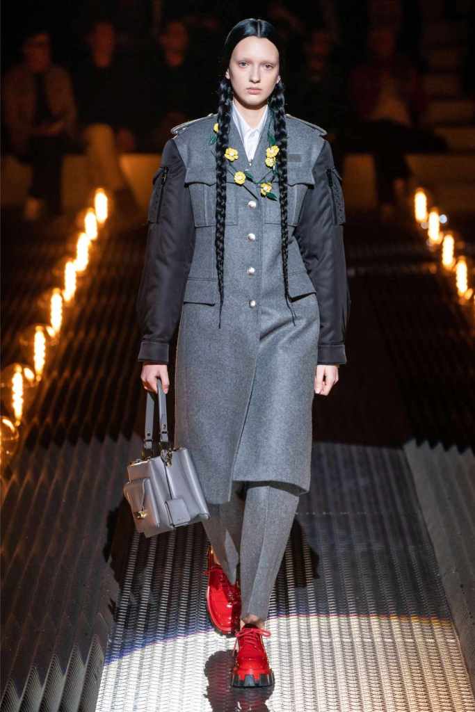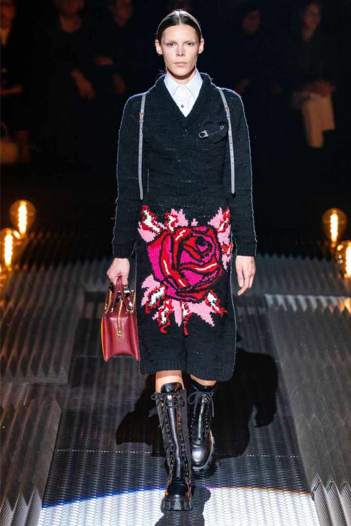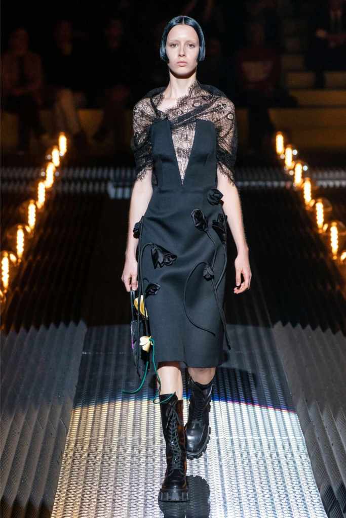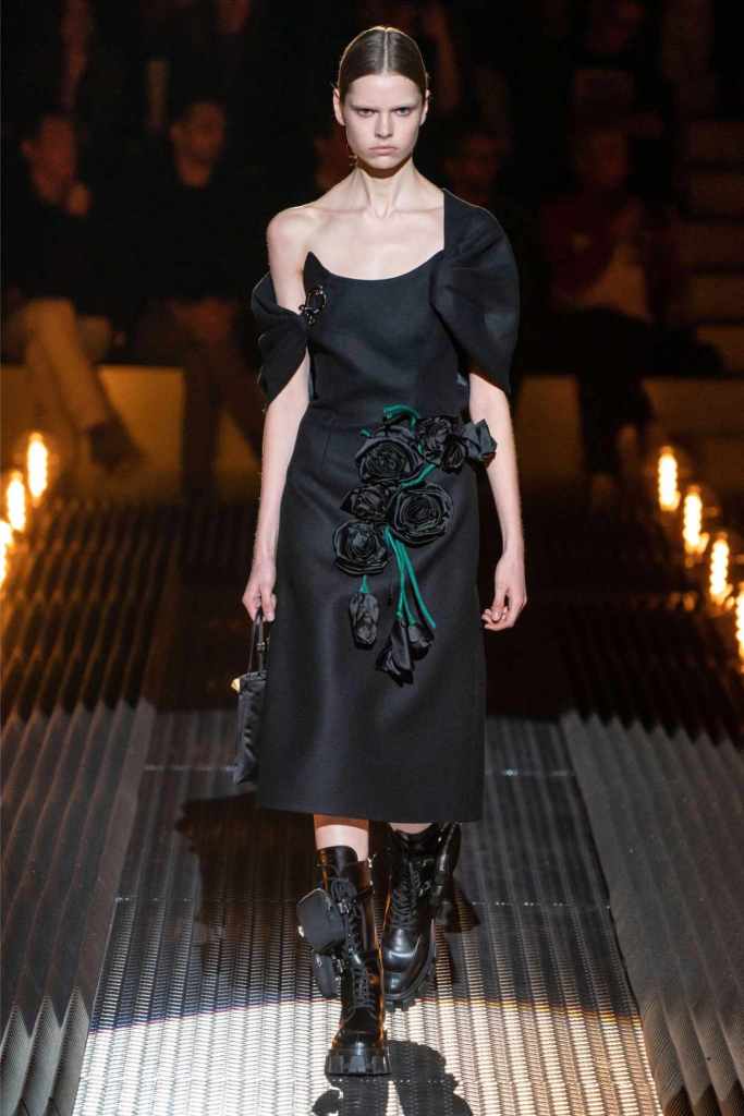 Prada’s hallmark ability to combine opposing ideas shone throughout. Romantic details like lace, rosettes, and glittery red shoes were juxtaposed with military-inspired jackets, chunky boots, and structured cuts. Standout looks included an off-the-shoulder wool party dress with oversized pockets and a slouchy black trouser suit cinched with a masculine clasp. The addition of 3D roses—wilted, as if touched by time—symbolized love’s fragility and endurance.