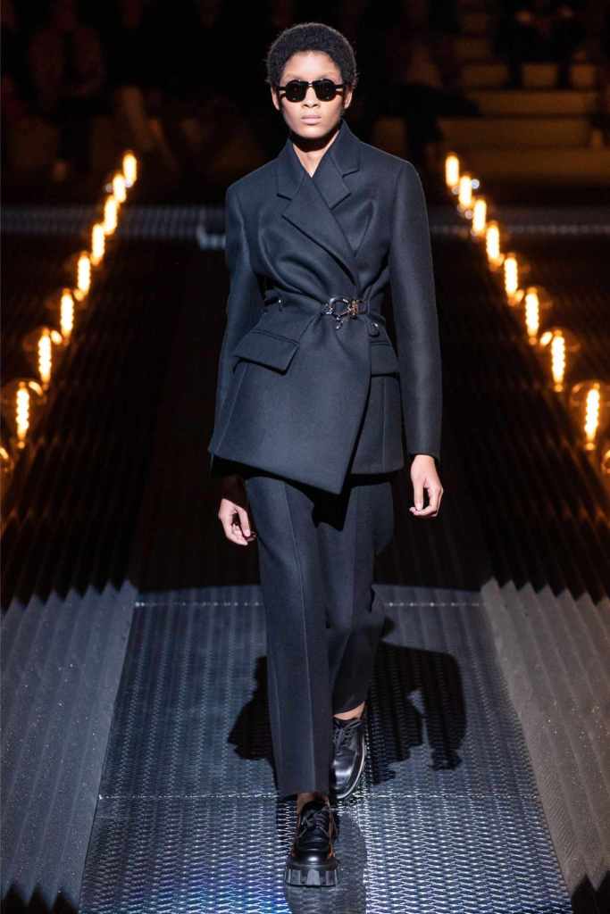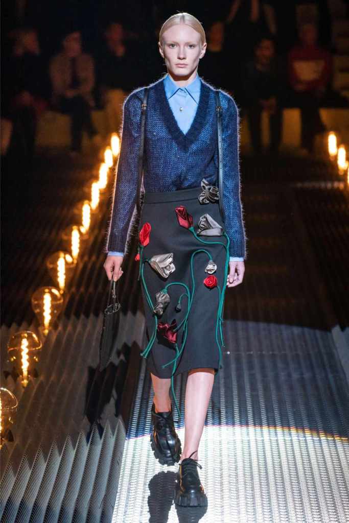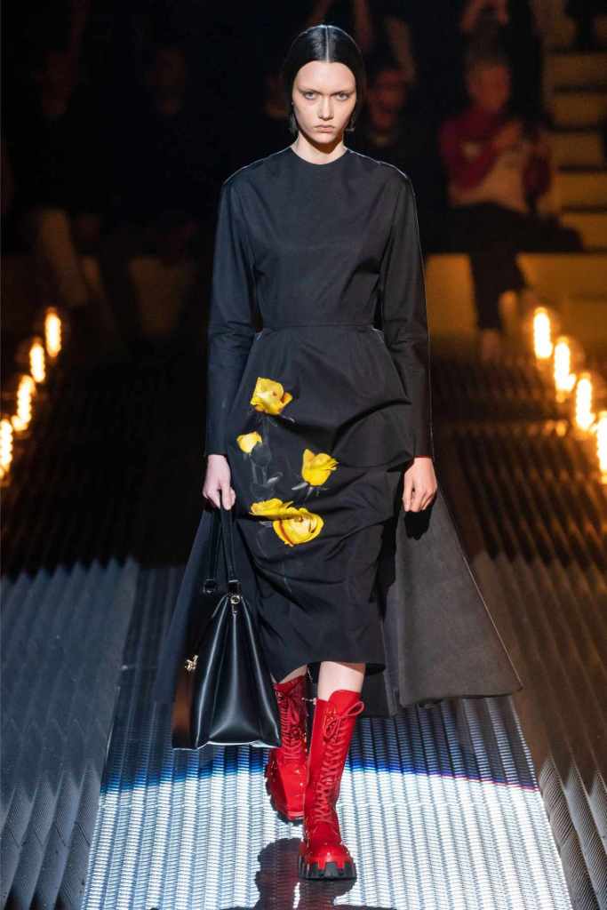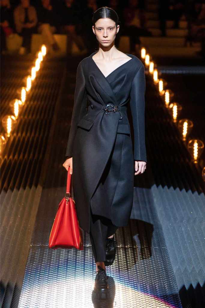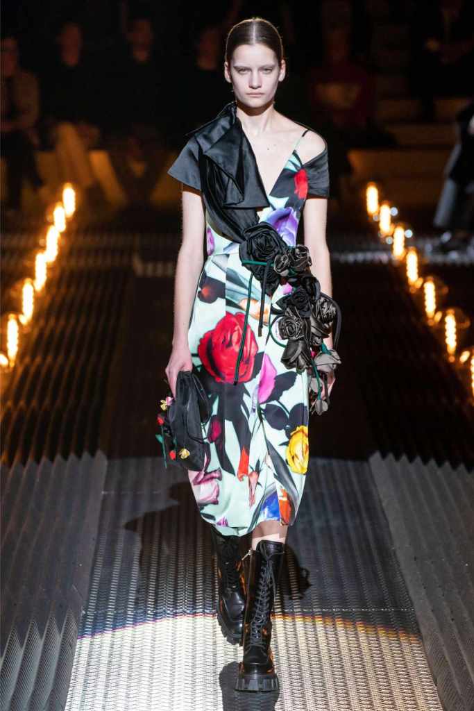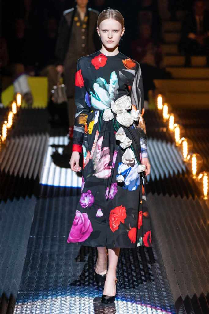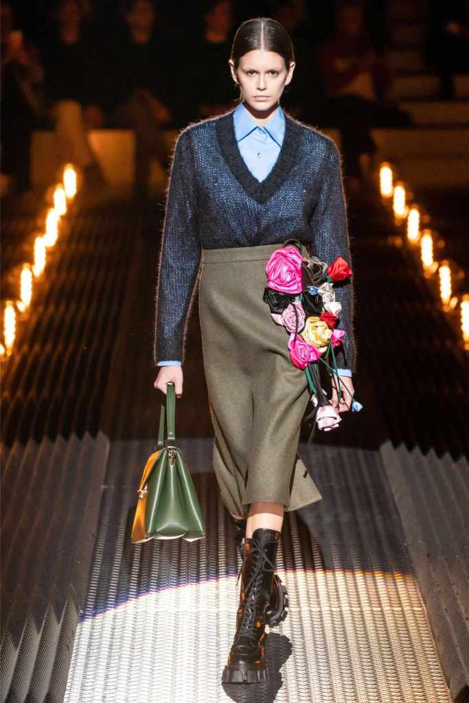 Prada’s hallmark ability to combine opposing ideas shone throughout. Romantic details like lace, rosettes, and glittery red shoes were juxtaposed with military-inspired jackets, chunky boots, and structured cuts. Standout looks included an off-the-shoulder wool party dress with oversized pockets and a slouchy black trouser suit cinched with a masculine clasp. The addition of 3D roses—wilted, as if touched by time—symbolized love’s fragility and endurance.