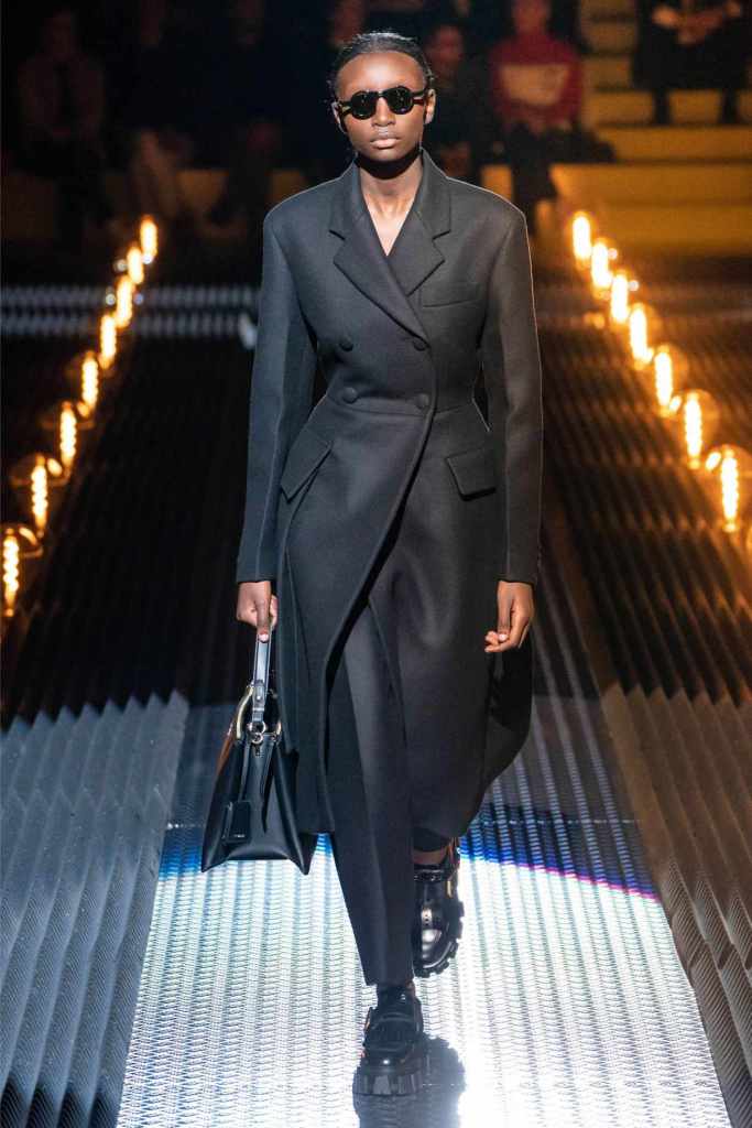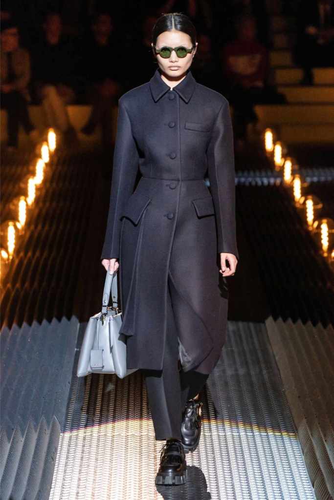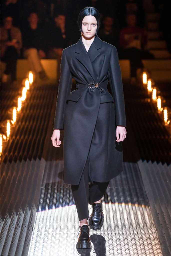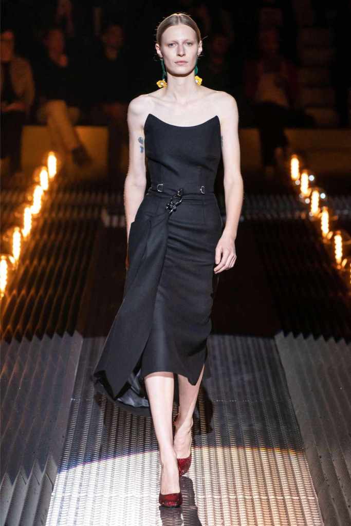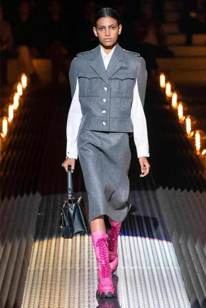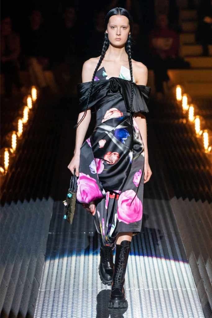 Prada’s hallmark ability to combine opposing ideas shone throughout. Romantic details like lace, rosettes, and glittery red shoes were juxtaposed with military-inspired jackets, chunky boots, and structured cuts. Standout looks included an off-the-shoulder wool party dress with oversized pockets and a slouchy black trouser suit cinched with a masculine clasp. The addition of 3D roses—wilted, as if touched by time—symbolized love’s fragility and endurance.