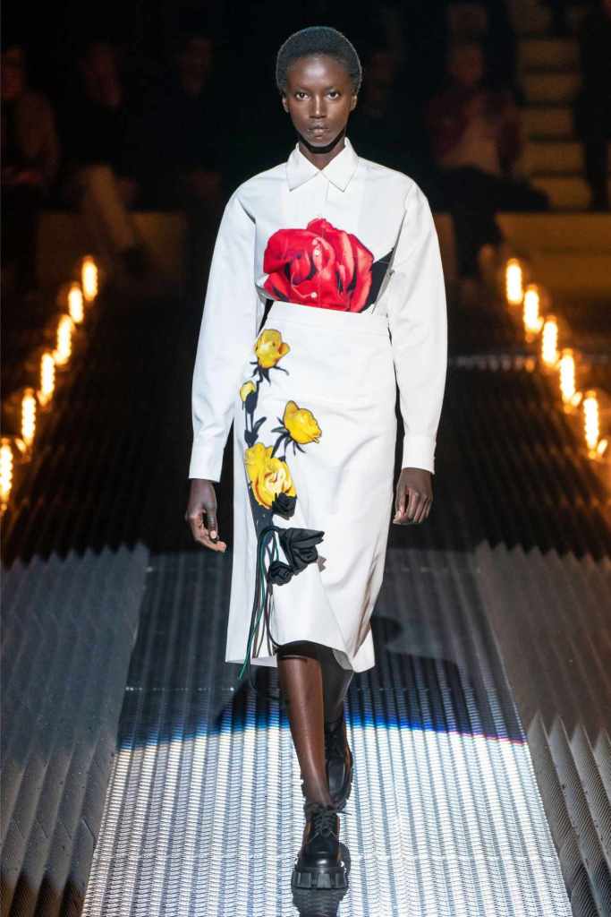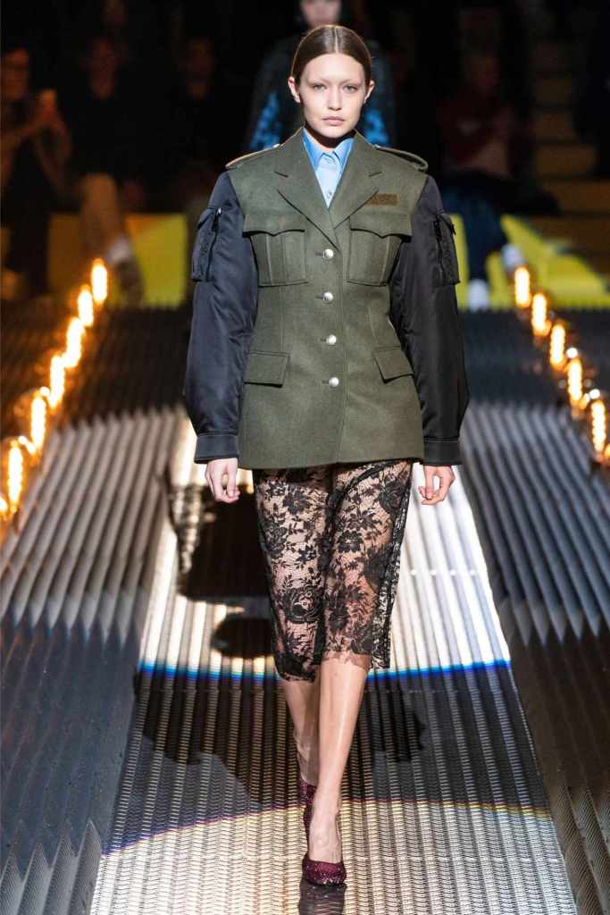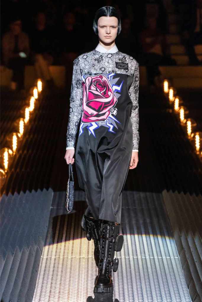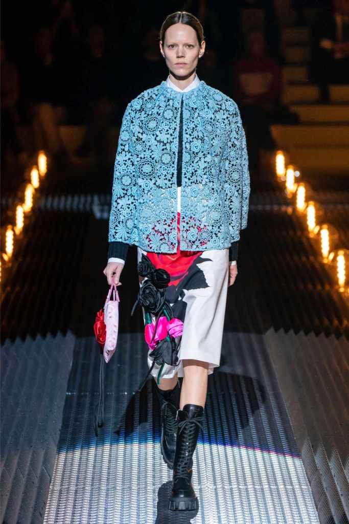 Fear exists in love because it thrives on vulnerability—the risk of loss, the weight of longing—but it is this same vulnerability that makes love extraordinary. Prada’s juxtaposition of delicate lace with rugged military jackets, or wilting roses with structured cuts, celebrates this tension. Instead of fleeing from it, the collection invites us to embrace the duality, finding beauty in fragility and strength in fear.