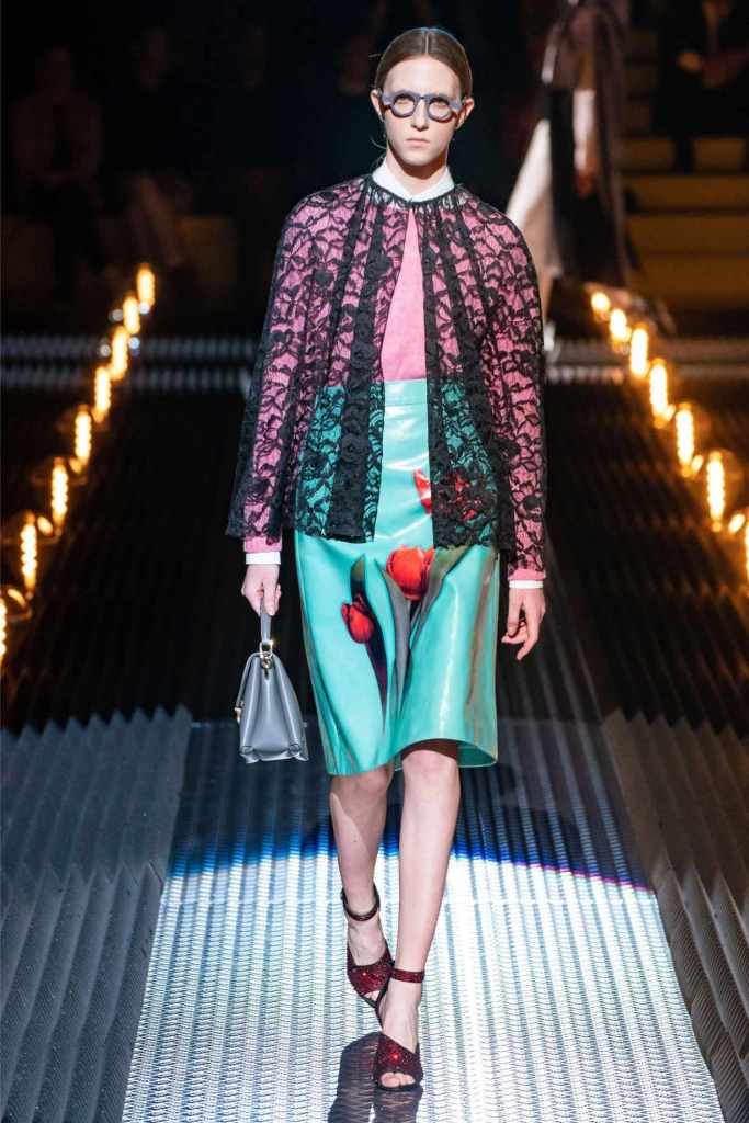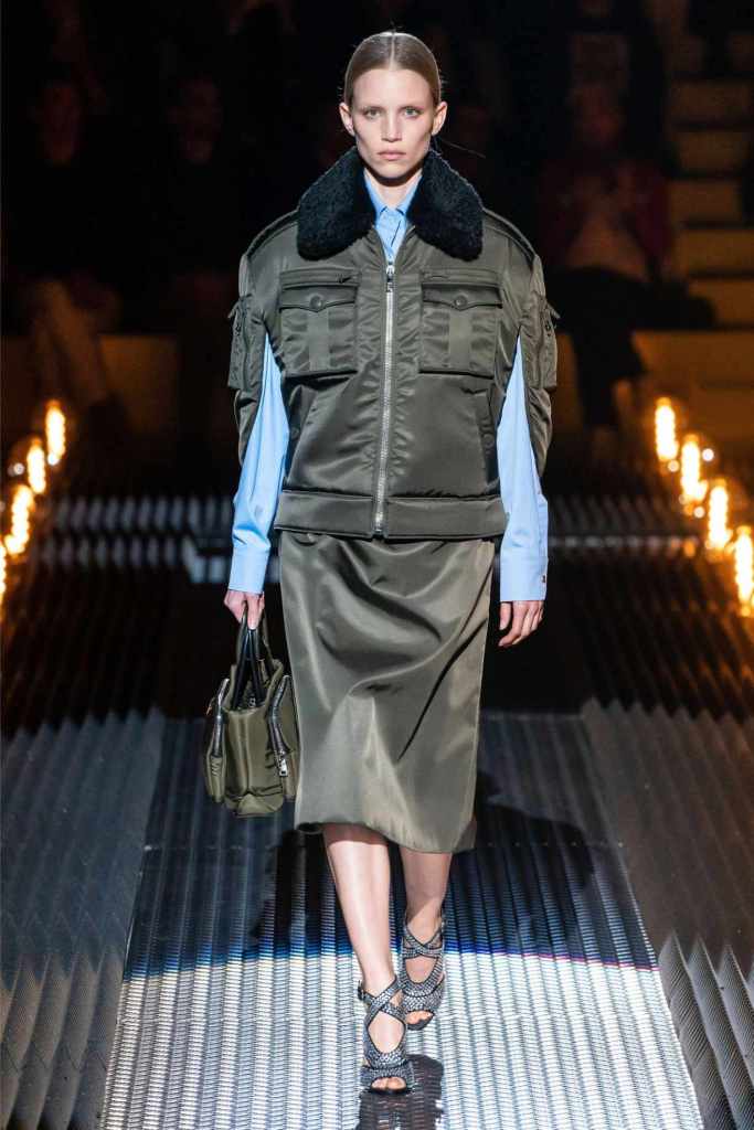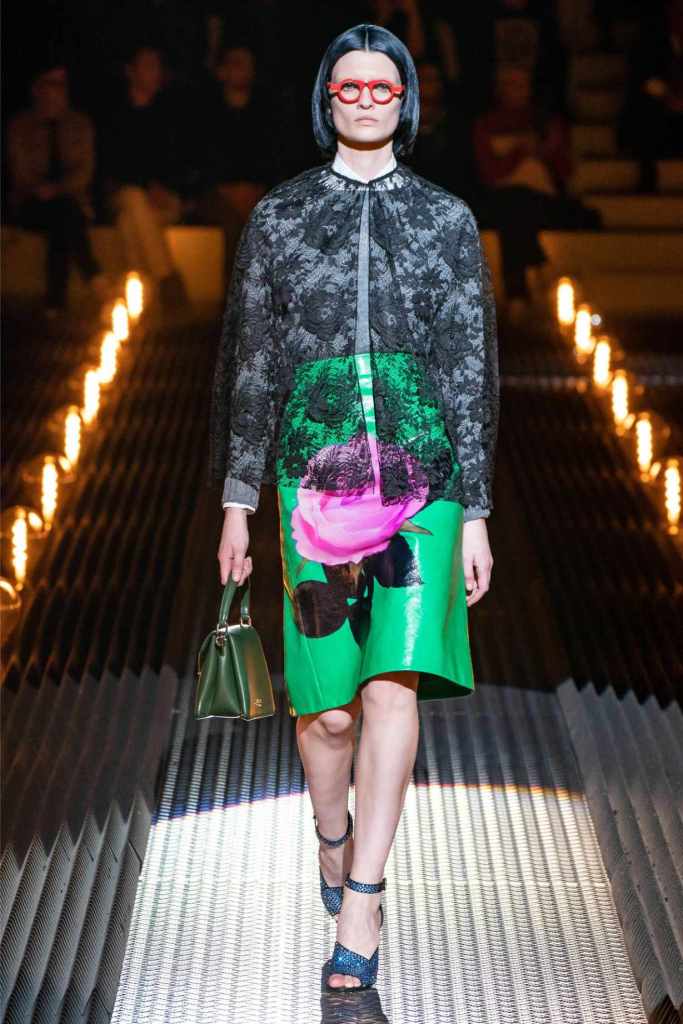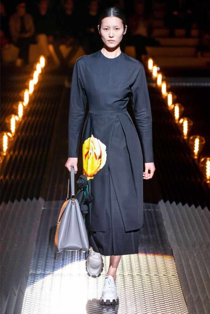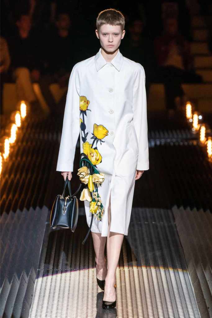 Accessories were quintessential Prada. Frame purses, satin handbags, and clunky loafers with gold buckles offered commercial appeal, while lightning bolt-adorned pumps and floral earrings added a touch of whimsy. The Linea Rossa pieces, with their sport-meets-military vibe, ensured something for the everyday wardrobe.