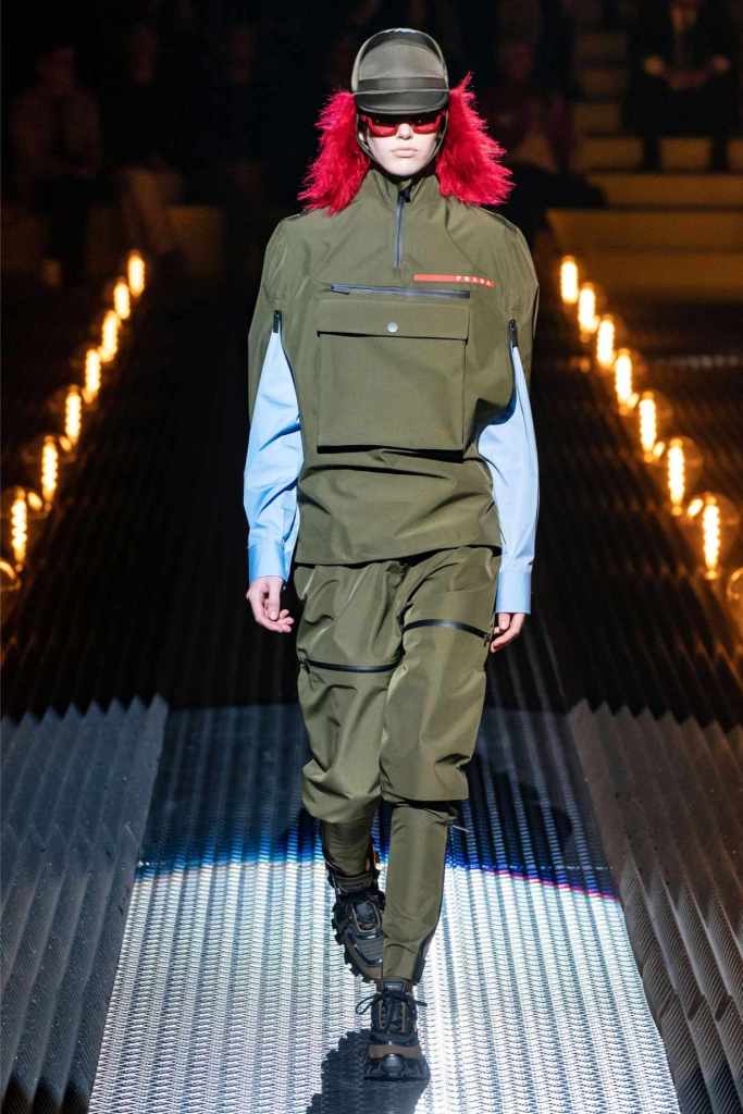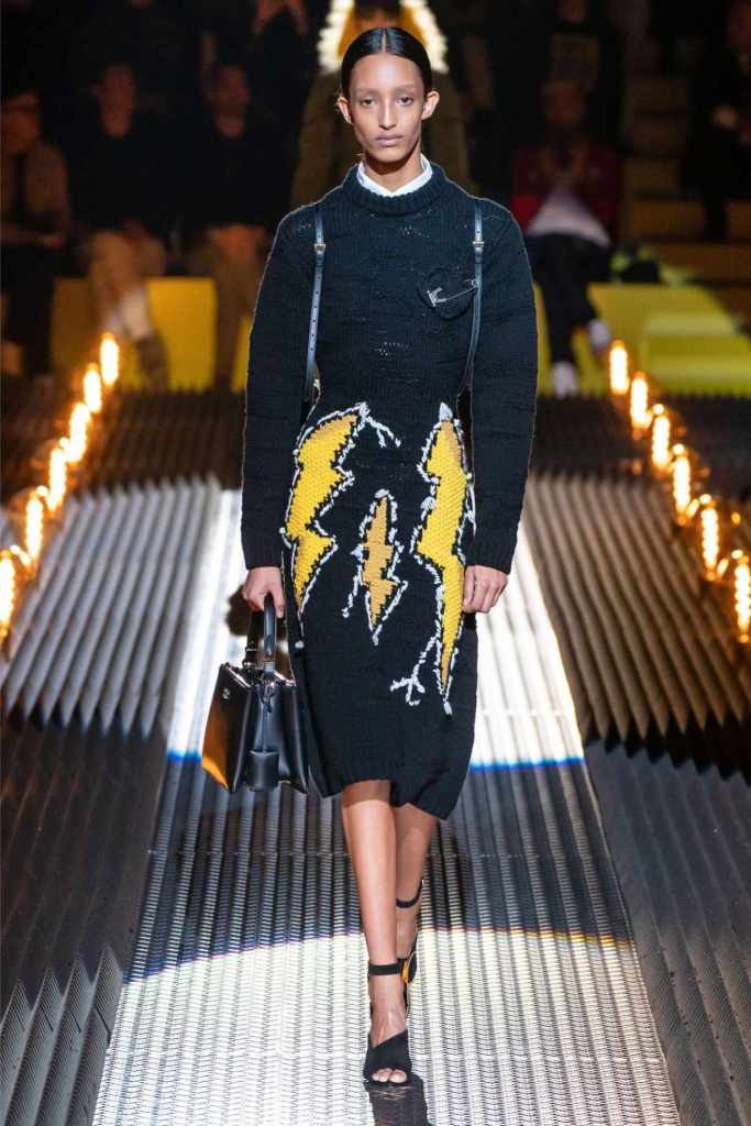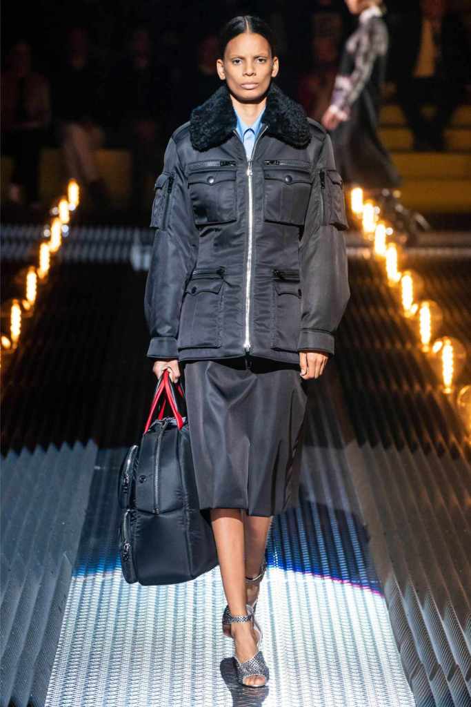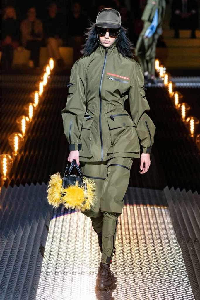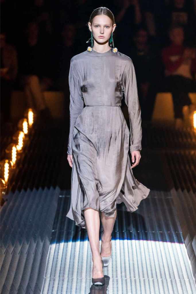 Accessories were quintessential Prada. Frame purses, satin handbags, and clunky loafers with gold buckles offered commercial appeal, while lightning bolt-adorned pumps and floral earrings added a touch of whimsy. The Linea Rossa pieces, with their sport-meets-military vibe, ensured something for the everyday wardrobe.