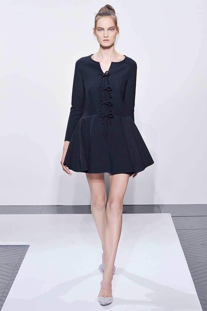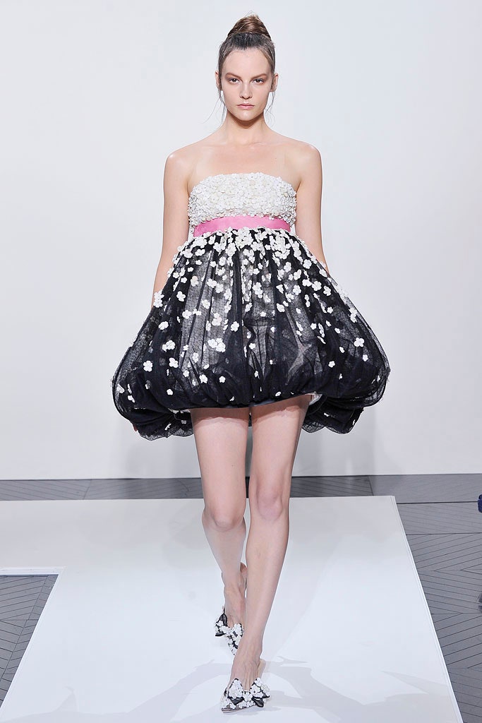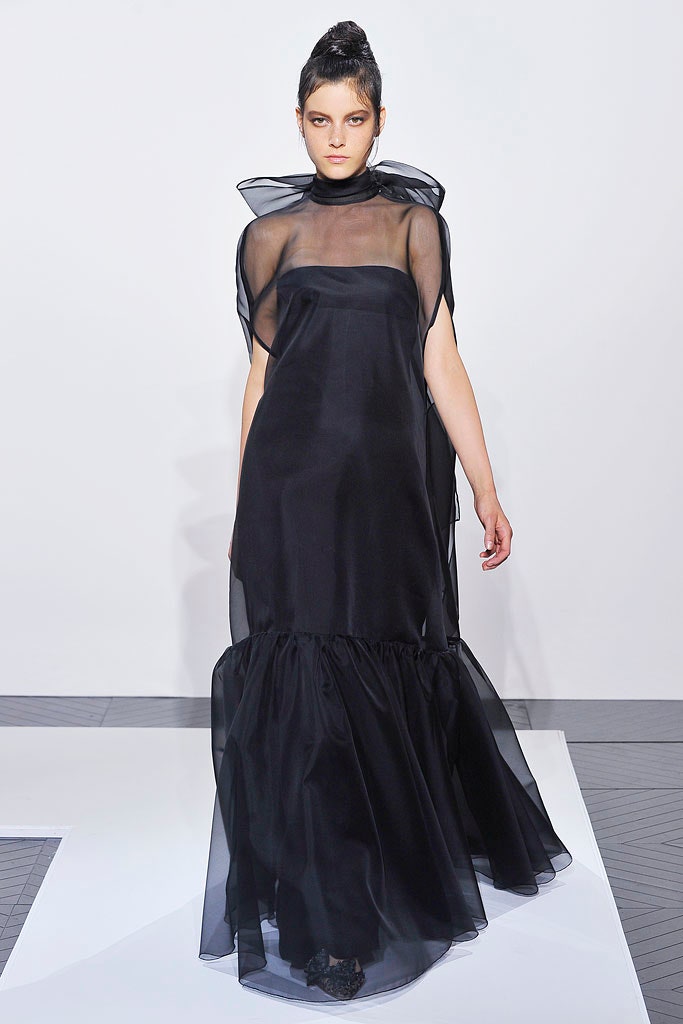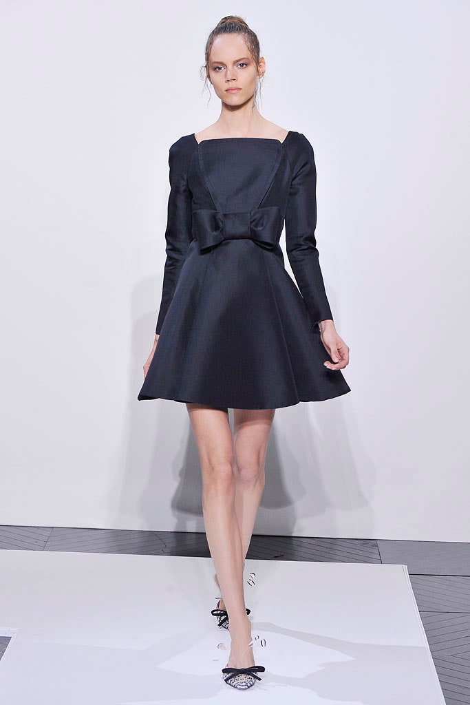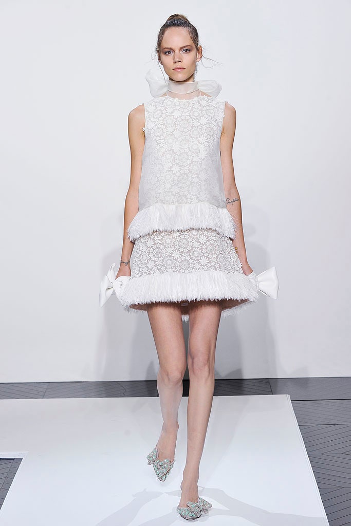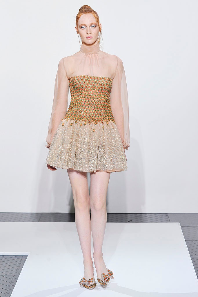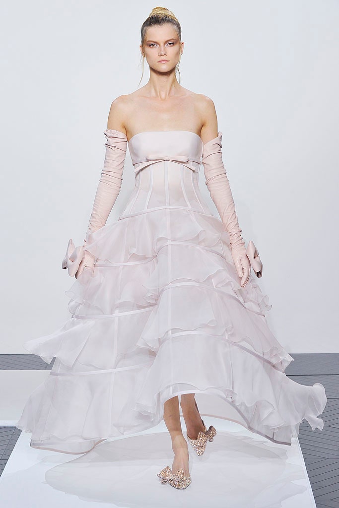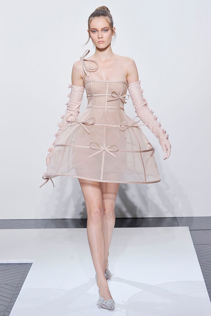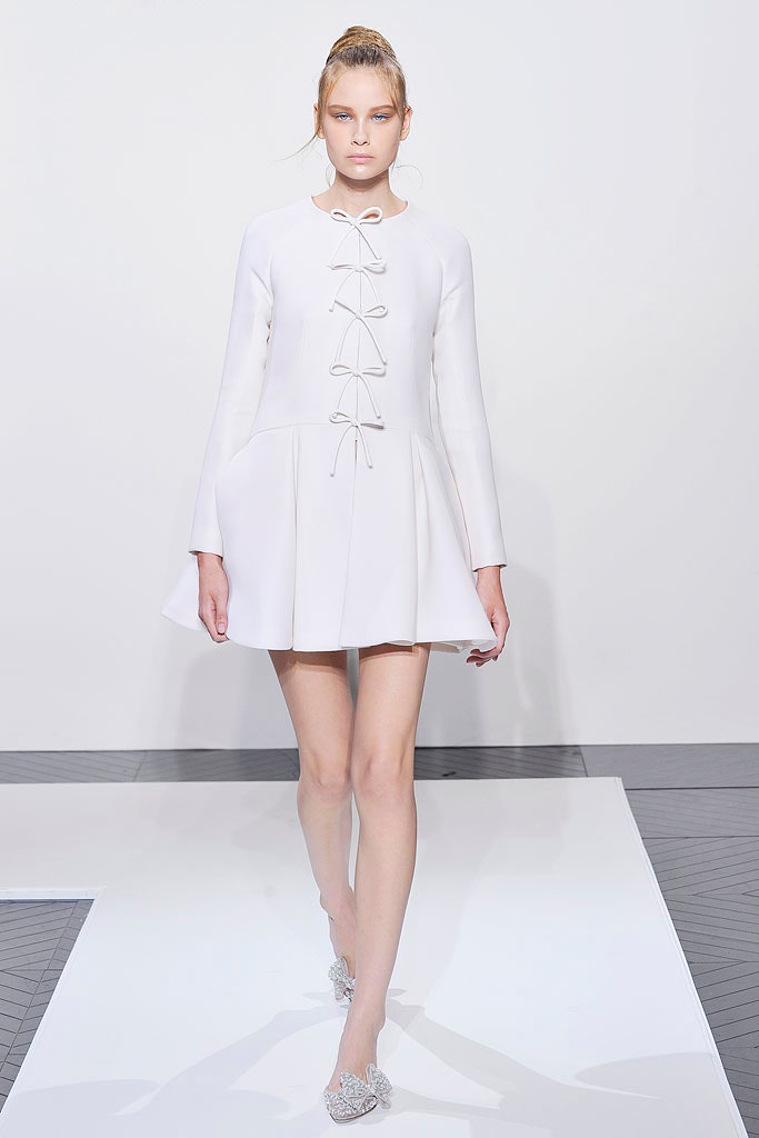 The reimagined Valentino collection takes a playful, youthful turn, with its Lolita-inspired dolly bird aesthetic. Featuring short skirts, dropped waists, and baby-doll silhouettes, the collection is undeniably fun, embracing bold shapes and preppy energy. The pieces exude “pretty couture” energy, with every look showcasing a whimsical, statement-making element. However, while the clothes are beautiful, they feel perhaps too youthful for a couture line. It’s an interesting departure from Valentino’s usual lines, but the collection falls short in delivering the wow factor. Maria Grazia Chiuri and Pier Paolo Piccioli’s focus on ultrashort, sometimes high-waisted baby-doll shapes is smart, but the collection leans heavily on dropped waistlines and bows, making it feel a bit bland. The collection feels almost infantilizing, but not to a fault.