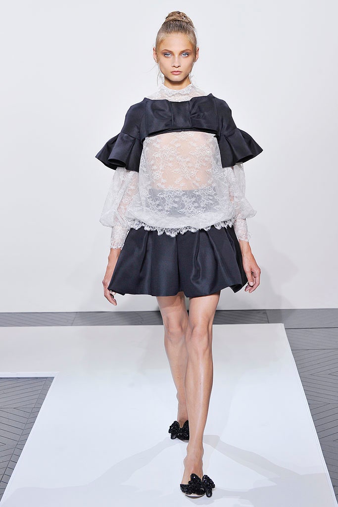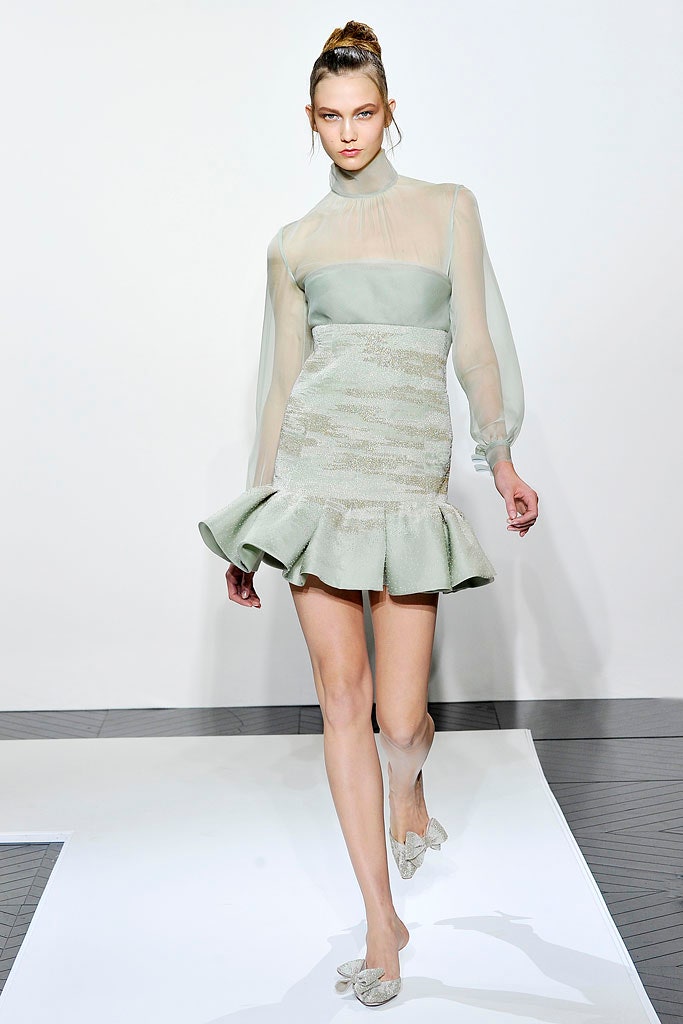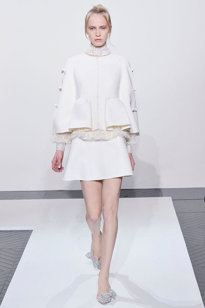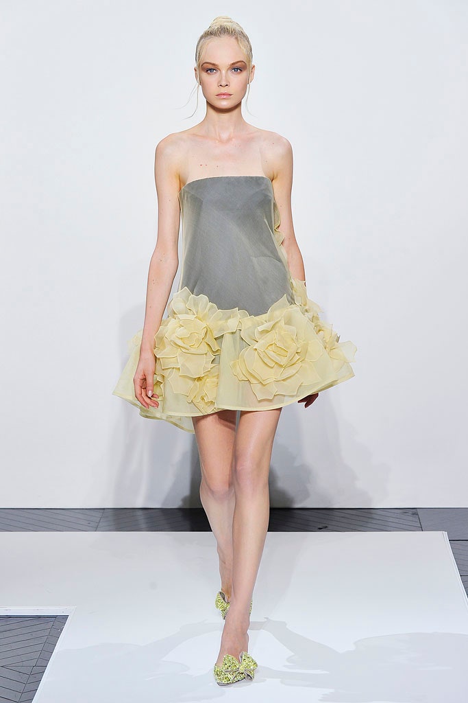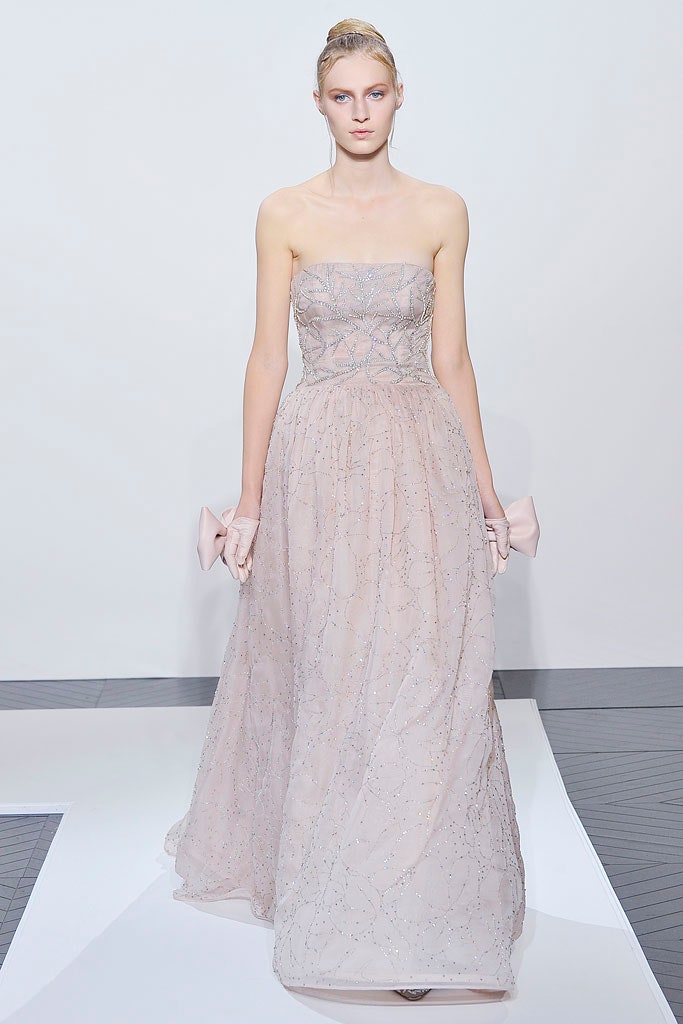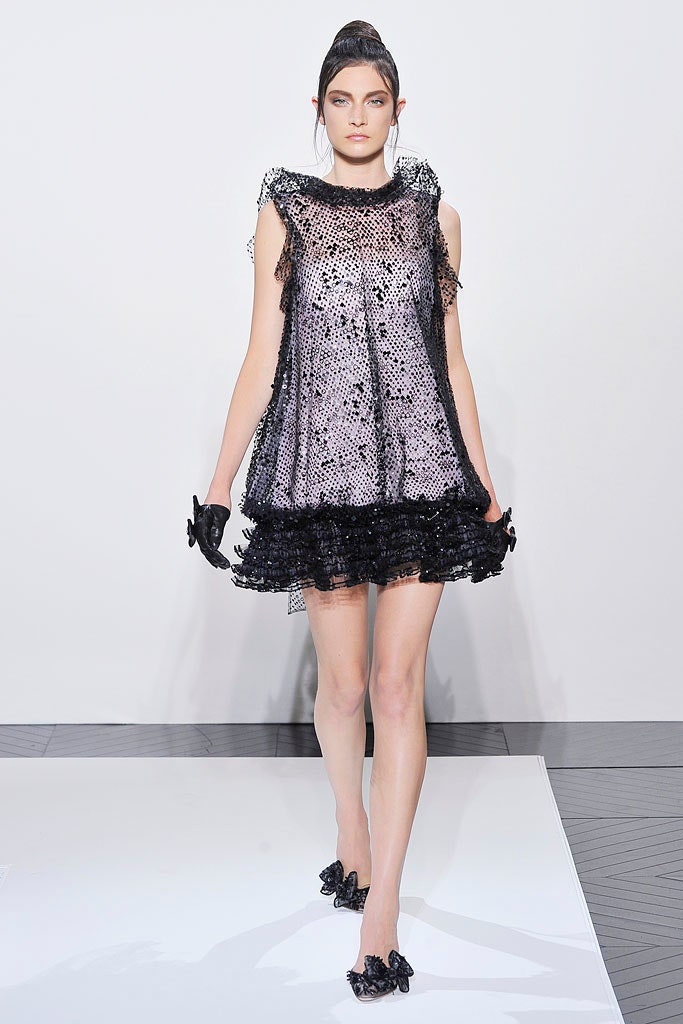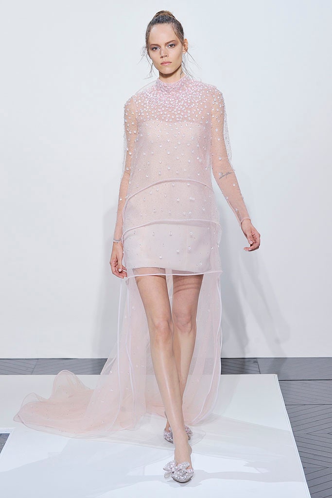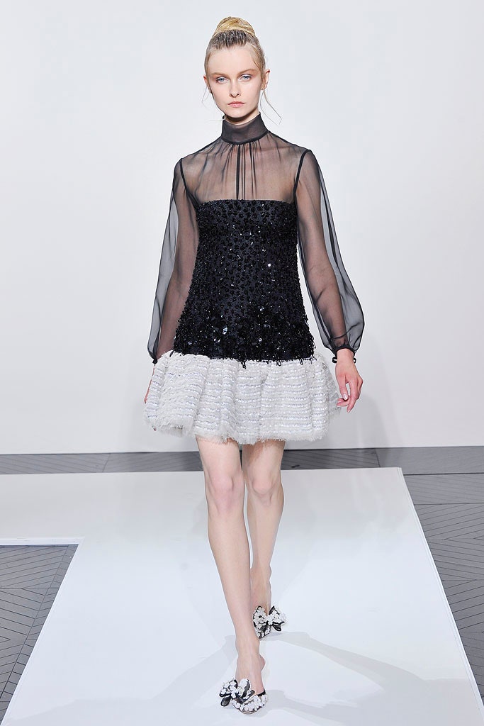 The reimagined Valentino collection takes a playful, youthful turn, with its Lolita-inspired dolly bird aesthetic. Featuring short skirts, dropped waists, and baby-doll silhouettes, the collection is undeniably fun, embracing bold shapes and preppy energy. The pieces exude “pretty couture” energy, with every look showcasing a whimsical, statement-making element. However, while the clothes are beautiful, they feel perhaps too youthful for a couture line. It’s an interesting departure from Valentino’s usual lines, but the collection falls short in delivering the wow factor. Maria Grazia Chiuri and Pier Paolo Piccioli’s focus on ultrashort, sometimes high-waisted baby-doll shapes is smart, but the collection leans heavily on dropped waistlines and bows, making it feel a bit bland. The collection feels almost infantilizing, but not to a fault.